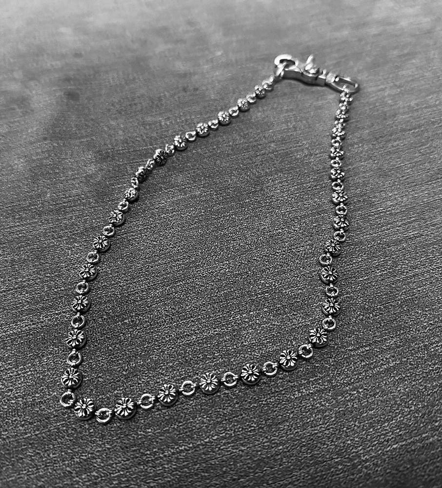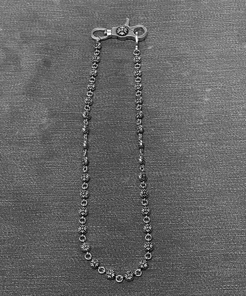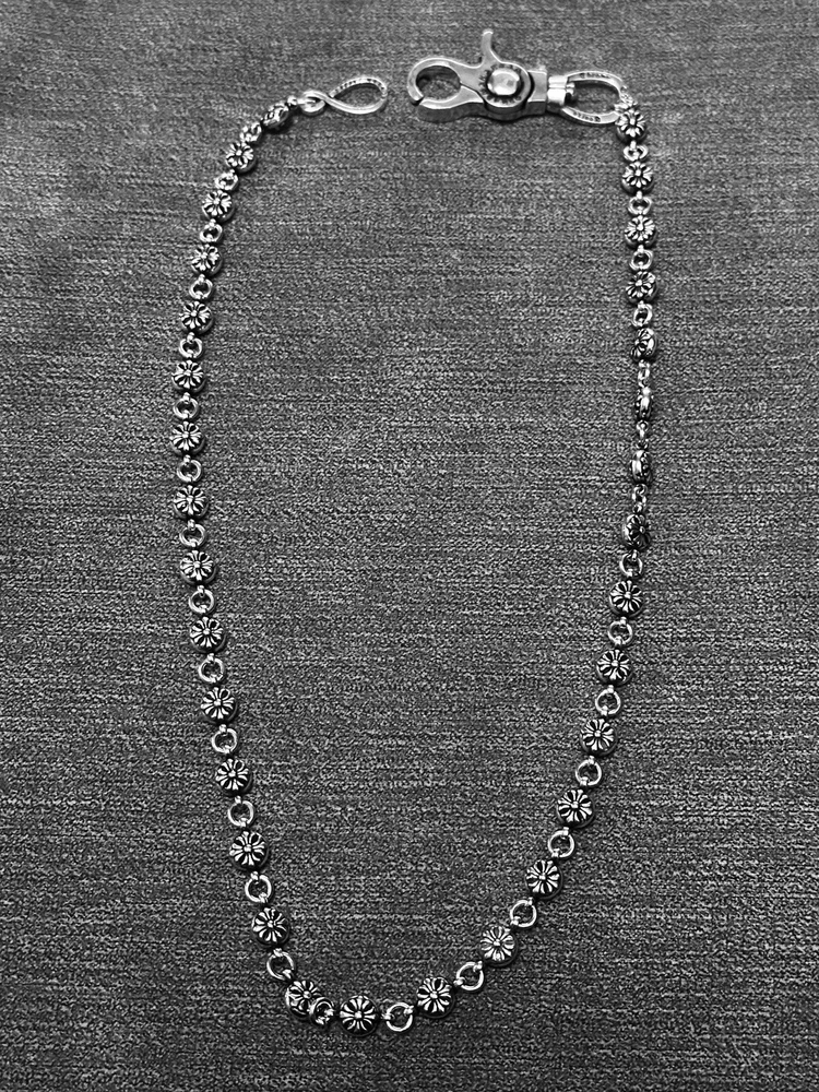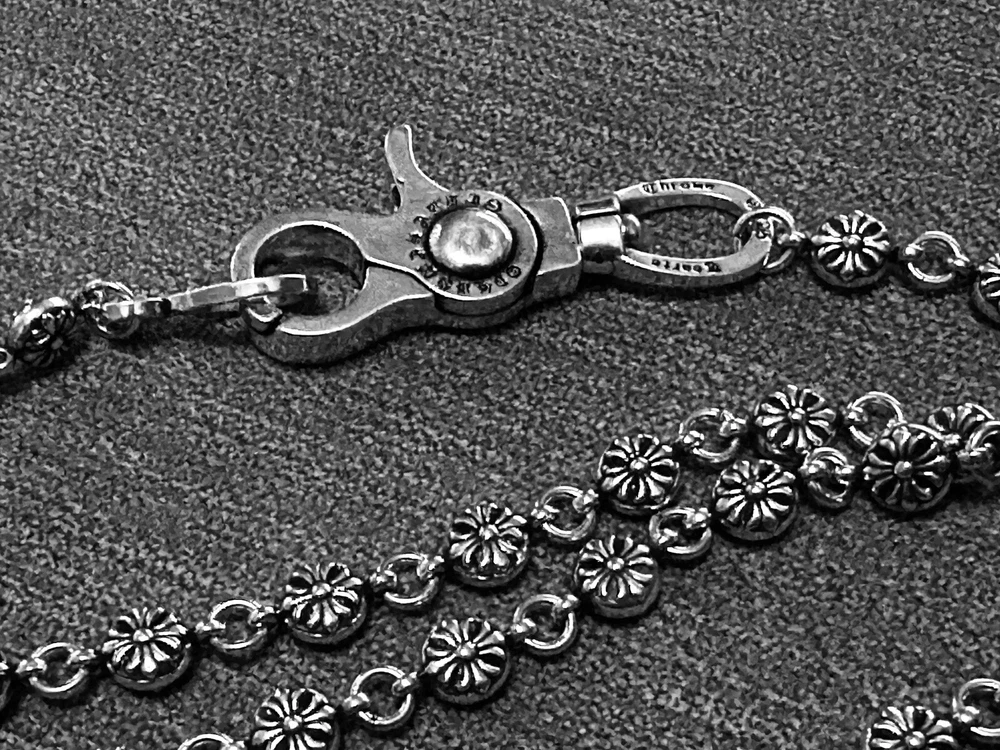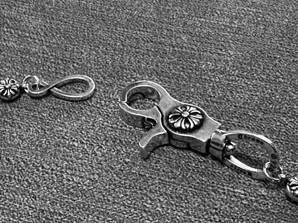 Link chain Chrome Hearts STYLE Wallet Chain Can also be used as a necklace Stainless Steel Intricate bead Link design Lobster clip fastening Measures approx 23” in length Clip measures approx 9mm in width Chain measures approx 8mm in width Weighs approx 70 grams