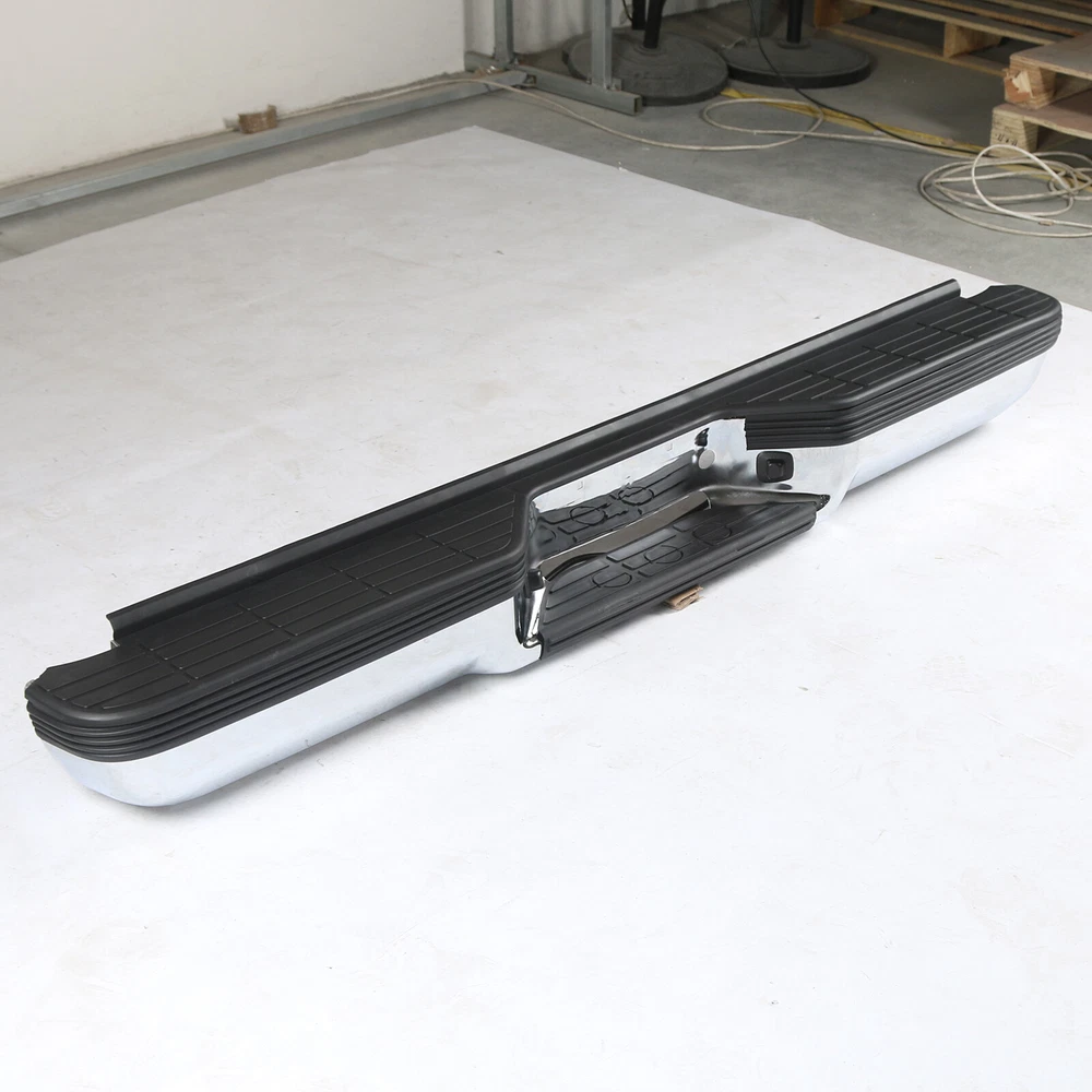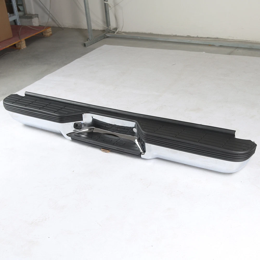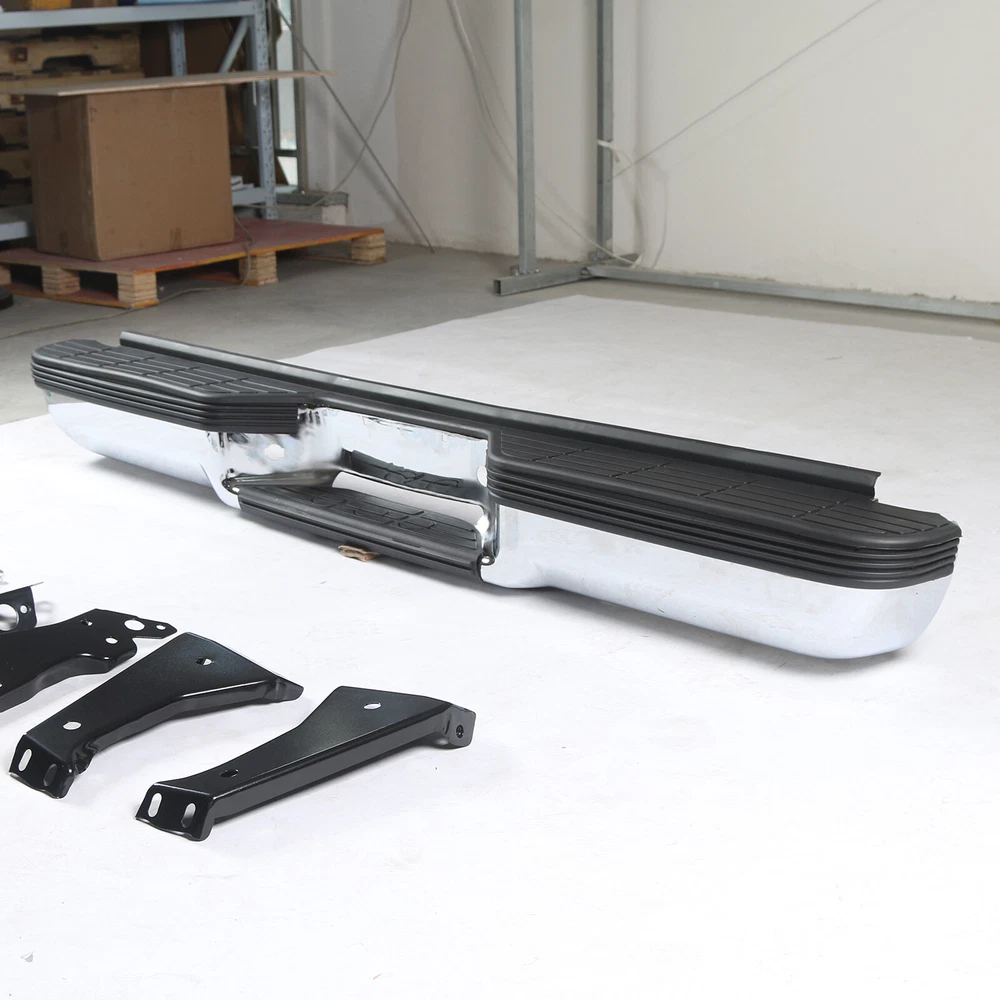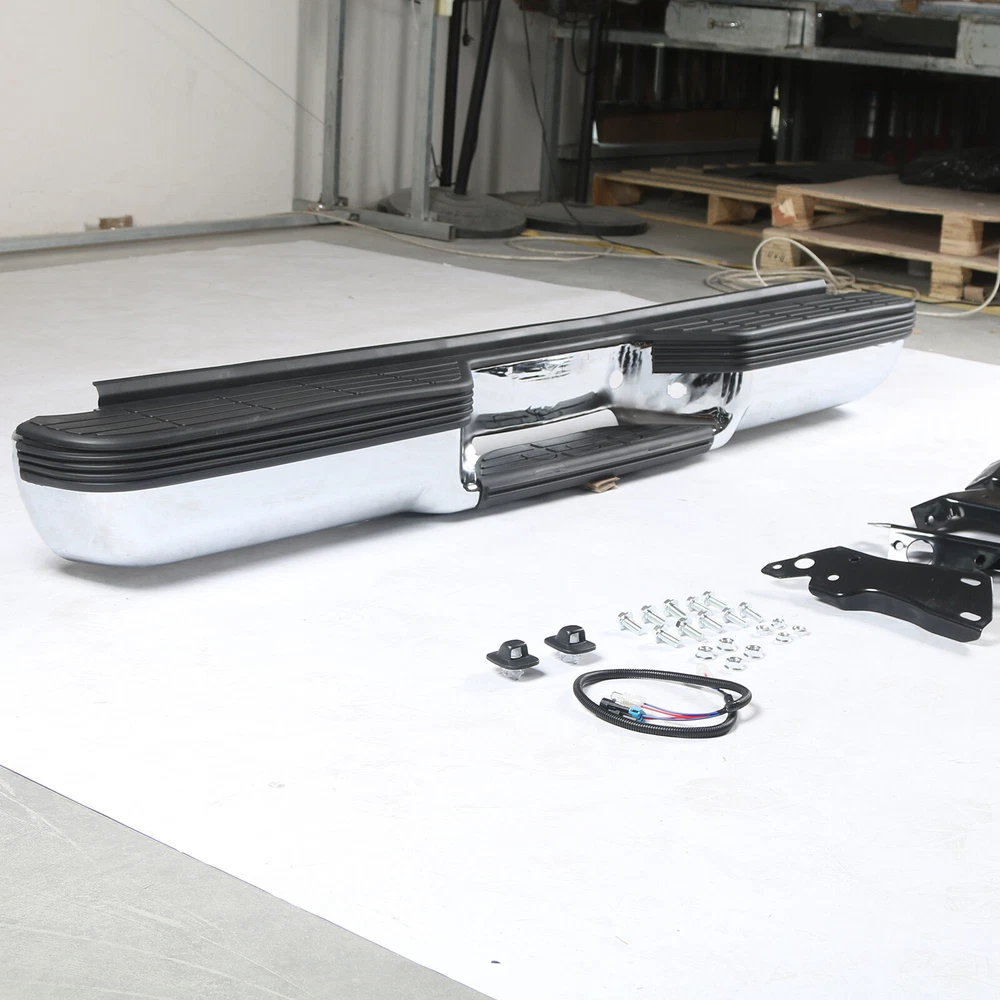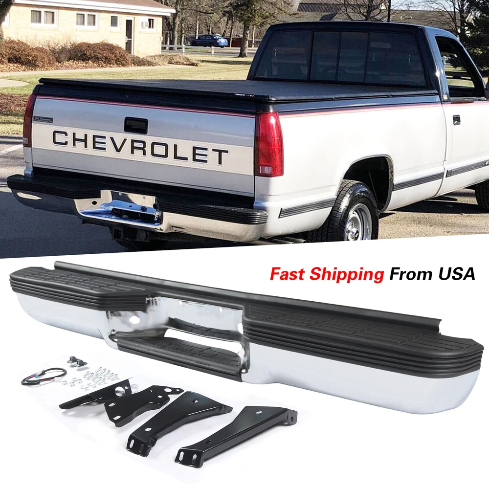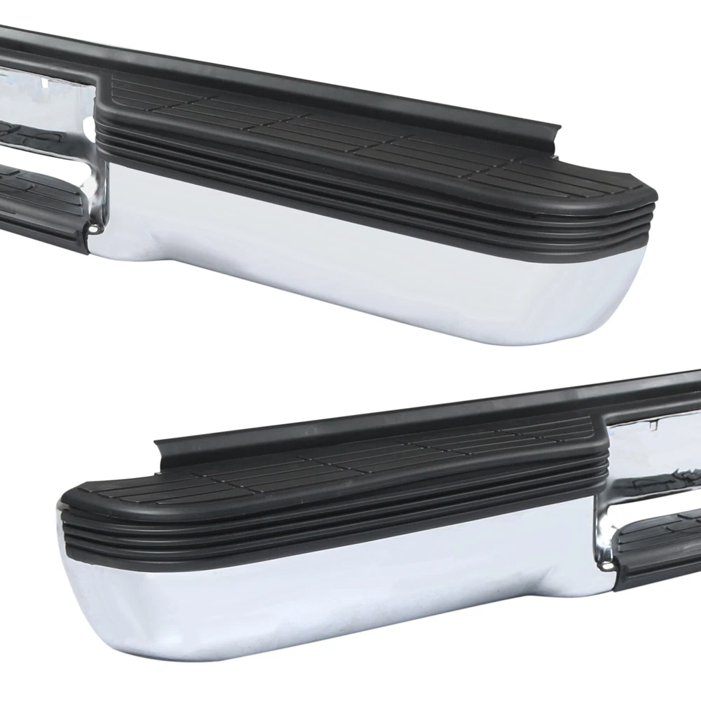 FITMENT Chevrolet 1988-1998 C1500 1988-1998 K1500 GMC 1988-1999 C1500 1988-1999 K1500 SPECIFICATION Color:Chrome & Black Finish:Polished Chrome Placement on Vehicle:Rear INCLUDE Step Bumper Black Pad(s), Bolt Kit License Plate Lights Bracket(s),