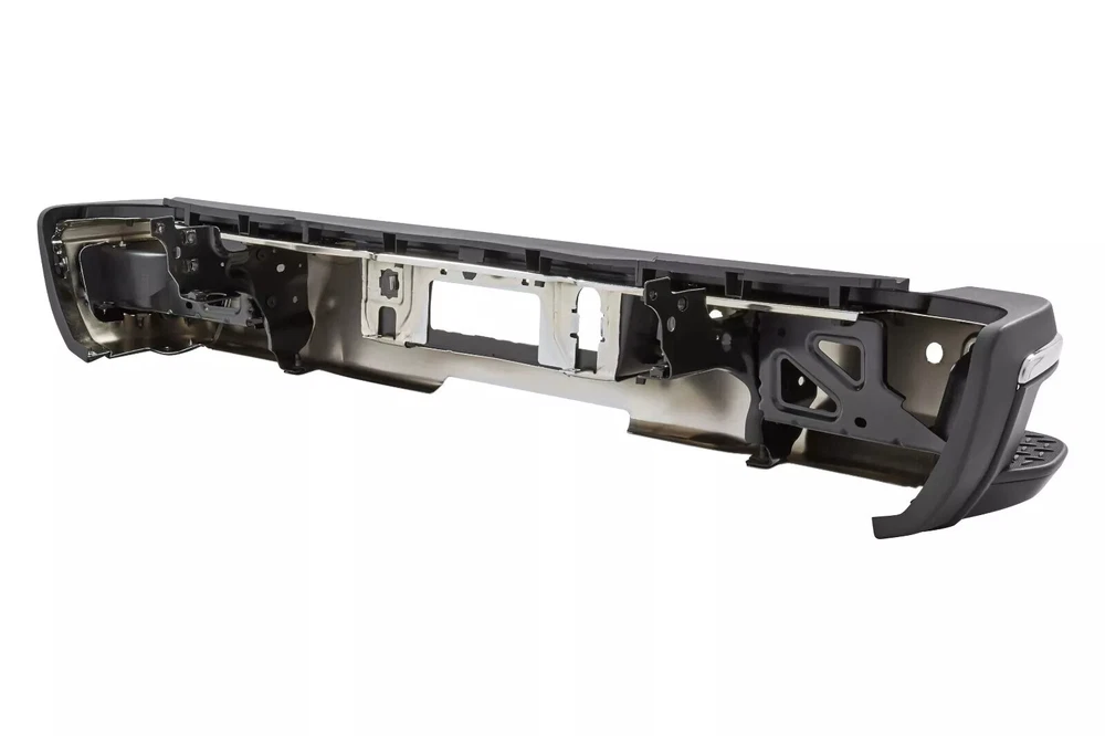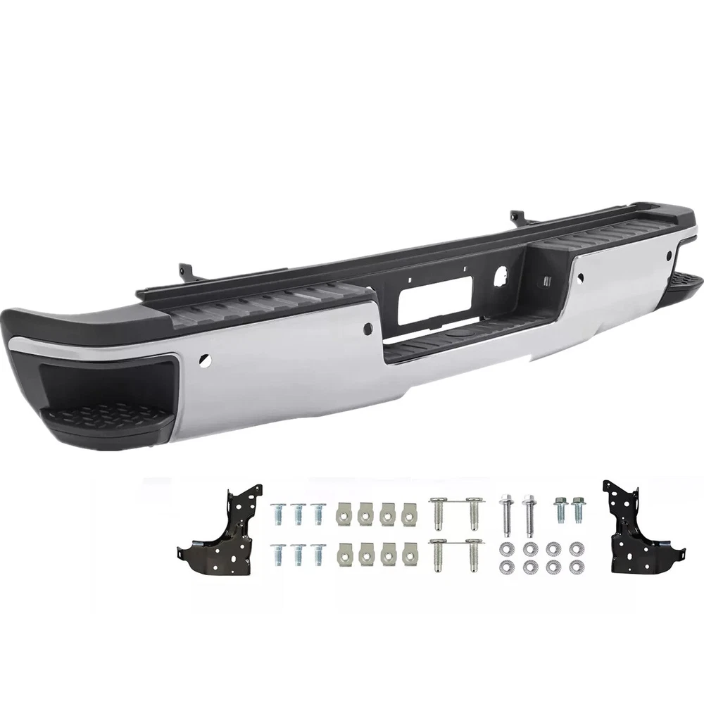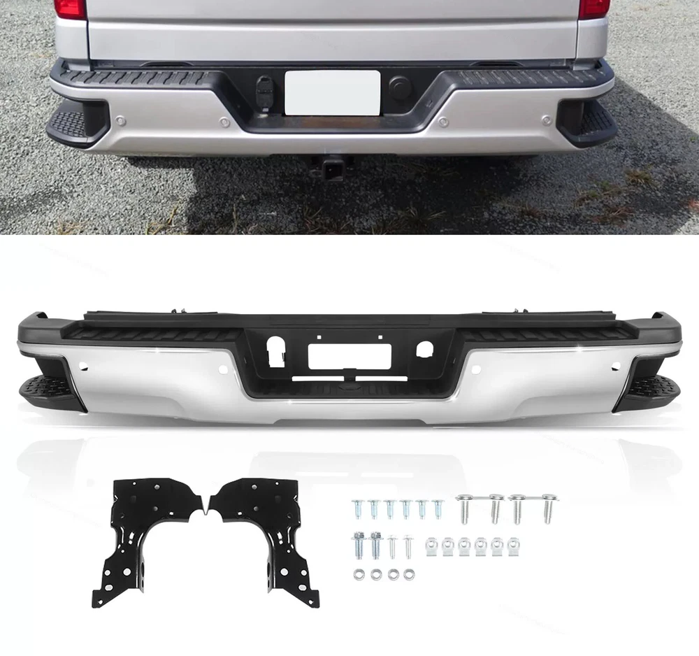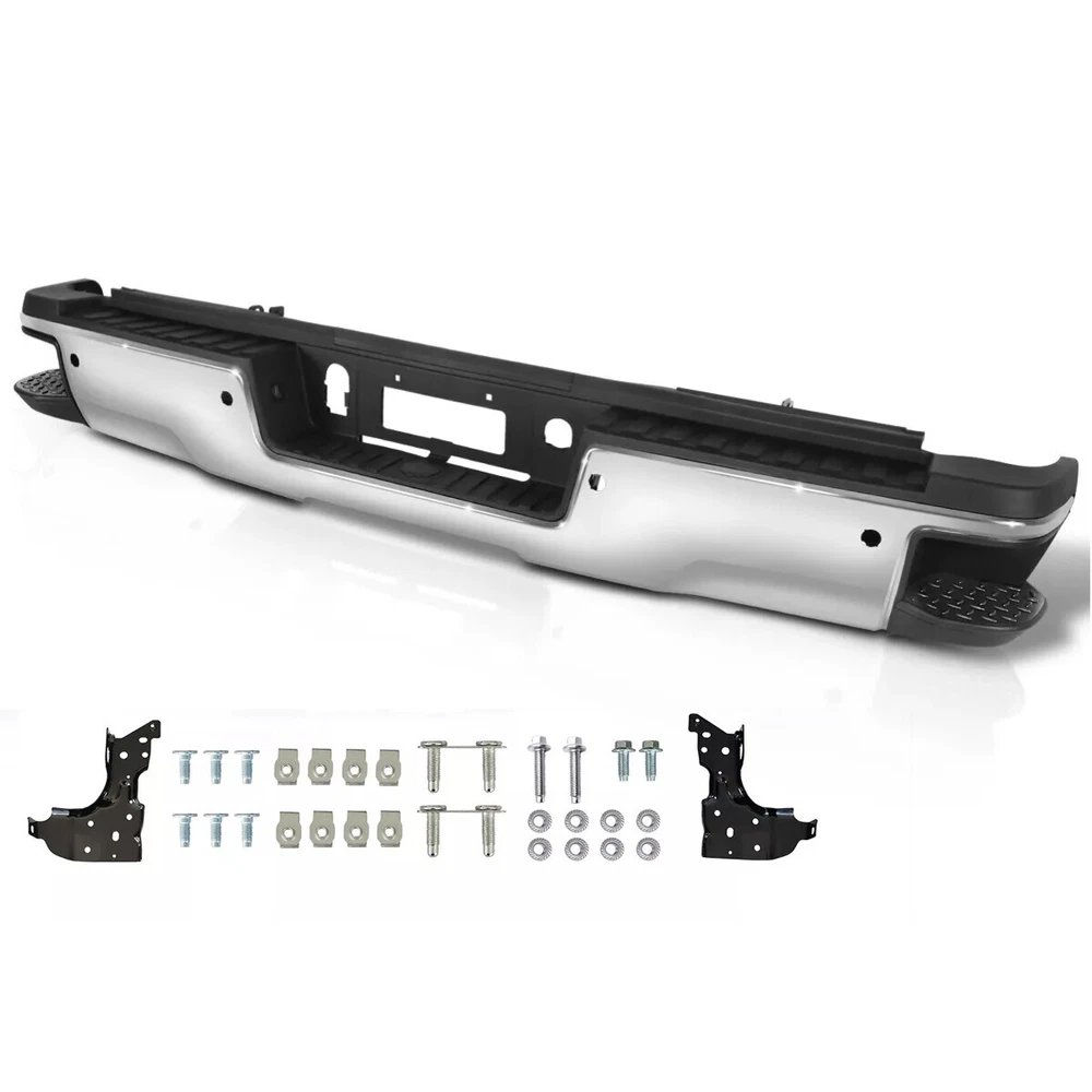 Fitment: 2015-2019 Chevrolet Silverado 2500 HD 2015-2019 Chevrolet Silverado 3500 HD 2015-2019 GMC Sierra 2500 HD 2015-2019 GMC Sierra 3500 HD For Models With Park Sensors For Use With Factory Tow Hitch (Hitch Plate Not Included) High Polished Chrome Finish For Rear Single Wheel Models ONLY Includes Reinforcement, Brackets, Hardware, Lamps and Step Pad Direct OE Replacement