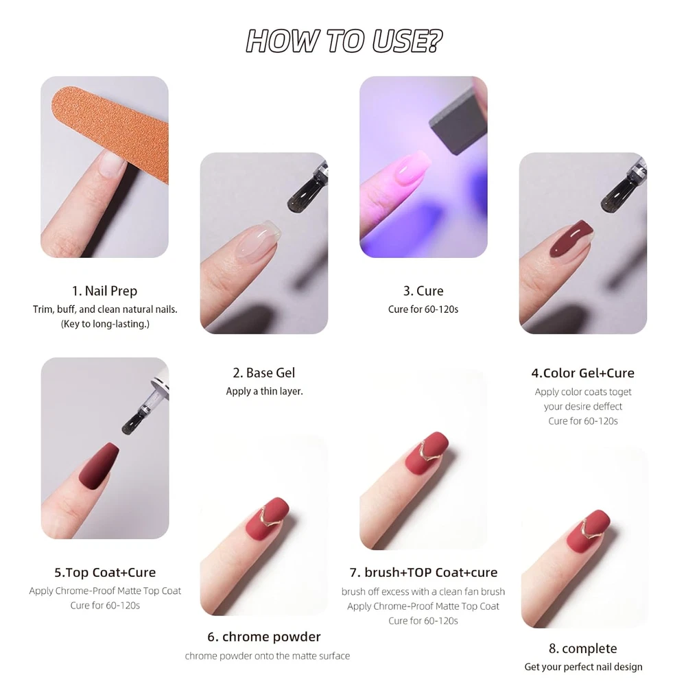 Store New Arrivals Add to Favorite View Feedback Contact Fast deliveries to the customer's home Quality customer service John Make the customers happy! Chrome-Proof Matte Top Coat, UV/LED Cured Gel Nail Polish, Anti-Stick Long-Lasting Formula, 0.5 Fl Oz Description MATTE FINISH: Professional-grade chrome-proof matte top coat delivers a sophisticated non-glossy finish while protecting nail color underneath UV/LED CURED: Quick-curing formula sets in just 60 seconds under LED lamp (90 seconds UV), creating a durable protective layer PRECISION APPLICATION: Features a specialized applicator brush designed for smooth, streak-free coverage and precise chrome powder application VERSATILE USAGE: Can be worn as a matte finish or sealed with glossy top coat for dramatic contrast effects, perfect for chrome powder designs LONG-LASTING FORMULA: Anti-stick technology combined with high toughness rating ensures extended wear and chip resistance, 0.5 Fl Oz bottle size Transform your nail art with this innovative Chrome-Proof Matte Top Coat gel polish. This professional-grade formula delivers exceptional durability with its anti-stick, long-lasting properties. The precision isolating powder application creates stunning metallic designs on the matte surface, perfect for creating sophisticated nail art effects. The 0.5 fl oz bottle includes a precision brush for flawless application. Simply apply a thin layer over your base color, cure under LED lamp for 60 seconds, gently work the chrome powder into the matte surface, and brush away excess for dramatic results. The formula boasts impressive toughness, flatness, and hardness ratings for superior protection. For versatile styling, either seal with a glossy top coat for eye-catching contrast or leave matte for an edgy finish. The self-leveling formula ensures smooth, streak-free application while UV/LED curing technology delivers long-lasting wear. Ideal for both professional nail artists and at-home use, this top coat opens up endless possibilities for creative nail designs. Item model number Functional Gel 08 Item dimensions L x W x H 1.9 x 0.79 x 3.7 inches Liquid Volume 15 Milliliters Special Feature Long Wearing Color Clear Type top_coat Product Dimensions 1.9 x 0.79 x 3.7 inches; 2.4 ounces Model Name M08 Chrome-Proof Matte Top Coat Material Type Free Formaldehyde Resin Free Item Form Gel Finish Type Matte ABOUT US We offer the best prices around on high quality products. Our E-store includes media such as books, movies, music and games while offering electronics, toys, sporting apparel, clothing, tools, general home, garden items and more. SHIPPING We are always working hard to ensure your package arrives as soon as possible. Please understand that some factors like weather, high postal traffic, and the performance of shipping companies are outside of our control. We offer free shipping to the lower 48 states and ship within 2 business days of payment, usually sooner. We do not accept P.O. Boxes. Please provide a physical address. For shipping outside of the continental USA, we only use eBay's Global Shipping Program. The item is shipped to KY and then sent to the rest of the world. International customers are responsible for all duties and taxes. Continue to 'check out' to calculate costs for shipping the item to your country. Messages regarding eBay's Global Shipping Program MUST be directed at eBay EXCLUSIVELY. RETURNS We offer a 30-Day Return Policy on items in which you are not completely satisfied with. You have the option of a full-refund or an exchange of the item. No returns are available on items shipped outside of the USA PAYMENT We accept PayPal. CONTACT US This page content is yet to come Please ad us to your favorite seller and visit again later Thank You CUSTOMER SATISFACTION We try our very best to make sure every customer is completely satisfied. If there's a problem, message us! We're happy to help. WE ACCEPT