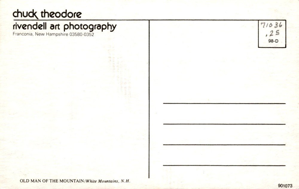 The postcard features a photograph of the Old Man of the Mountain in the White Mountains of New Hampshire. The image was captured by Chuck Theodore of Rivendell Art Photography, based in Franconia, New Hampshire.- **Chuck Theodore**: A photographer associated with Rivendell Art Photography in Franconia, New Hampshire.