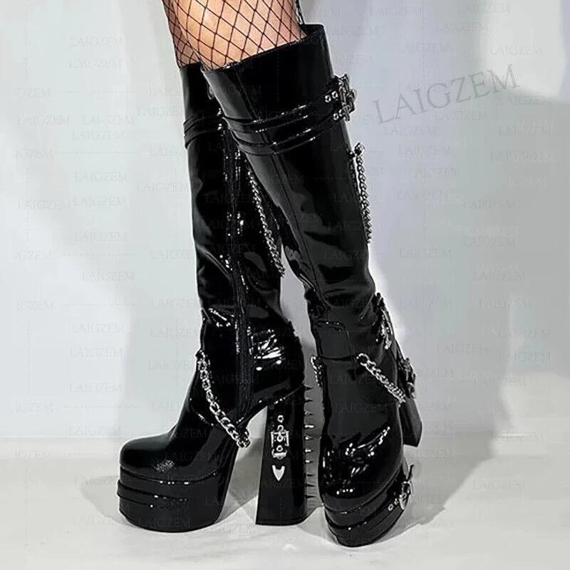 These boots are absolutely stunning! The chunky platform and bold chains give them serious edge, while the 15cm heel adds killer height without sacrificing comfort. The zip-up design makes them easy to slip on, and the studded details add extra attitude. Shipping took about 3 weeks to the US, which was expected. They fit true to size and feel sturdy—perfect for making a statement all season long!
