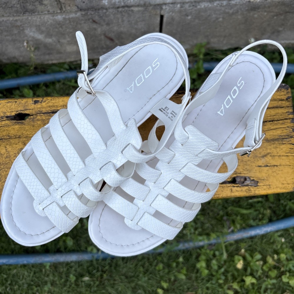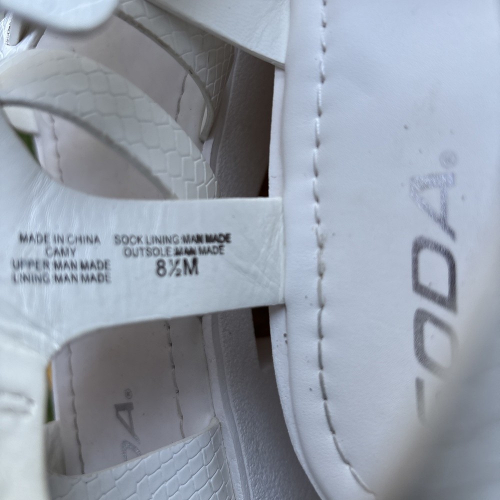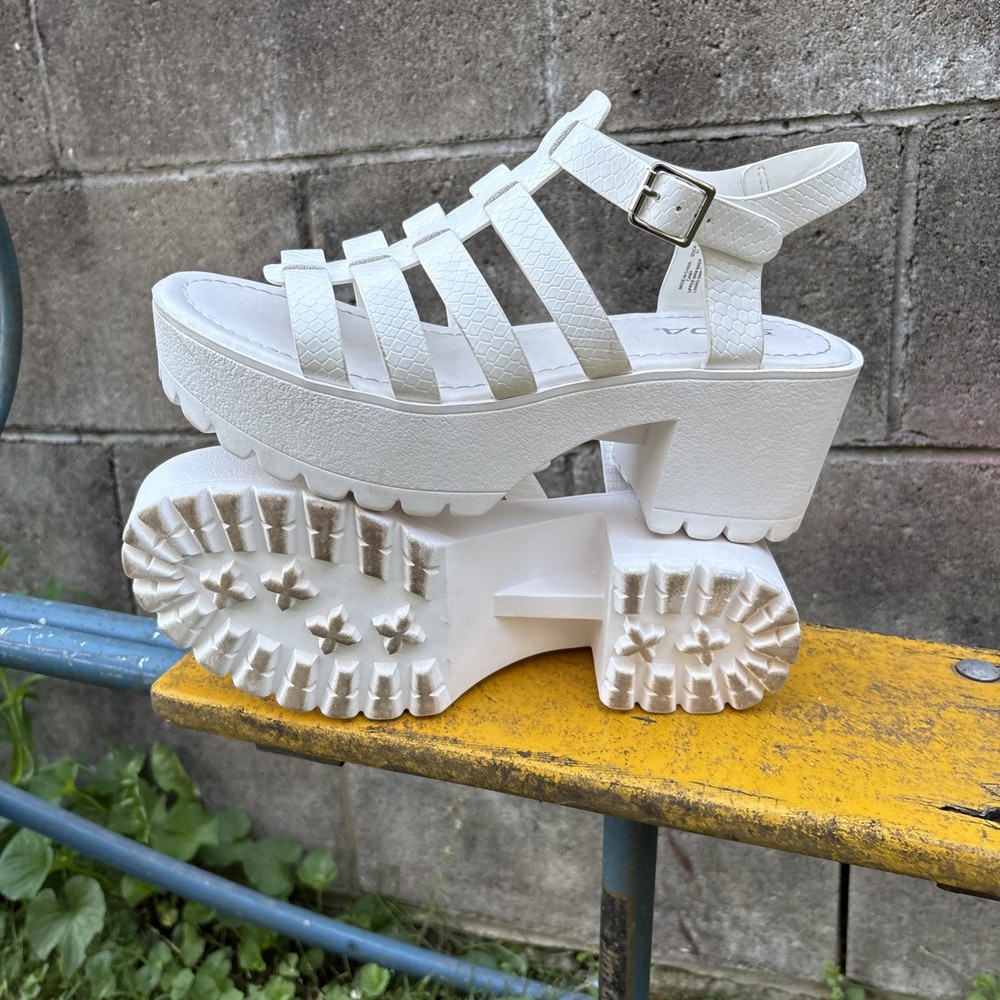 These Chunky Y2K inspired Women's Strappy Platform Sandals in size 8.5 are a stylish and comfortable option for various occasions such as weddings, parties, or casual outings. Featuring a mid-heel height and a unique animal texture accent, these white sandals are inspired by the popular Clueless style. With adjustable straps and a breathable design, these sandals are perfect for the summer and spring seasons. Made by Soda, these synthetic sandals have a block heel and a fashionable open toe design, making them a trendy choice for any fashion-forward woman.