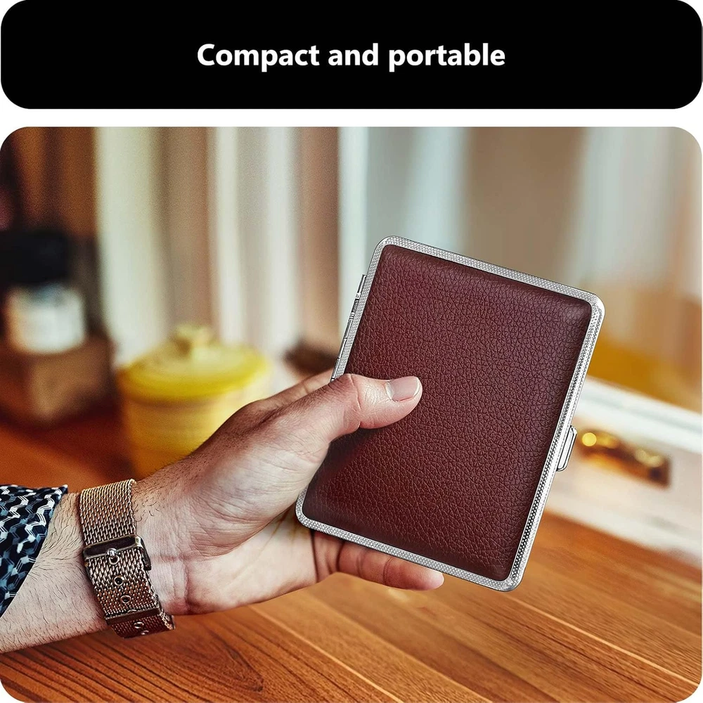 Include Content: Get 3 cigarette case (packaged in exquisite gift box), suitable for personal use and gift giving. Quality Materials: Exterior is made of PU leather and the interior is made of metal, surface is very smooth and the structure conforms to ergonomics. Cigarette Type: Suitable for Regular, King and 100's Size. Can not fit 120mm cigarettes. Design Highlights: Moisture and pressure prevention, can hold 20 cigarettes. Using mechanical switches, double sided spring clip open. Applicable scope: Roygra cigarette case can be used in patio, homes, offices, outdoors, balconies, bars, cafes, hotels, and more. Product Description The video showcases the product in use. The video guides you through product setup. The video compares multiple products. The video shows the product being unpacked.