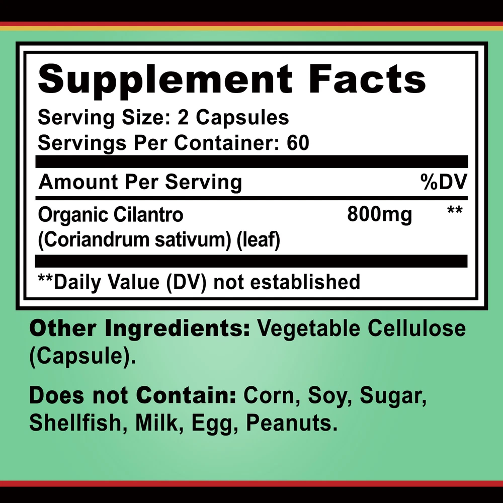Effects: Cleanse & Detox, Antioxidants Ingredients: Cilantro Directions: Take 1-2 capsules twice a day after meals. Shipping: Ships within 48 hours on working days. Shelf life: 2 years Description: Cilantro as a Source of Antioxidants: This cilantro supplement is formulated with cilantro, commonly known as coriander. Cilantro extract is a rich source of antioxidants. Extracted from Nature: Our cilantro supplements are extracted from cilantro, ensuring they are from a natural source and are free of GMOs. Document
