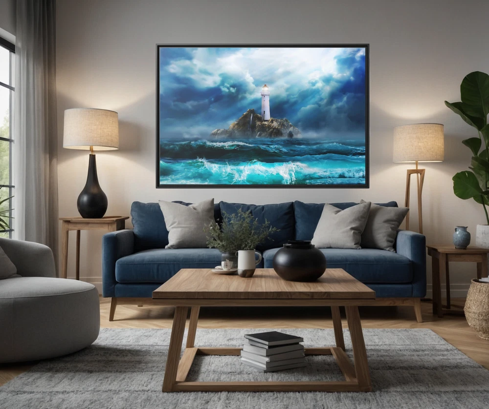 Cinematic Coastal Lighthouse Illustration by Hypnotik Creations Product Description: Immerse yourself in the serene beauty of the coast with this cinematic coastal illustration by Hypnotik Creations. This enchanting artwork features a picturesque white lighthouse perched atop a rocky island, complemented by a cascading waterfall and a mesmerizing blue surf seascape. Sunbeams pierce through dramatic clouds, casting a radiant glow across the scene, evoking a sense of nautical charm and tranquility. Expertly printed on museum-quality cotton-polyester composite gallery-wrapped canvas , this artwork boasts vibrant colors and remarkable detail, protected by a special proprietary matte finish coating for lasting brilliance. The high-definition imagery is produced using UL-certified Greenguard Gold inks and latex inks that are non-hazardous, non-toxic, and non-flammable. Encased in a 1.25" solid pine wood frame , available in white or black, the frame enhances the artwork with a modern floating effect. Sustainably sourced and Forest Stewardship Council certified , the frame is an eco-friendly choice, perfect for any interior space. The canvas comes ready to hang straight out of the box , equipped with sawtooth hanging hardware for hassle-free installation. Please note: slight size deviations may occur due to the production process (+/- 1/8", or 3.2mm). To maintain its pristine condition, simply wipe the surface gently with a clean, damp cloth if it gathers dust. Key Features: Cinematic Illustration: Features a lighthouse on a rock island, a small waterfall, blue surf, and sunbeams breaking through clouds. Premium Printing: Expertly printed on museum-quality cotton-polyester composite canvas with vibrant, long-lasting colors. Eco-Friendly Materials: Made with sustainably sourced Forest Stewardship Council-certified pine wood . High-Quality Inks: Utilizes UL-certified Greenguard Gold inks and latex inks that are safe, non-toxic, and non-flammable. Modern Framing: 1.25" solid pine wood frame in black or white with a floating effect. Ready to Hang: Equipped with sawtooth hardware for easy installation. Durable and Low Maintenance: Matte finish coating protects against dust and fading; clean gently with a damp cloth as needed. Size Tolerance: Minor size deviations (+/- 1/8", or 3.2mm) due to the production process. Frame Color Options: Black & White. Size Options: 30x20, 36x24 & 48x32 Enhance your home or office with this nautical masterpiece , blending natural beauty with timeless coastal charm. * Shipping to Alaska, Hawaii, and unincorporated territories of the United States can take additional 7 ? 12 business days, weather permitting.