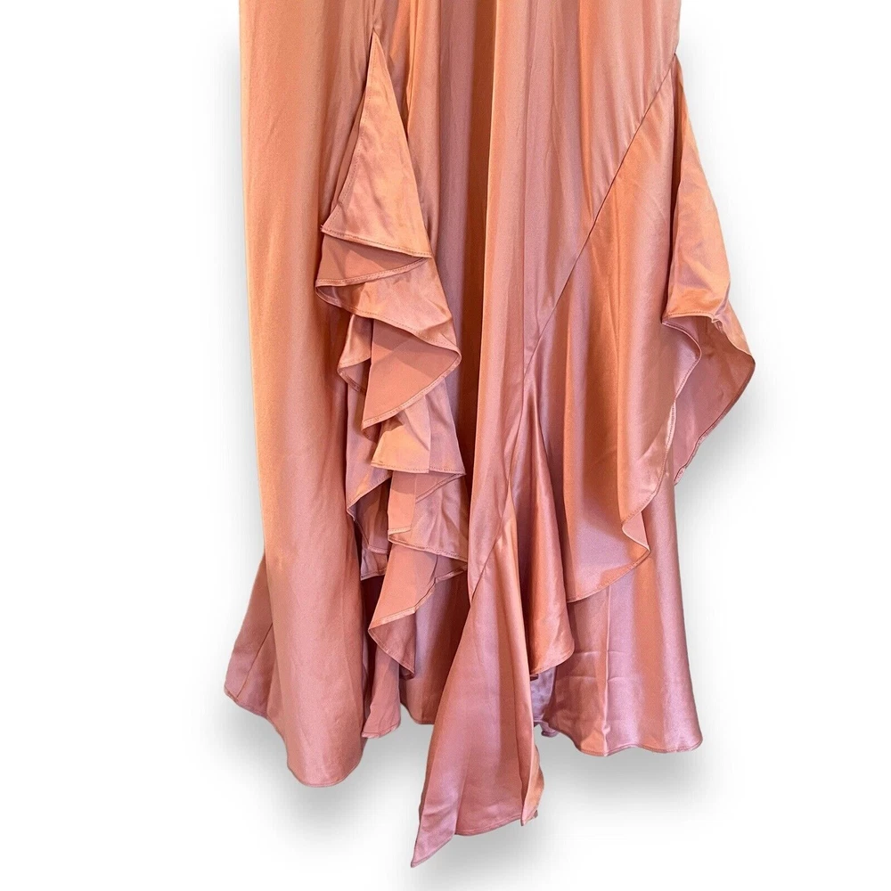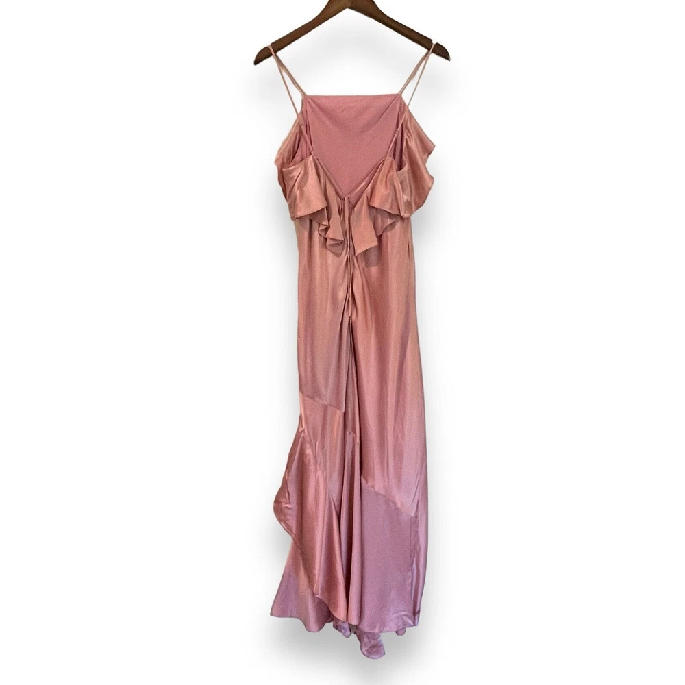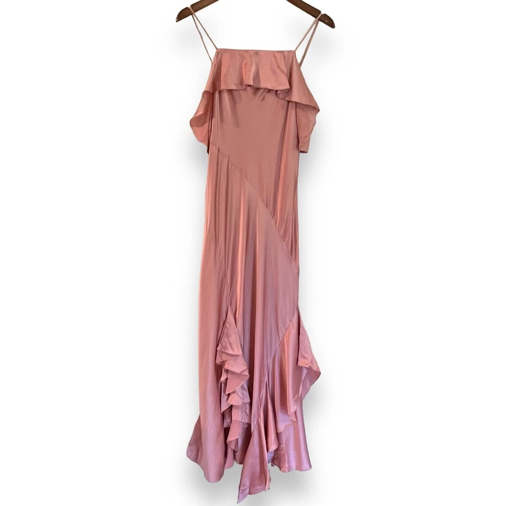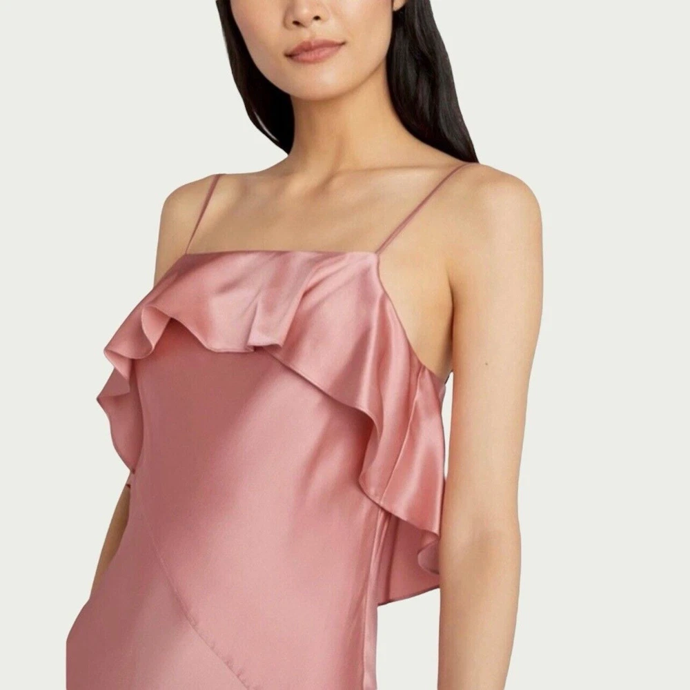 Cinq à Sept Blush Pink Elly Ruffle 100% Silk Maxi Slip Dress Size 12. New with tags but there are a couple small spots in the folds of ruffle on the front that should come out once dry cleaned. I only noticed them while taking photos. Please see last photo. Original retail price $595. * Lined * Ruffled asymmetrical hemline * Back zip closure * 100% silk * Dry clean only Chest: 18” flat across underarms Waist: 15” flat across Length: 56” shoulder to longest part of hem Ships from a smoke free home.