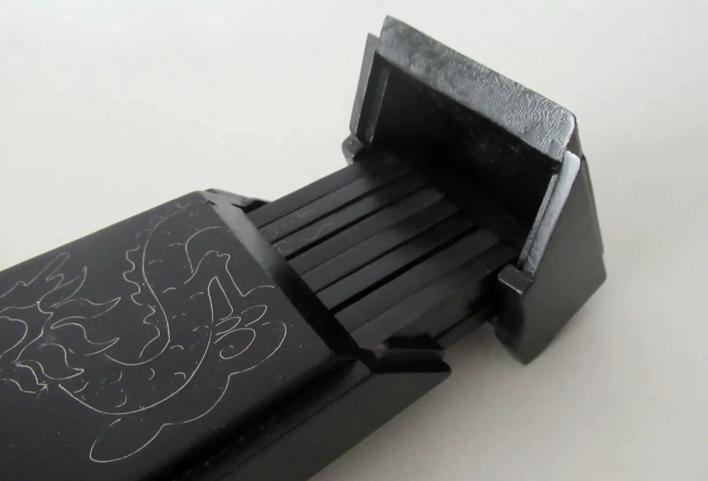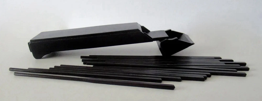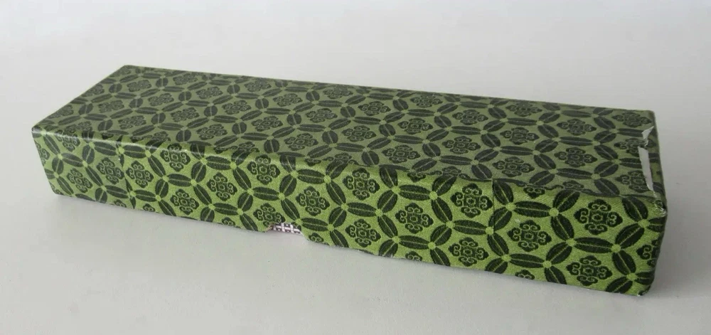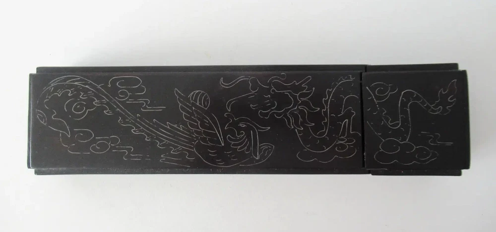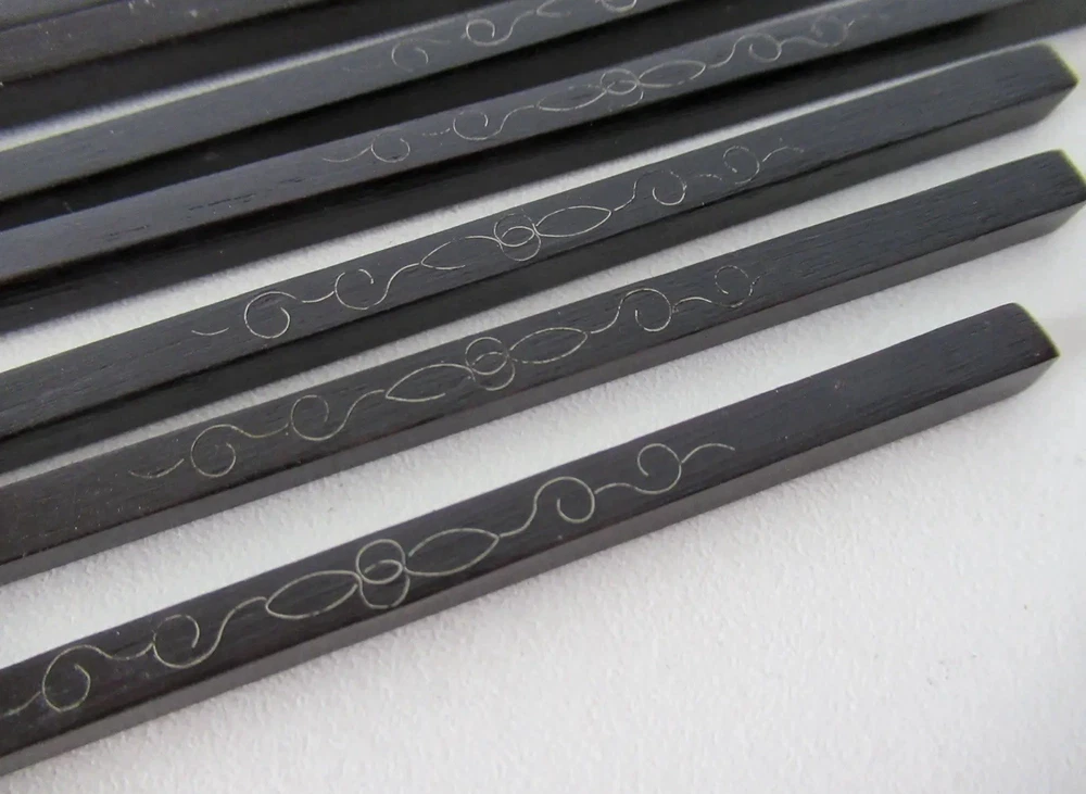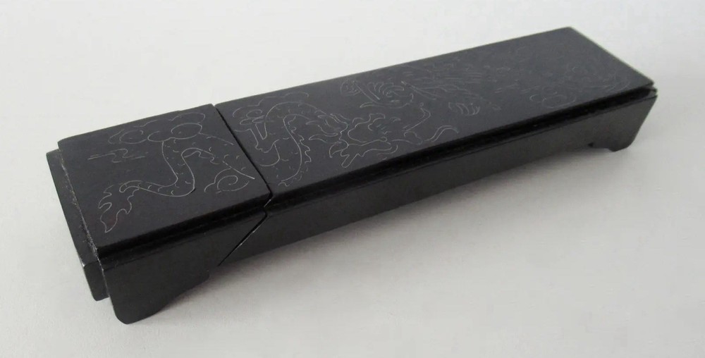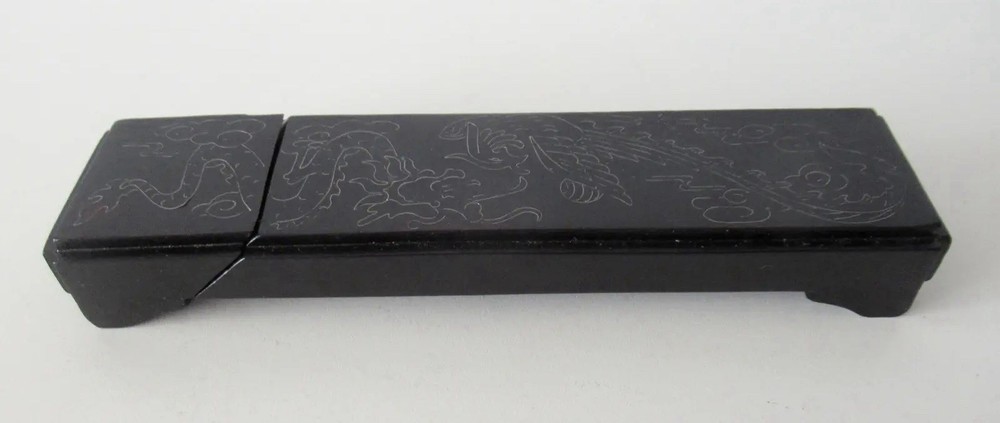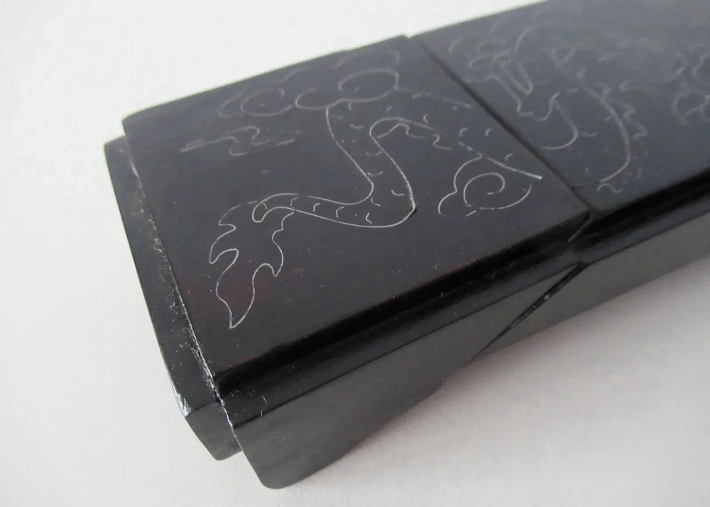 C.1991; Wood carved set of 16 Chinese chopsticks, with silver plate inlaid detail to Holder/Carrier Box as well as within each chopstick(s), as images indicates. The Holder/Box has a Chinese Dragon motif design detail. This set was sourced in Upstate, NY, from a North American Businessman, with industrial ties, from the glass manufacturer's industry/trade/owner's with North American projects in Major U.S. Cities. The set is also retained with the original packaging of the exterior case box, as the item was a gift from Glass fabricators within China, when business tripes delegated a diplomatic and universal understanding in sourcing products for site specific projects. Carved Carrier/Holder: 10.25"W x 2.75"D x 1.50"H. Outer Box: 11.25"W x 3.25"D x 1.75"H. (MAIN DIMENSION) Chopsticks: 10.75"W x .25"D x .25"H. TOTAL 18 Pcs., which includes OUTER BOX, INNER CARRIER/HOLDER CASE & 16 Chopsticks. Dimensions 11.25ʺW × 3.25ʺD × 1.75ʺH