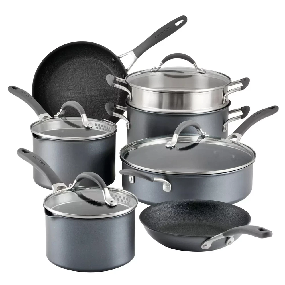 Circulon 11 Piece Non-Stick Cookware Set, A1 Series Scratchdefense, Aluminum NEW Features: Impact Bonded base ScratchDefense Non-Stick Interior Compatible with All Cooktops, Including Induction Ergonomic Silicone Grip Handles Dishwasher Safe & Oven Safe up to 400°F Specifications Brand Circulon Cleaning Recommendation Dishwasher Safe Coating Type PTFE Non-Stick Color Gray Features Induction Features Non-stick Features Oven Safe Features Riveted Handles Material Aluminum Model 81841-T Number of Frying Pan(s) 2 Frying Pans Number of Lid(s) 4 Lids Number of Pieces 11 Piece Number of Saucepan(s) 2 Saucepans Number of Saute Pan(s) 1 Saute Pan Number of Skillet(s) 0 Skillets Number of Stock Pot(s) 1 Stock Pot Oven Safe Temperature 400 F.