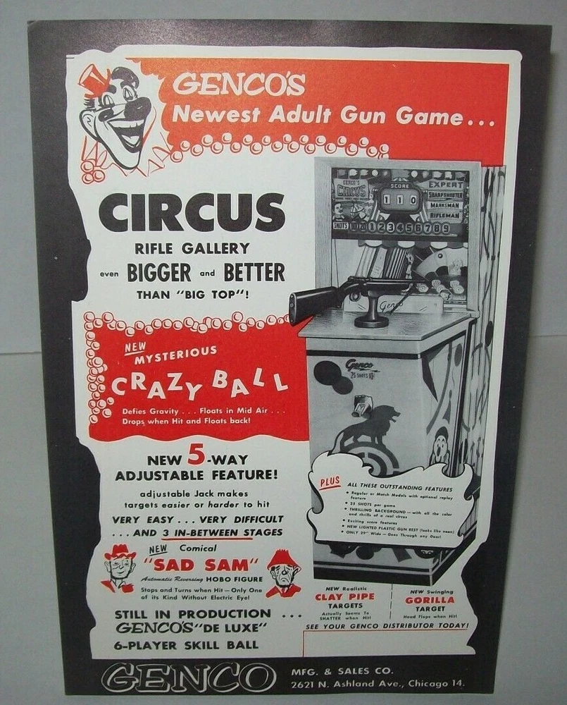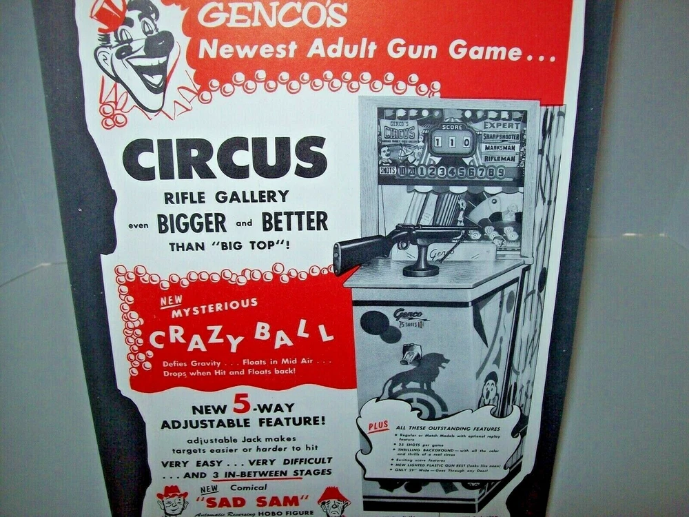 Genco Circus Arcade FLYER 1957 Original NOS Shooting Gallery Gun Rifle Game Art Original never circulated new old stock paper promo sales flyer. Single page one sided artwork sheet. Has some light corner creases. Flyers are paper promotional advertising art print sheets made for coin operated amusement arcade games. Also called a circular, brochure, pamphlet, or flier. All are single sheets unless noted otherwise. If there is artwork on the back side it will be shown. Size is 7.75" X 11.75". Perfect for framing. Makes great wall art for the man cave or a unique gift idea. Sheet protector included with each flyer sold. Orders are shipped with care. More pinball, jukebox, slot machine, and arcade game items for sale in our store. SHIPPING Bundle and save by using cart and making single payment. International buyers are responsible for any import fees/taxes. ABOUT US Seller of vintage collectibles, paper ephemera, gifts, advertising, artwork, original pinball flyers, vinyl records, video arcade flyers, pinball machine translites, game manuals, score cards, magazines, antique Halloween and holiday postcards, Christmas items, super hero memorabilia, horror themed art. . .