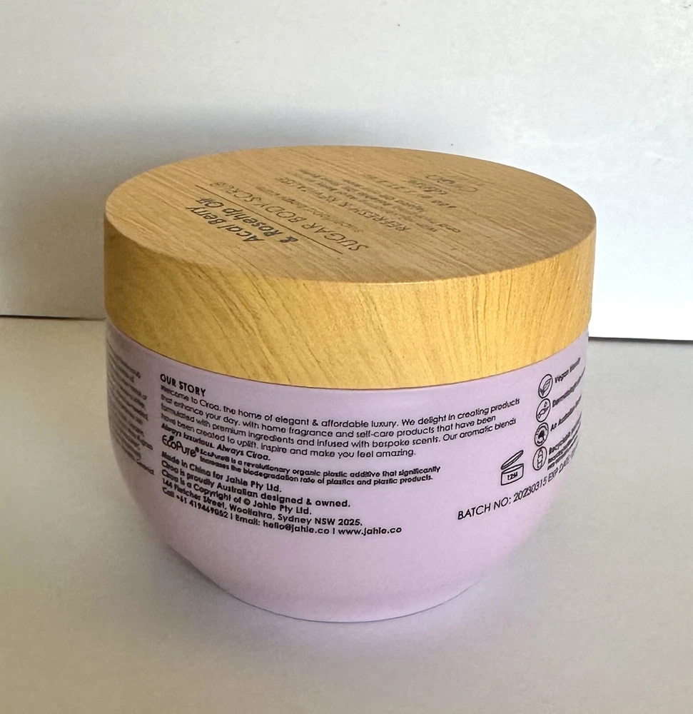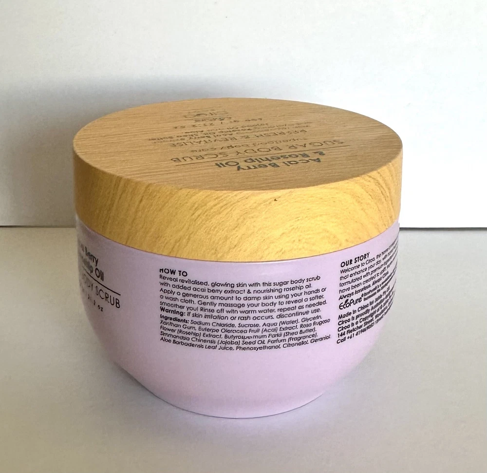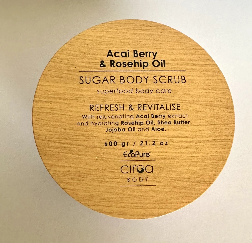 Ciroa Açaí Berry & Rosehip Oil Sugar Body Scrub Refresh & Revitalize 21.2 Oz. Superfood body care with rejuvenating acai berry extract and hydrating Rosehip oil, shea butter, jojoba oil and aloe Reveal revolatized, glowing skin with this sugar body scrub with added açaí berry extract and nourishing rose hip oil.