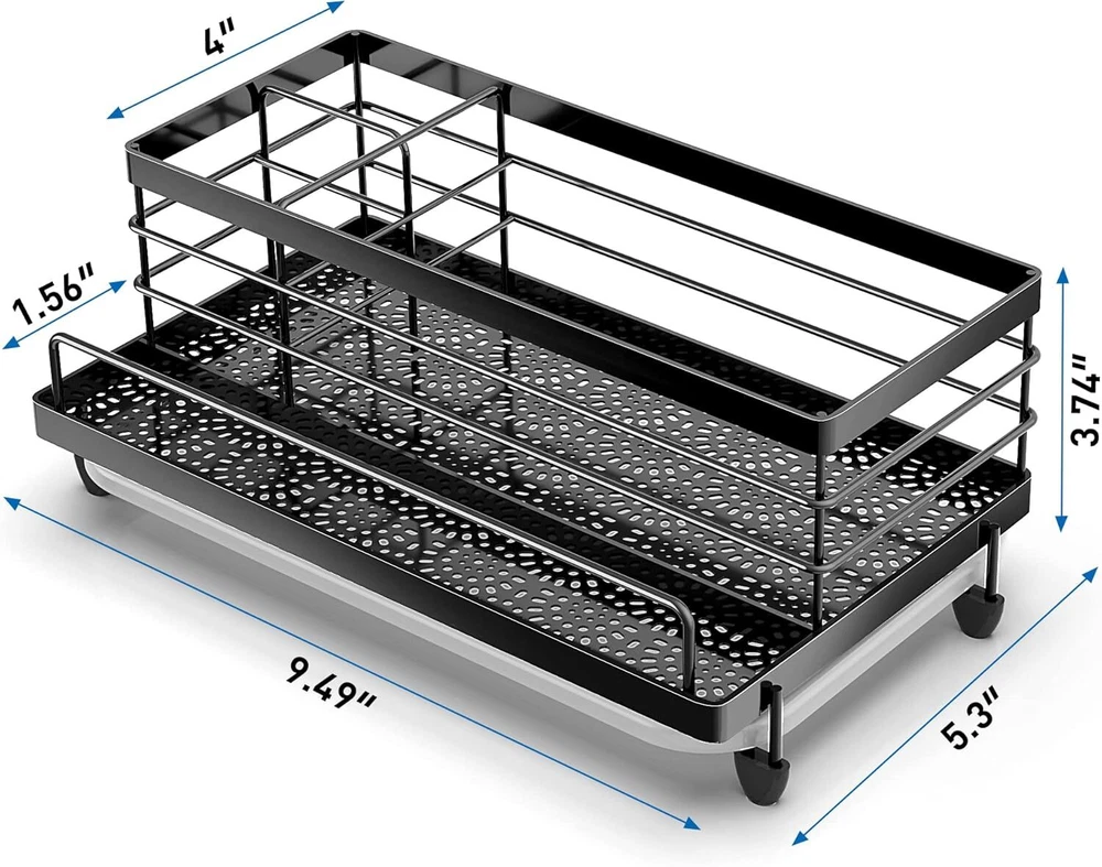 Cisily Sponge Holder , Caddy Organizer, Sink Accessories with Drip Black Product Details Specific Uses For Product: save space Material: Black Special Feature: Adjustable Storage Color: Black Brand: Cisily Finish Type: spray paint Product Dimensions: 5.3"D x 9.49"W x 3.74"H Number of Compartments: 4 Shape: Rectangular Number of Items: 1 Mounting TypeItem Weight: Tabletop Mount1.15 Pounds 【MORE STORAGE SPACE 】Compared to other kitchen sink caddy CISILY sponge holder expands to 5.3 inches wide and 9.49 inches long, enhancing its kitchen organization function, and allowing flexible placement of sponges, dish soap, soap dispensers, brushes, sink plugs and more. Make the most of every inch of space and make your kitchen look cleaner. 【REASONABLE DIVIDER DESIGN】 The sponge holder for kitchen sink ergonomic divider design allows it to have 4 separate storage spaces, Different items are placed in different areas, so as to achieve a well-organized effect, so that your counter is no longer cluttered. 【KEEP DRY】The sponge holder features an elegant petal pattern cutout design and sturdy stain-resistant tray to keep it looking good. The hollow bottom design increases drainage speed, the drip tray collects excess water, keeps the sink rack and countertop dry. 【ANTI-RUST STURDY MATERIAL】: We chose a stainless steel material more suitable for kitchen sinks to make the sink caddy and added sandblasting technology to the surface for secondary protection. This improves the corrosion and scratch resistance of the sponge holder, which will still look new after long-term use.