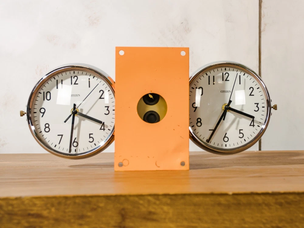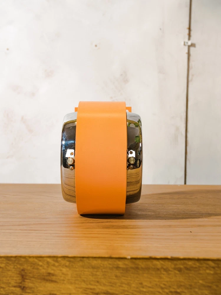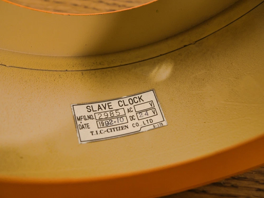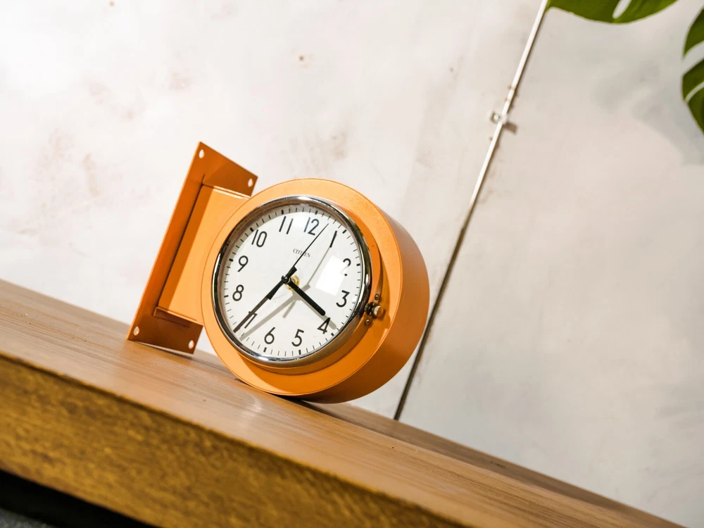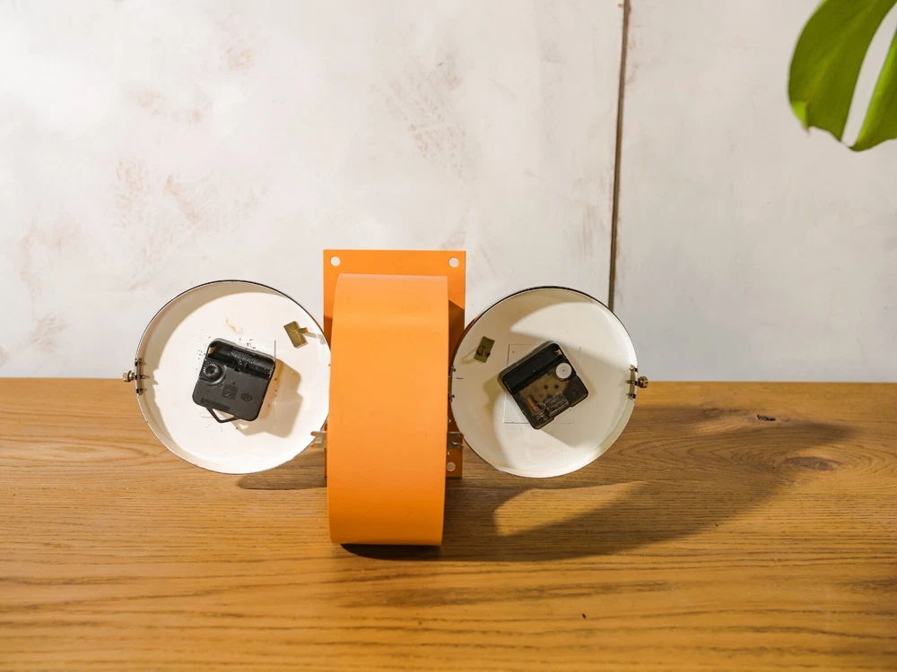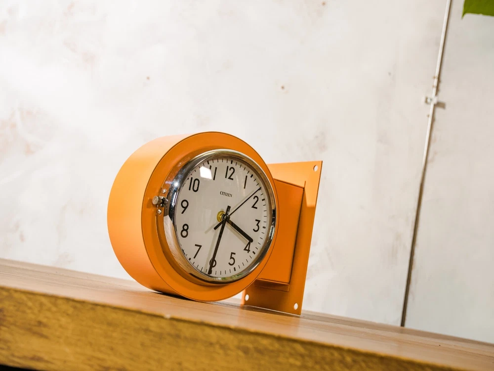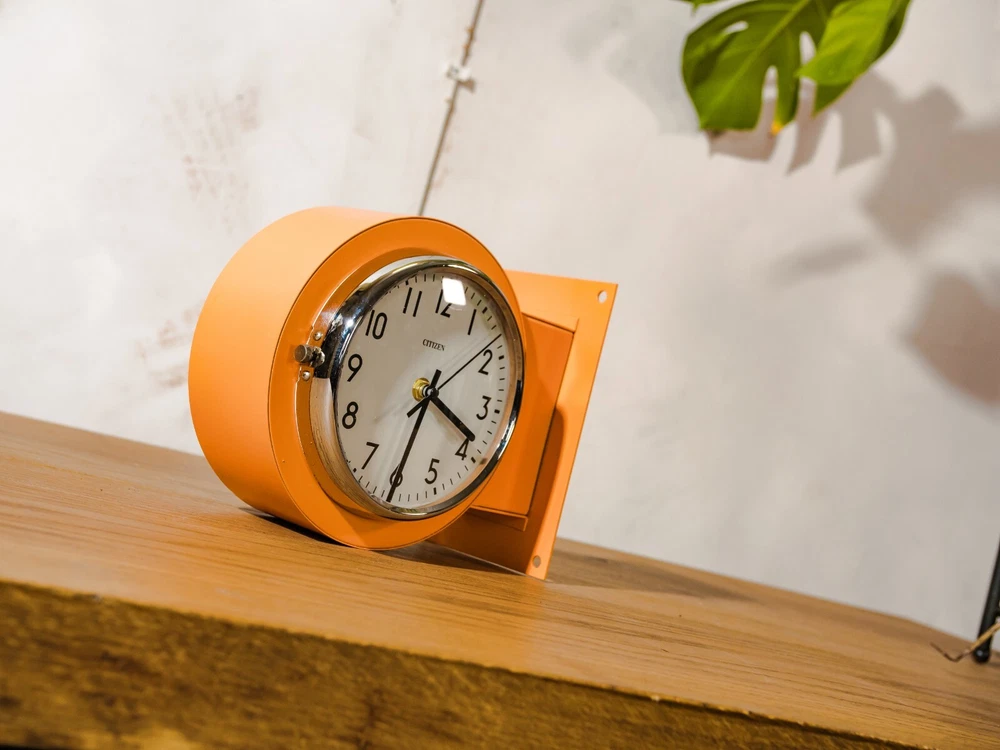 Salvaged from a Submarine, A Double Sided Citizen Wall mounted clock. Make: Citizen Model: Double sided Slave Clock Made in the 1980s in Japan Color: Retro orange with chrome accents. Measurements: 24CM X 20CM X 12CM (9.4" X 7.8" X 4.7"). Unique Eye catching Double Faced wall clock. Perfect for any industrial or retro interior such as loft, restaurant, shop or living room. The Clock has been completely restored and got a fresh Orange finish. We've added two modern Quartz battery powered clock mechanisms that only requires 2 AA batteries. This is an original Vintage item, meaning there could be signs of wear, making it extra unique. Originally utilized as a crucial component aboard a submarine that traveled the world, this clock has travelled many thousands of kilometers, faithfully keeping time within the confines of ship cabins. This piece was once linked via electric wires to the central timekeeping unit located in the captain's cabin (The mother clock). It's easy to mount it on the wall with 4 screws/bolts. PLEASE NOTE: ANY CUSTOMS DUTIES WILL BE PAID BY THE BUYER IN HIS COUNTRY.