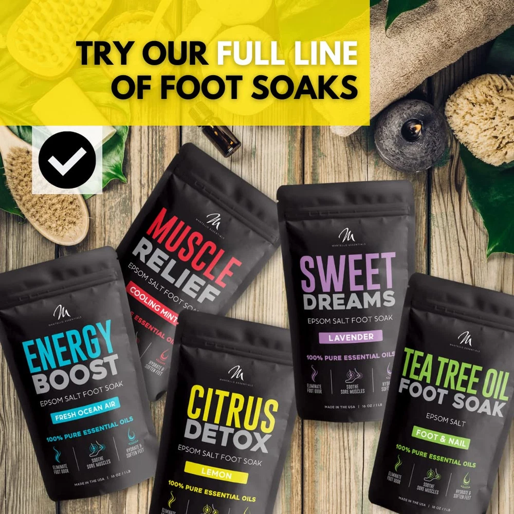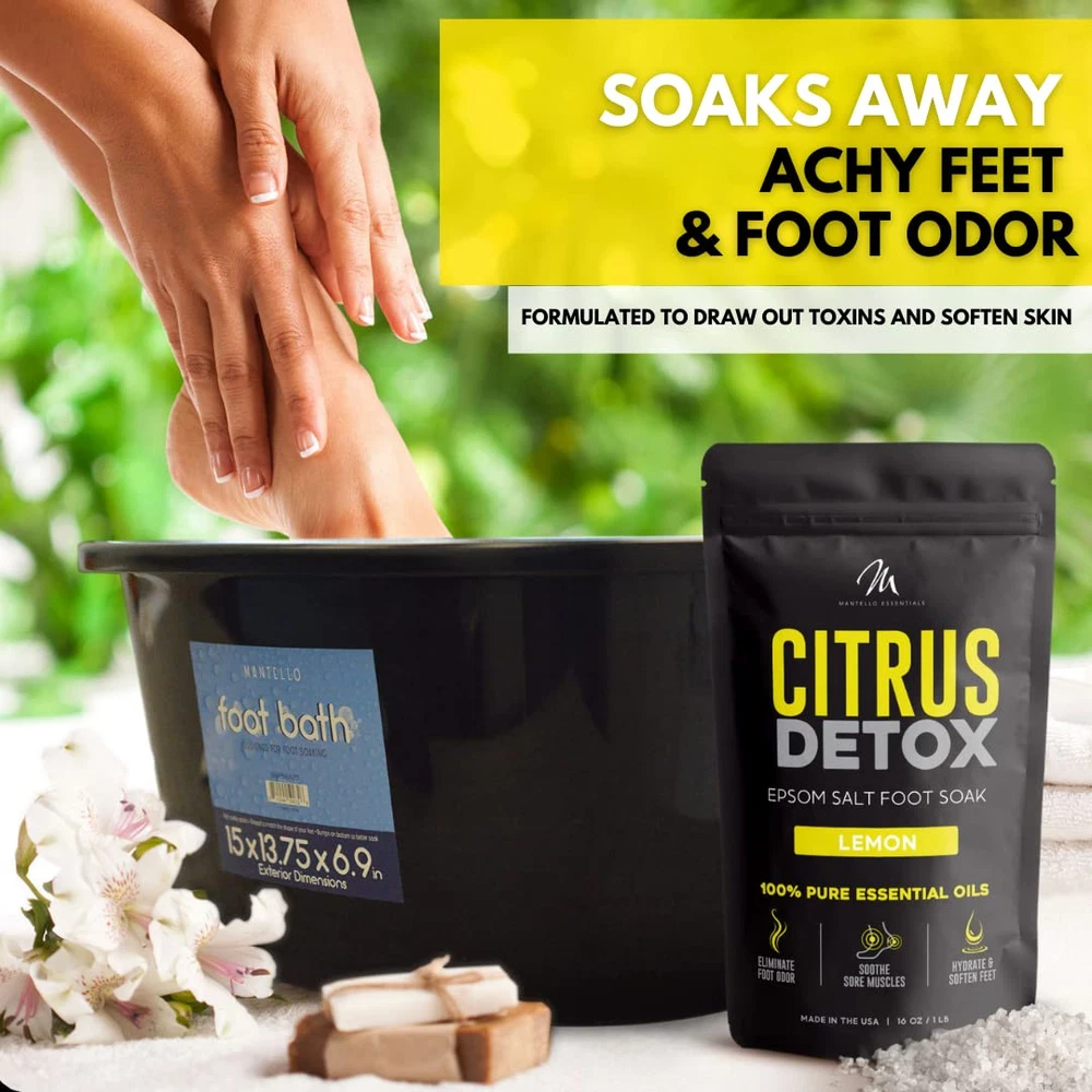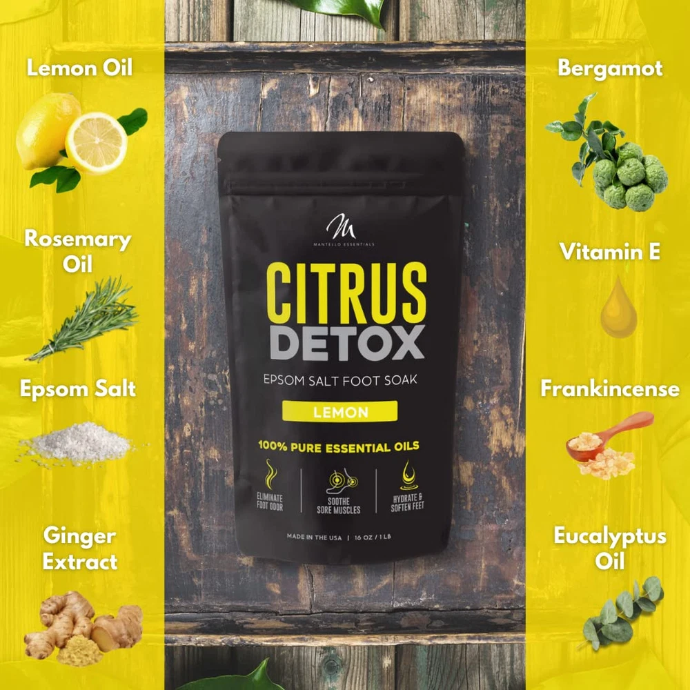 CITRUS DETOX FOOT BATH – Draw out dirt and toxins from tired feet with the Citrus Detox Foot Soak. An essential-oils-infused foot bath soak formulated to refresh and detox, this foot spa soak is the best way to revitalize your feet. MADE IN THE USA – Our foot detox soak is made in the USA with the highest standards for ingredients and essential oils in our feet soaking products. You can trust that you are getting the best foot care with no harsh chemicals or additives! BABY SOFT FEET – Our unique foot soaker blend of Epsom salt and essential oils not only soothes tired muscles, but also helps eliminate foot odor, and softens calluses and skin. A suitable foot soak for fungus toenails and treats the symptoms of Athlete's foot. INGREDIENTS YOU CAN TRUST – The ultimate foot soak for dry cracked feet, rich with all-natural ingredients: Epsom salts for soaking feet, sea salt, vitamin E, lemon oil, bergamot oil, eucalyptus, ginger extract, rosemary, and frankincense. FULL FOOT SOAK SALTS LINE – Our body detox foot soak line ranges from Tea Tree Oil foot soak to Sweet Dreams Lavender to Citrus Detox foot soak. Try our full range of foot care products, including our feet soaking tub, and treat your feet!