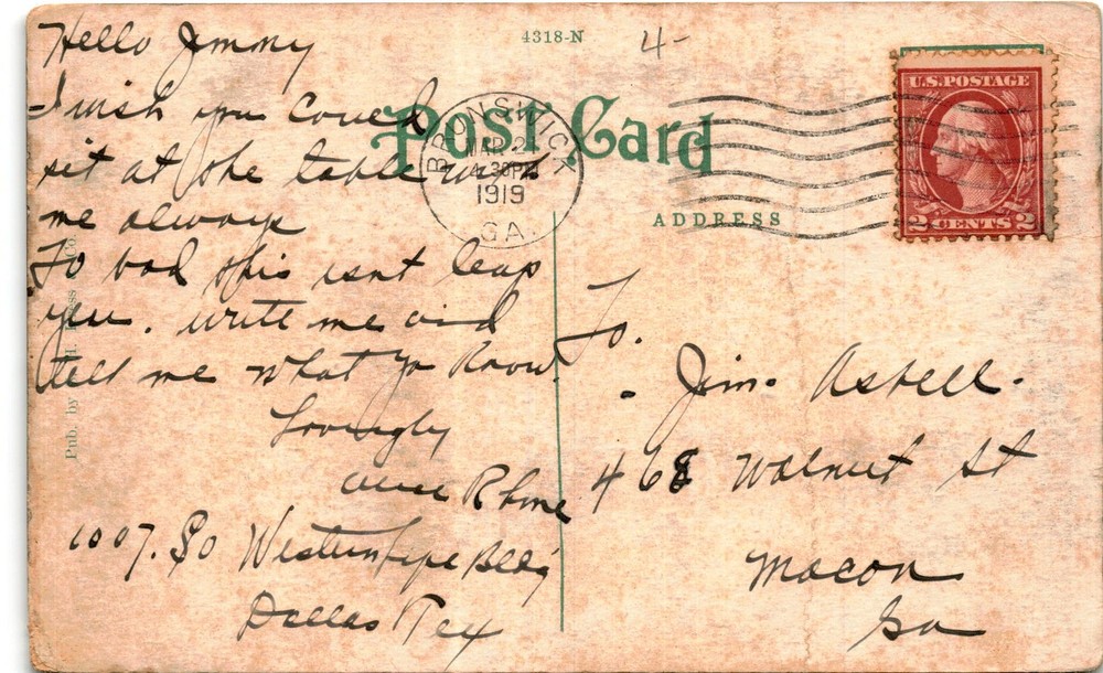 The postcard is a vintage image of the City Hospital in Brunswick, Georgia, dating back to 1889. The front of the postcard features a handwritten message from 1919 addressed to someone named Immy. The sender mentions sitting at the tacost bare and asks Immy to write back and tell them something about zu Krone.