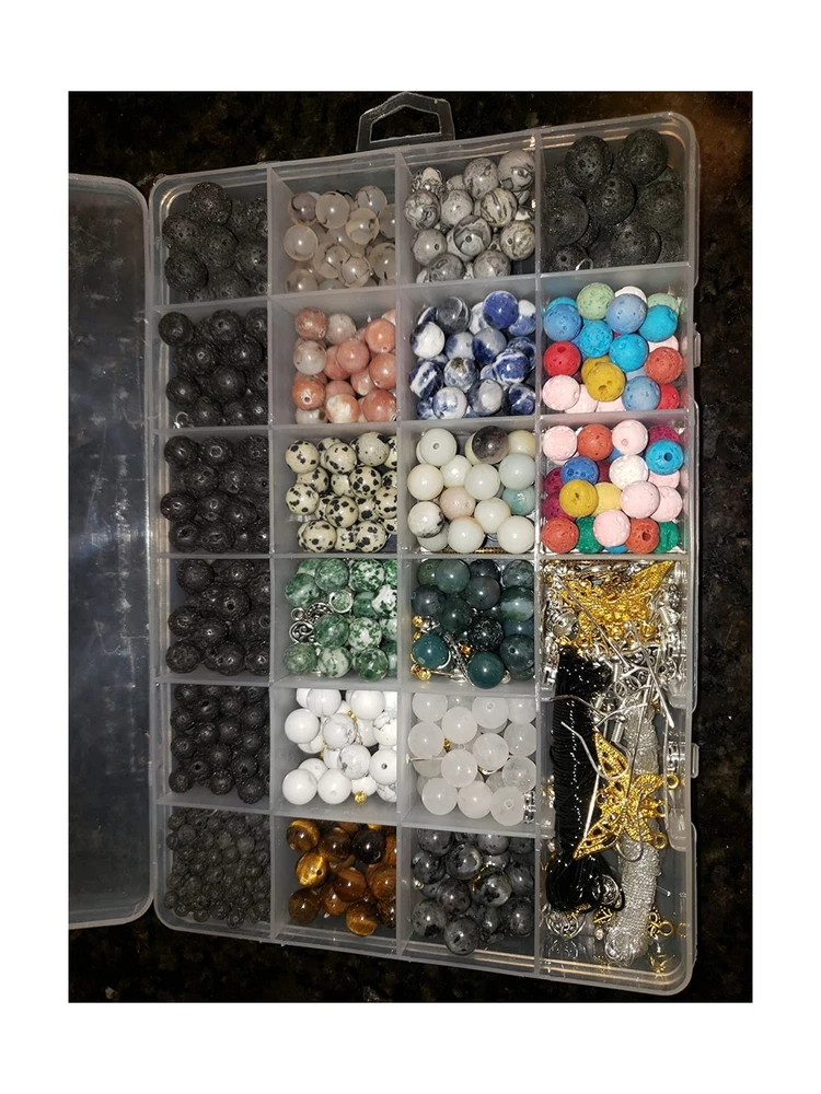 Civilipi 474pcs Bracelet Stone Bead for Jewelry Making Lava Rock Beads Gemstone Beads 8mm Round Stone Loose Beads with Crystal String Spacer Bead Product Details Color: Blue,White Theme: Jewelry,Lava Material: Stone, Crystal Size: Small Number of Pieces: 474 Color: Blue,White Theme: Jewelry,Lava Material: Stone, Crystal Size: Small Number of Pieces: 474 Style: Round UPC: 655887657276 Manufacturer: XYZ-0032 Package Dimensions: 9.25 x 6.57 x 0.98 inches Item model number: XYZ-0032 Item Weight: 1.04 pounds Date First Available: September 26, 2020 Package included: 4mm lava bead has 100pcs, 6mm lava bead has 30pcs, 8mm lava bead has 60pcs, 10mm lava bead has 24pcs, 8mm colored lava bead has 40 pcs The lava beads are natural stone beads, finished with heat treating and surface polishing, Great gift for your friends and yourself.When I put it on, I feel soft and comfortable. I can't bear to take it because I have a good mood These natural black lava beads and beads are good for jewelry making and design,arts and craft,DIY gift,making necklace bracelet, yoga bracelet, earring or ring ASSORTED BEADS,You can use your imagination to creat a beautiful lava bracelets or others,mothers day gift for mom,add an exotic beauty to almost you DIY produc 20pcs x 8mm tiger eye 20pcs x 8mm howlite 20pcs x 8mm mossy jade 20pcs x 8mm Dalmatian Jasper 20pcs x 8mm Red Plum Stone Beads 20pcs x 8mm Black Dragon Vein Agate 20pcs x 8mm Larvikite Labradorite 20pcs x 8mm white jade 20pcs x 8mm natural moss agate 20pcs x 8mm amazonite bead 20pcs x 8mm Natural White Blue Sodalite Stone Beads 20pcs x 8mm map gemstone