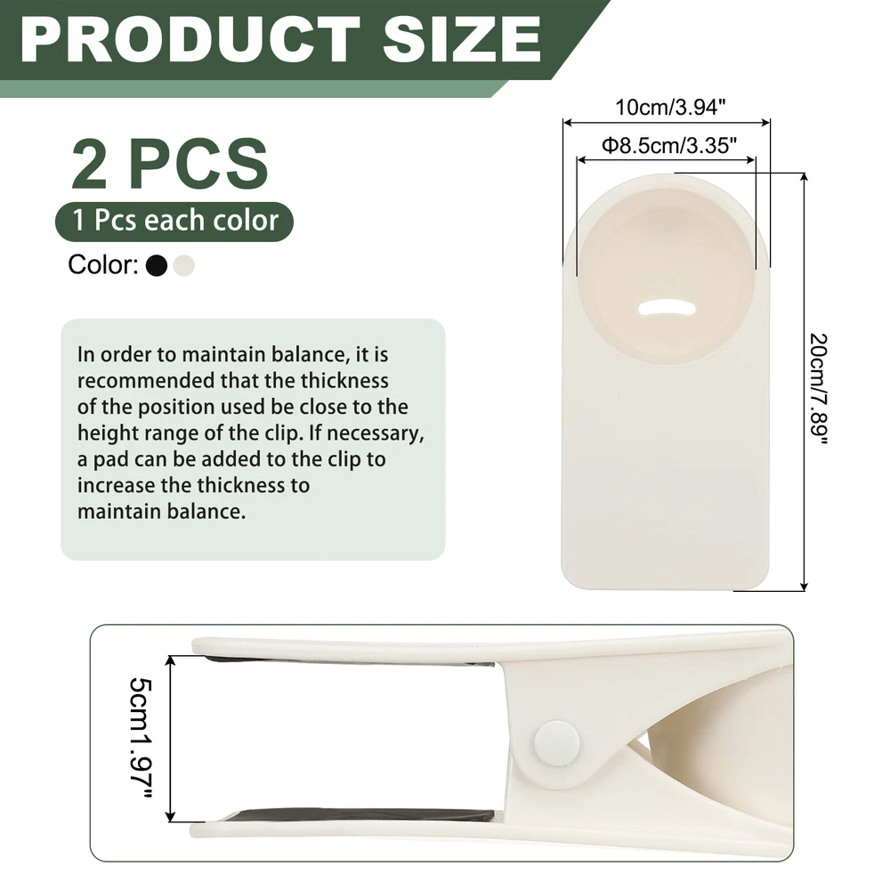 Document The product is made of plastic and metal with a black sponge pad at the cleat to provide a good grip and hold tightly to the edge of the table and chair to prevent scratching. The cup holder has openings on the bottom, can be used to dispense cold drink condensation or to thread a cable when charging a cell phone. Suitable for all kinds of bottles and cups, you can also use it as an organizer, use it on boats, beach chairs, patio chairs, swings, and desks.SpecificationColor: Black, WhiteMaterial: ABS, MetalCup Holder Size: 8.5x7.5x4.8 cm / 3.35x2.95x1.89 inchMaximum Clip Distance: 5 cm / 1.97 inchPackage Included: Cup Holder Clip x 2AdvantageClips onto the desktop to save space and reduce the risk of spills.Holds not only drinks, but also cell phones, stationery and more.InstallationClamp the cup holder firmly to the edge and push it in to the end to ensure that it is securely placed, clean the cup holder after use to ensure that it is dry and hygienic.To keep the clamps balanced, you can put padding at the clamps depending on the usage scenario.NoteEnsure that the tabletop thickness does not exceed the maximum limit of the product.Although the ABS material can withstand beverages at any temperature, avoid placing hot items for extended periods of time. Clamp on Table Bottle Clip Couch Holder for Desk Chairs, Black, White, 2 Pcs The product is made of plastic and metal with a black sponge pad at the cleat to provide a good grip and hold tightly to the edge of the table and chair to prevent scratching. The cup holder has openings on the bottom, can be used to dispense cold drink condensation or to thread a cable when charging a cell phone. Suitable for all kinds of bottles and cups, you can also use it as an organizer, use it on boats, beach chairs, patio chairs, swings, and desks. Specification Color: Black, White Material: ABS, Metal Cup Holder Size: 8.5x7.5x4.8 cm / 3.35x2.95x1.89 inch Maximum Clip Distance: 5 cm / 1.97 inch Package Included: Cup Holder Clip x 2 Advantage Clips onto the desktop to save space and reduce the risk of spills. Holds not only drinks, but also cell phones, stationery and more. Installation Clamp the cup holder firmly to the edge and push it in to the end to ensure that it is securely placed, clean the cup holder after use to ensure that it is dry and hygienic. To keep the clamps balanced, you can put padding at the clamps depending on the usage scenario. Note Ensure that the tabletop thickness does not exceed the maximum limit of the product. Although the ABS material can withstand beverages at any temperature, avoid placing hot items for extended periods of time. Hot Item Payment 1.We accept eBay payment . 2.Payment must be received within 7 business days of auction closing. Shipping 1.We ship to your eBay or Paypal address. Please make sure your eBay and Paypal address is correct before you pay. 2.Items will be shipped within 1-3 business day when we received payment. 3.Delivery time depends on destination and other factors. Description Policy Clamp on Table Bottle Clip Couch Holder for Desk Chairs, Black, White, 2 Pcs The product is made of plastic and metal with a black sponge pad at the cleat to provide a good grip and hold tightly to the edge of the table and chair to prevent scratching. The cup holder has openings on the bottom, can be used to dispense cold drink condensation or to thread a cable when charging a cell phone. Suitable for all kinds of bottles and cups, you can also use it as an organizer, use it on boats, beach chairs, patio chairs, swings, and desks. Specification Color: Black, White Material: ABS, Metal Cup Holder Size: 8.5x7.5x4.8 cm / 3.35x2.95x1.89 inch Maximum Clip Distance: 5 cm / 1.97 inch Package Included: Cup Holder Clip x 2 Advantage Clips onto the desktop to save space and reduce the risk of spills. Holds not only drinks, but also cell phones, stationery and more. Installation Clamp the cup holder firmly to the edge and push it in to the end to ensure that it is securely placed, clean the cup holder after use to ensure that it is dry and hygienic. To keep the clamps balanced, you can put padding at the clamps depending on the usage scenario. Note Ensure that the tabletop thickness does not exceed the maximum limit of the product. Although the ABS material can withstand beverages at any temperature, avoid placing hot items for extended periods of time. Hot Item Payment 1.We accept eBay payment . 2.Payment must be received within 7 business days of auction closing. Shipping 1.We ship to your eBay or Paypal address. Please make sure your eBay and Paypal address is correct before you pay. 2.Items will be shipped within 1-3 business day when we received payment. 3.Delivery time depends on destination and other factors.