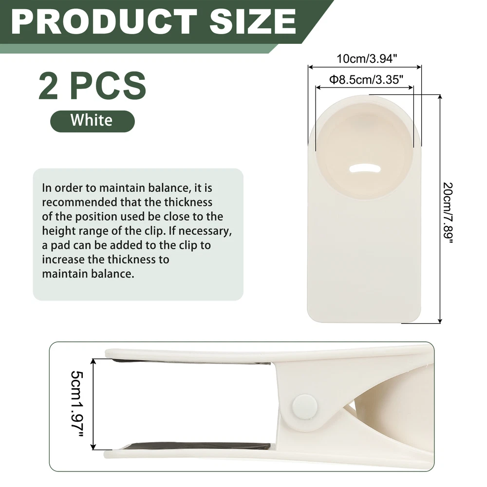 Document The product is made of plastic and metal with a black sponge pad at the cleat to provide a good grip and hold tightly to the edge of the table and chair to prevent scratching. The cup holder has openings on the bottom, can be used to dispense cold drink condensation or to thread a cable when charging a cell phone. Suitable for all kinds of bottles and cups, you can also use it as an organizer, use it on boats, beach chairs, patio chairs, swings, and desks.SpecificationColor: WhiteMaterial: ABS, MetalCup Holder Size: 8.5x7.5x4.8 cm / 3.35x2.95x1.89 inchMaximum Clip Distance: 5 cm / 1.97 inchPackage Included: Cup Holder Clip x 2AdvantageClips onto the desktop to save space and reduce the risk of spills.Holds not only drinks, but also cell phones, stationery and more.InstallationClamp the cup holder firmly to the edge and push it in to the end to ensure that it is securely placed, clean the cup holder after use to ensure that it is dry and hygienic.To keep the clamps balanced, you can put padding at the clamps depending on the usage scenario.NoteEnsure that the tabletop thickness does not exceed the maximum limit of the product.Although the ABS material can withstand beverages at any temperature, avoid placing hot items for extended periods of time. Clamp on Table Bottle Clip Couch Holder for Desk Chairs Mug, White, 2 Pcs The product is made of plastic and metal with a black sponge pad at the cleat to provide a good grip and hold tightly to the edge of the table and chair to prevent scratching. The cup holder has openings on the bottom, can be used to dispense cold drink condensation or to thread a cable when charging a cell phone. Suitable for all kinds of bottles and cups, you can also use it as an organizer, use it on boats, beach chairs, patio chairs, swings, and desks. Specification Color: White Material: ABS, Metal Cup Holder Size: 8.5x7.5x4.8 cm / 3.35x2.95x1.89 inch Maximum Clip Distance: 5 cm / 1.97 inch Package Included: Cup Holder Clip x 2 Advantage Clips onto the desktop to save space and reduce the risk of spills. Holds not only drinks, but also cell phones, stationery and more. Installation Clamp the cup holder firmly to the edge and push it in to the end to ensure that it is securely placed, clean the cup holder after use to ensure that it is dry and hygienic. To keep the clamps balanced, you can put padding at the clamps depending on the usage scenario. Note Ensure that the tabletop thickness does not exceed the maximum limit of the product. Although the ABS material can withstand beverages at any temperature, avoid placing hot items for extended periods of time. Hot Item Payment 1.We accept eBay payment . 2.Payment must be received within 7 business days of auction closing. Shipping 1.We ship to your eBay or Paypal address. Please make sure your eBay and Paypal address is correct before you pay. 2.Items will be shipped within 1-3 business day when we received payment. 3.Delivery time depends on destination and other factors. Description Policy Clamp on Table Bottle Clip Couch Holder for Desk Chairs Mug, White, 2 Pcs The product is made of plastic and metal with a black sponge pad at the cleat to provide a good grip and hold tightly to the edge of the table and chair to prevent scratching. The cup holder has openings on the bottom, can be used to dispense cold drink condensation or to thread a cable when charging a cell phone. Suitable for all kinds of bottles and cups, you can also use it as an organizer, use it on boats, beach chairs, patio chairs, swings, and desks. Specification Color: White Material: ABS, Metal Cup Holder Size: 8.5x7.5x4.8 cm / 3.35x2.95x1.89 inch Maximum Clip Distance: 5 cm / 1.97 inch Package Included: Cup Holder Clip x 2 Advantage Clips onto the desktop to save space and reduce the risk of spills. Holds not only drinks, but also cell phones, stationery and more. Installation Clamp the cup holder firmly to the edge and push it in to the end to ensure that it is securely placed, clean the cup holder after use to ensure that it is dry and hygienic. To keep the clamps balanced, you can put padding at the clamps depending on the usage scenario. Note Ensure that the tabletop thickness does not exceed the maximum limit of the product. Although the ABS material can withstand beverages at any temperature, avoid placing hot items for extended periods of time. Hot Item Payment 1.We accept eBay payment . 2.Payment must be received within 7 business days of auction closing. Shipping 1.We ship to your eBay or Paypal address. Please make sure your eBay and Paypal address is correct before you pay. 2.Items will be shipped within 1-3 business day when we received payment. 3.Delivery time depends on destination and other factors.