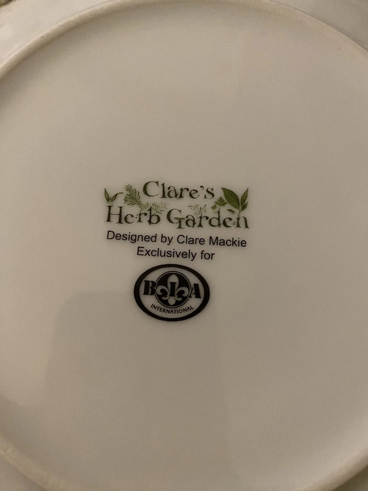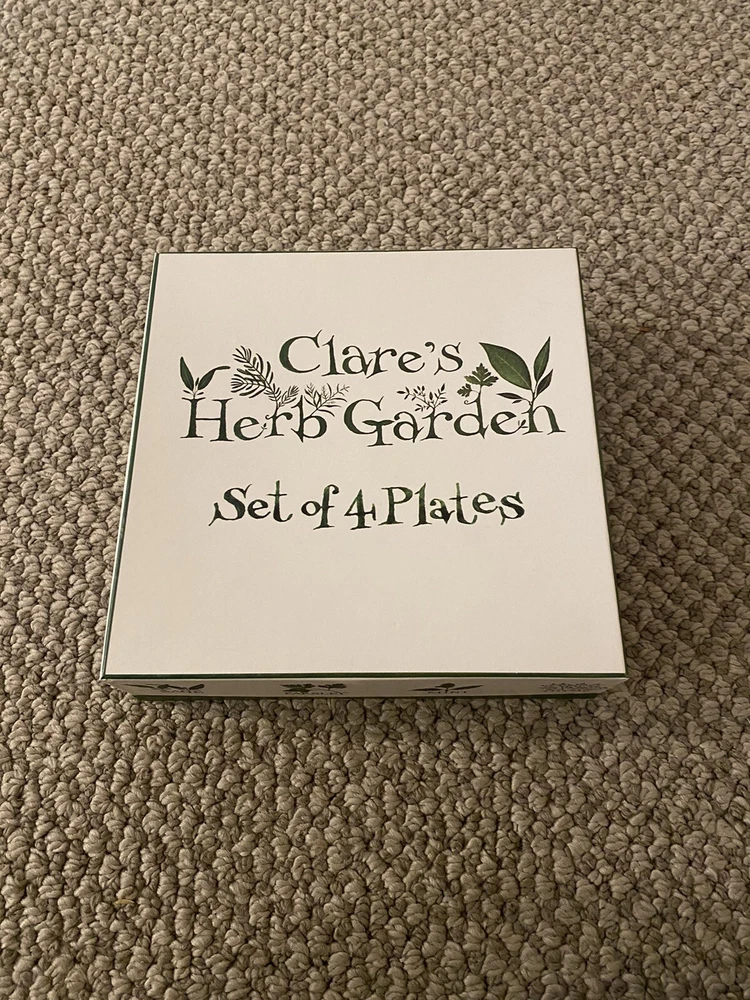 Absolutely lovely set of 4 appetizer or salad plates with herb design, never used in original box. Perfect condition. Great to use if you are putting out a charcuterie board!
