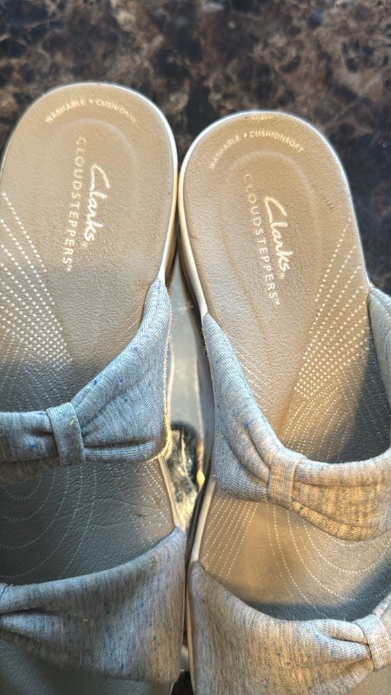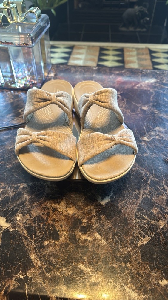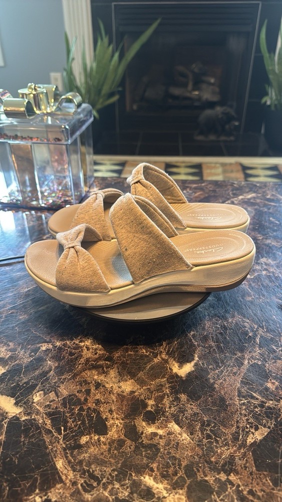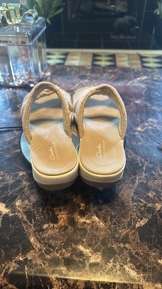 Experience elegance with Clarks beige slide sandals. The non-slip grip, breathable construction and cloud-light cushioning create these ultra-comfortable sandals. Ideal for everyday wear. Is a trip to the shore in your future? Slip into these supremely comfortable slides and you're ready for a day of boardwalk strolls and sightseeing. From Clarks Footwear. Style: Arla Coast Thick straps Lightweight footbed Approximately 1-5/8"H heel Fit: true to size Textile upper; man-made balance Machine washable