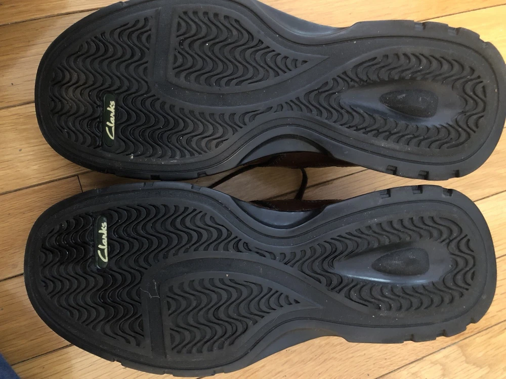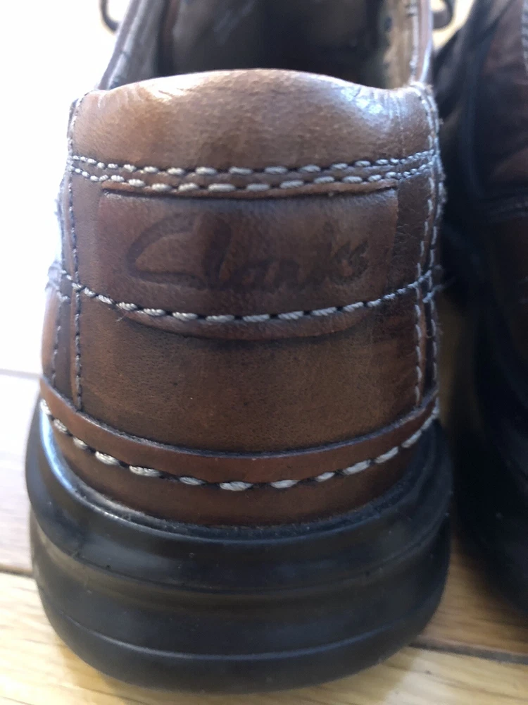 Clarks Men's Touareg Brown Two Toned Leather Lace Up Oxford 70852 Size 7.5 Gently worn shoes with some normal wear of leather on inside along eyelets and heel of right shoe. Please view photos. Comfortable, everyday shoes! Please feel free to contact me with any questions. Thank you for your interest.