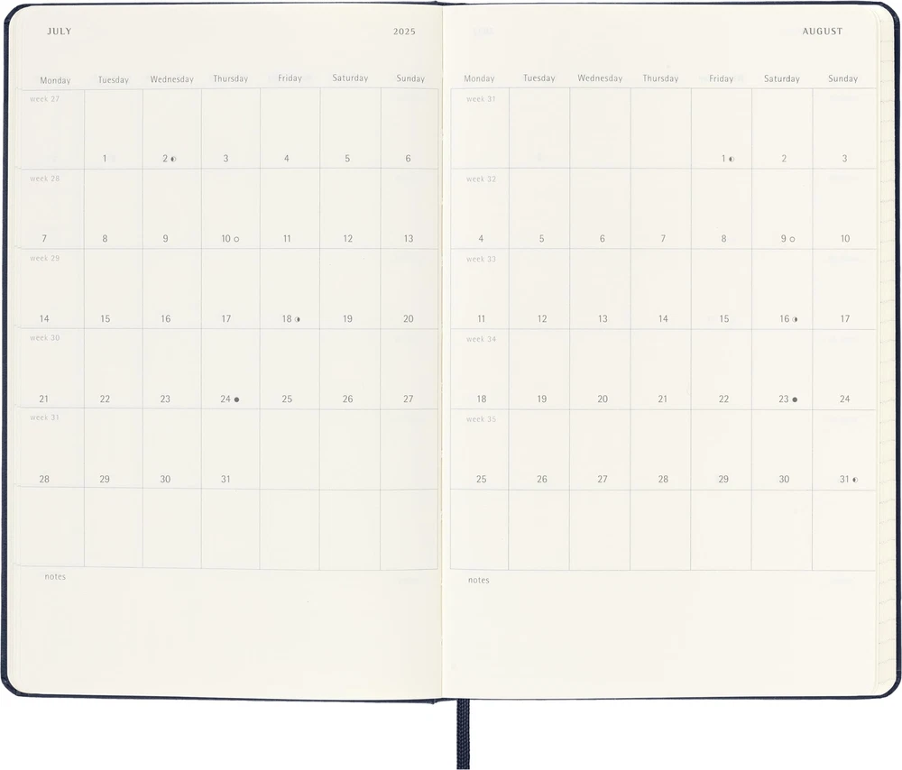 The 18-Month Weekly Notebook Diary/Planner runs from July to December. Formatted to show the week's appointments on the left and a ruled page for notes and ideas on the right, this popular planner style is perfect for students, teachers and professionals. - Dated from July 2024 to December 2025 - Sapphire Blue hard cover - Rounded corners, elastic closure and matching ribbon bookmark - Ivory-colored, 70 g/m², acid-free paper - Useful tools: calendar, travel planning, ideas and goals, ruled pages for notes - Stickers to customize your plans and year stickers for the spine - Color-coordinated expandable inner pocket - 'In case of loss' notice printed on the flyleaf - Lies flat, opens at 180° - Dimensions, 5" x 8.25" - The paper of this object is made of material from well-managed, FSC®-certified forests and other controlled sources. dated from July 2024 to December 2025 hard and soft cover available in a variety of colors; ivory-colored, 70 g/m², acid-free paper rounded corners, elastic closure and matching ribbon bookmark; color-coordinated expandable inner pocket useful tools: calendar, travel planning, ideas and goals, ruled pages for notes. Stickers to customize your plans and year stickers for the spine the paper of this object is made of material from well-managed, FSC -certified forests and other controlled sources.