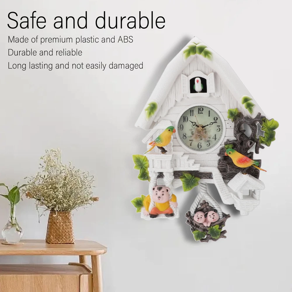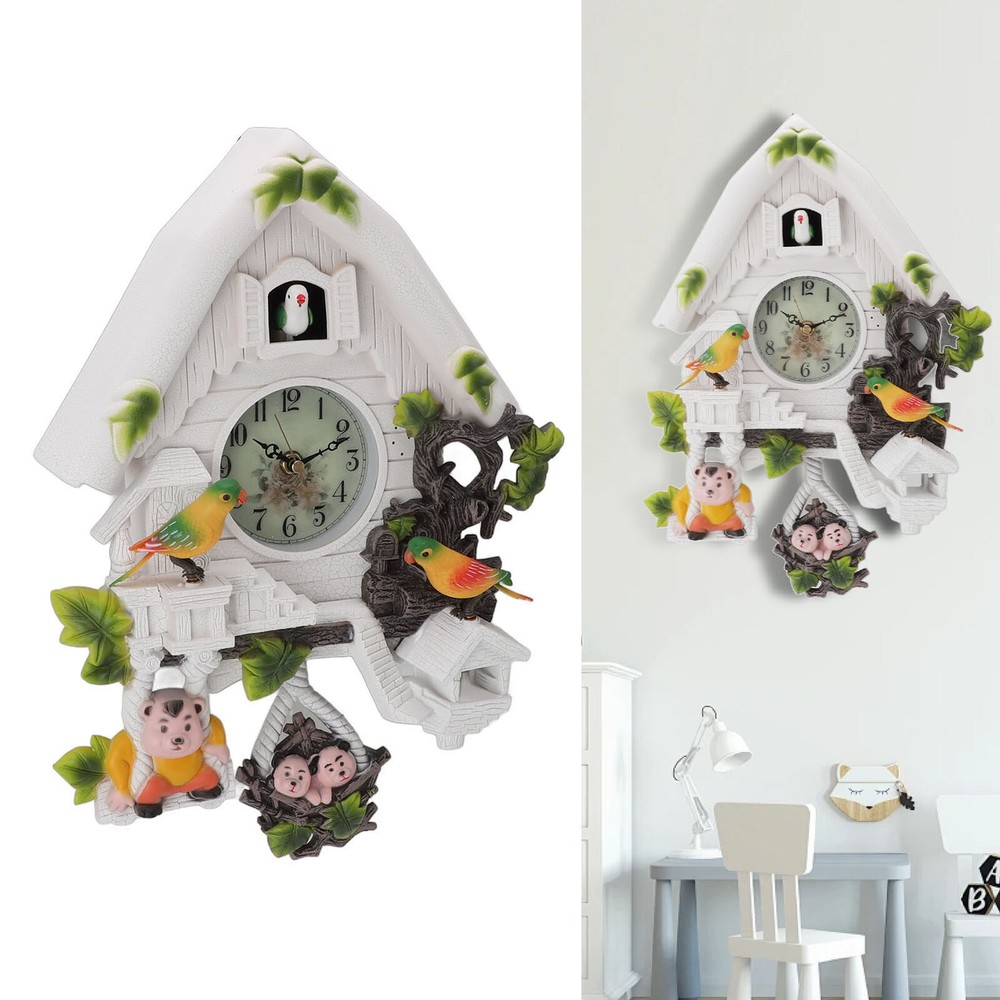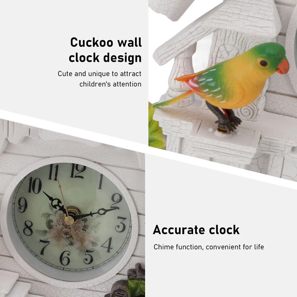 Feature: 1. EUROPEAN STYLE: The cuckoo tree house clock features a classic design, European style, white color decoration, adding to the home ambient. Suitable for hanging in various scenes. 2. CUTE AND UNIQUE: Adopting cuckoo tree wall clock design, cute and unique, attracting children's attention. Exquisite craftsmanship, excellent choice for home decoration. 3. SOUND CONTROL CHILDREN'S CLOCK: Sound control children's clock, suitable for placing in the living room or children's room. cuckoo birdhouse clock adopts silent , which ensures a quiet sleeping or working environment. 4. ACCURATE TIME, WHOLE TIME CHIMING: Cuckoo wall clock is accurate time with whole time chiming function, convenient for life. You will never miss an important moment again. 5. PREMIUM MATERIAL: The stylish modern wall clocks are made of premium plastic and ABS material, thick and , scratch resistance and long service life. Specification: Item Type: Cuckoo Clock Material: Plastic, ABS Weight: Approx. 994g/35.1oz Size: Approx. 27x9x40cm / 10.6x3.5x15.7in Color: White Battery: 5x1.5V AA Battery (Shipped Without Battery) Package List: 1 x Cuckoo Clock (Battery Not Included) 3 x Decorative Accessories Note: Manual measurement please allow some error.