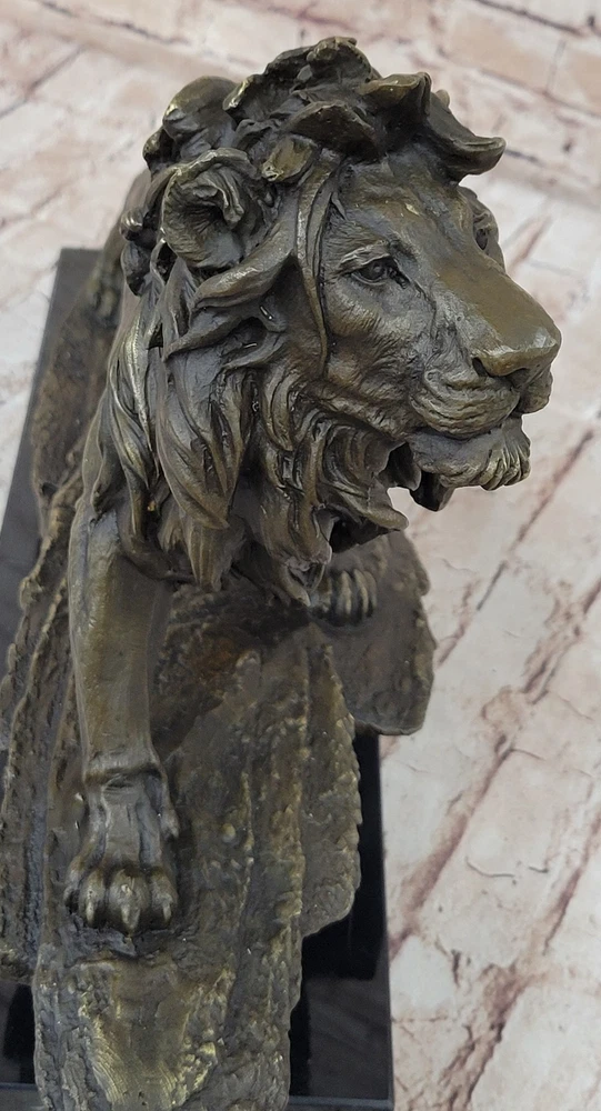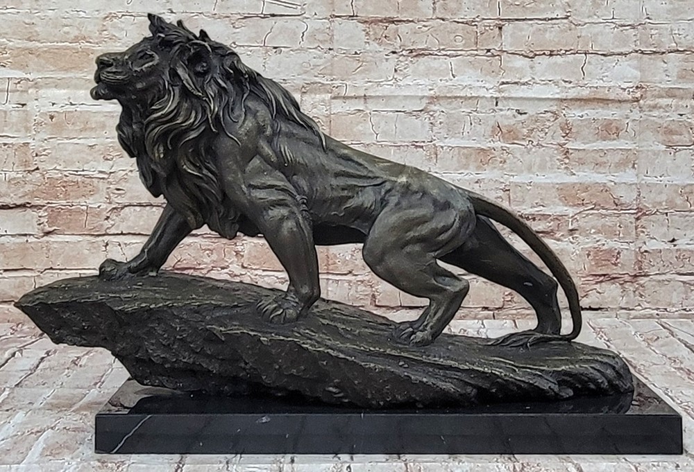 Classic Pure Bronze Copper Africa Lion Statue Evil Foo Dog Lion Sculpture Gift Classic Pure Bronze Copper Africa Lion Statue Evil Foo Dog Lion Sculpture Gift Condition : This sculpture is in perfect condition. Bronze Dimensions with Marble Base: Height 14" X Width 22" Marble Dimensions:18" X 6" Height without base:13" Weight:35 LBS Inventory:27YRD67814572 Behold the majestic presence of the regal lion in all its splendor, immortalized in this breathtaking bronze sculpture. As the golden sun dips below the horizon, casting its ethereal glow, the lion ascends a cliff with an air of undeniable authority. Its magnificent mane ripples in the plains winds, a testament to its untamed strength and dominance. With a commanding gaze, the lion surveys its kingdom, a realm teeming with life and vitality. This sculpture captures not only the lion's physical prowess but also its symbolic significance—a representation of courage, power, dignity, and the unwavering spirit of royalty. Crafted with meticulous attention to detail, this handmade bronze sculpture is a true testament to the artistry of the lost-wax casting method. The intricate textures of the lion's fur, the intensity of its expression, and the sense of motion as it climbs the cliff are all masterfully rendered. A rich brown patina finish both protects and enhances the sculpture's timeless beauty, ensuring its endurance for generations to come. Resting upon a dignified black marble base, this artwork bears the signature of the esteemed artist Barye, a mark of quality and exceptional craftsmanship. Invite the regal essence of the lion into your space with this remarkable bronze sculpture. Whether displayed in a home, office, or gallery, it serves as a profound reminder of the lion's enduring symbolism and its role as a guardian of power and wisdom. As a focal point of admiration and contemplation, this sculpture encapsulates the very essence of majesty and strength. Extra Large Wild African Lion on Prowl Wildlife Safari Bronze Sculpture by Barye www.bronzhaus.com Video will open in a new window Using the eBay App? Paste link into a browser window: [isdntekvideo] Shipping Terms : Most of our items are shipped via USPS (United States Postal Service) mail or UPS. Most orders are shipped within 24-48 hours of purchase. Please be aware that not all items are available for USPS shipping due to size and weight. We do ship to Hawaii, Alaska, Canada, Puerto Rico, APO/AE, and U.S. Virgin Islands, however, an additional charge may be required. Please contact us before making any purchases in these areas. For Non-USA customers, you may be responsible for all duty, tax, brokerage fees that may be due upon delivery (shipping costs cover freight charges only). We also ship internationally. Please refer to the "Shipping and Handling" chart for the rates for each area. Payment : We accept just about any form of payment. PayPal, Master Card, Visa or American Express credit cards. Money orders, cashiers checks, and even personal or business checks. For governmental institutions, we will also accept a purchase order. Please understand that for personal or business checks we have to wait for the check to clear (usually 7 days) before shipping. Condition : New Detailed Hand Crafted Hot Cast Bronze Satisfaction Guaranteed. This is Stock Photo, Slight Color Variation!! Listing and template services provided by inkFrog