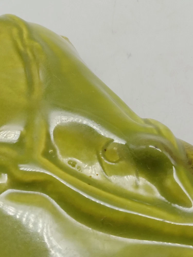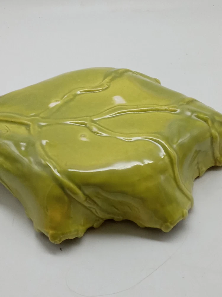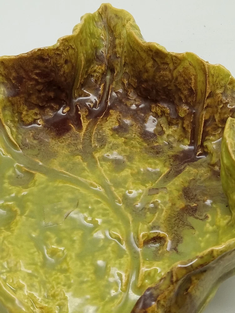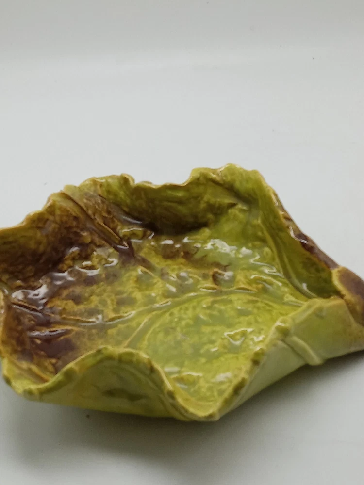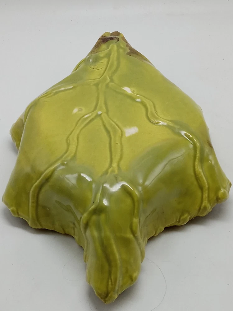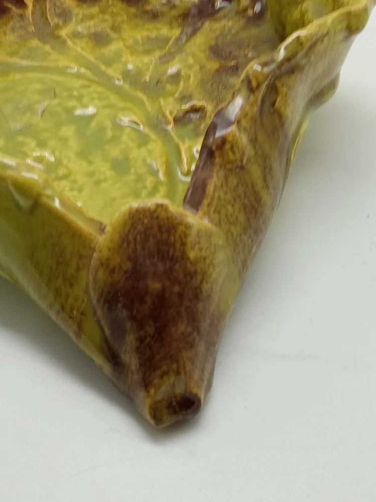 This beautiful decorative bowl features a leaf pattern on its surface, with realistic browns and greens. The bowl is made of clay and has a nice glaze. It's perfect for storing small trinkets, candy, or nuts, and would be a great addition to any collection. The bowl is unmarked and its origin is unknown, but its handmade production style and pottery technique give it a unique character. The set includes one bowl and its backstamp reads 61 or 19 (unclear). Don't miss the chance to own this beautiful piece of art pottery, which will add a touch of natural beauty to any space. 10.5 inch long 7 inch wide 2 inch deep Unique