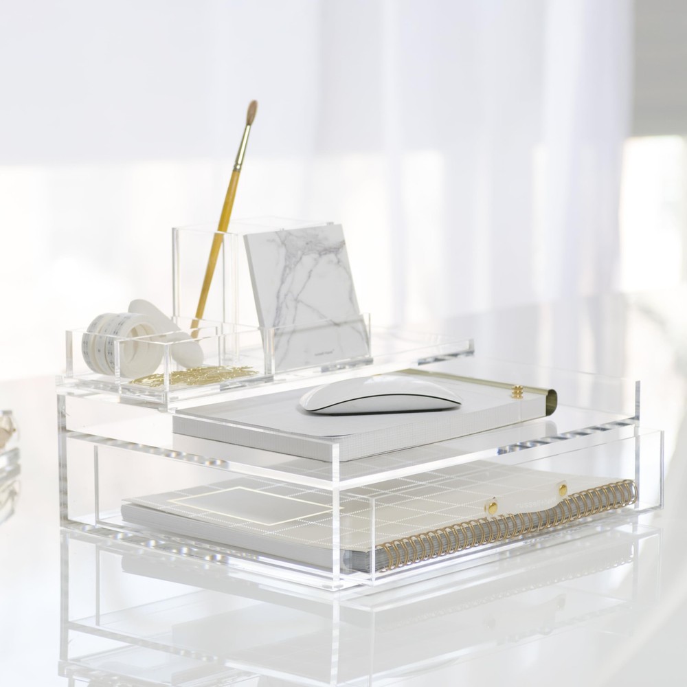 Pass up the ordinary for an aesthetically satisfying 12.5” x 10.5” x 3.75” acrylic inbox and drawer combination that brings inspiration and beauty to your desk. With a thin, side-loading paper tray on top of an elegant storage drawer, this organizing solution demands attention by shifting the focus away from itself and toward your work. Durably constructed from hard cast acrylic with finely polished edges and gold toned hardware. Simply perfect on its own, this document tray and drawer integrates with the other pieces in our Stackable Bloc collection, including our acrylic inbox, valet + collator, and the acrylic pencil bloc. The world of lies at the intersection of color, function and light-heartedness. We have an instantly recognizable style language, developed through colors and patterns that capture the essence of who we are and what we stand for. Our philosophy is that good design is not over-design or design for design’s sake, rather pleasing design with loads of functionality. While fresh in spirit, the products represent a constant and complete dedication to quality. Keep your inbox tidy and organized; our 12.5” x 10.5” x 3.75” side load letter tray with integrated drawer in clear acrylic gives clutter nowhere to hide, inspiring you to stay on top of the workflow Fresh and inspiring design; fashion and function converge in a distinctive yet unassuming design that will elevate your workspace at home or in the office A modest presence on your desk; the low profile and neat footprint helps keep your desktop orderly and approachable Where style meets substance; crisp modern design realized with flawless, polished edge construction and gold toned hardware. Rubber Handle Expanding to meet your needs; enjoy the simplicity of an inbox and drawer, or use in conjunction with our Stackable Bloc line of acrylic desk accessories