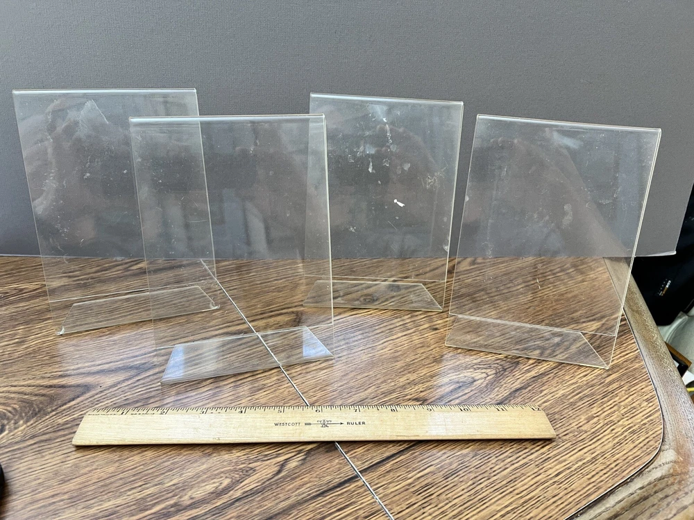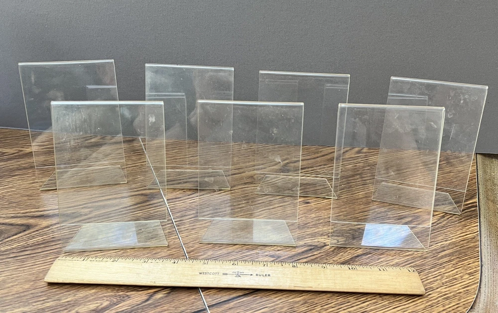 This set of clear angled acrylic photo/sign holders is perfect for displaying your favorite memories or signs . The set includes seven (7) 5 x 3.5 inch and four (4) 7 x 5 inch holders. Each holder can hold one photo or sign, providing a sleek and stylish way to showcase your collection. The holders are made with a durable and high-quality acrylic plastic, ensuring that your photos or signs will be safely displayed for years to come. The 5" x 7" size is commonly used in banquets, conferences, and other dining facilities. The acrylic frame allows easy changing out of photos or graphics. The clear color of the holders makes them a versatile addition to any room adding to the unique and timeless appeal of these photo/sign holders. Whether you're a professional photographer, business owner or just looking to display your family photos or signs, this set of clear acrylic photo or sign holders is a must-have. Holders are used and may have scratches, stains, small cracks and/or soiled areas and all will need a good cleaning. Please see photos for cosmetic condition.