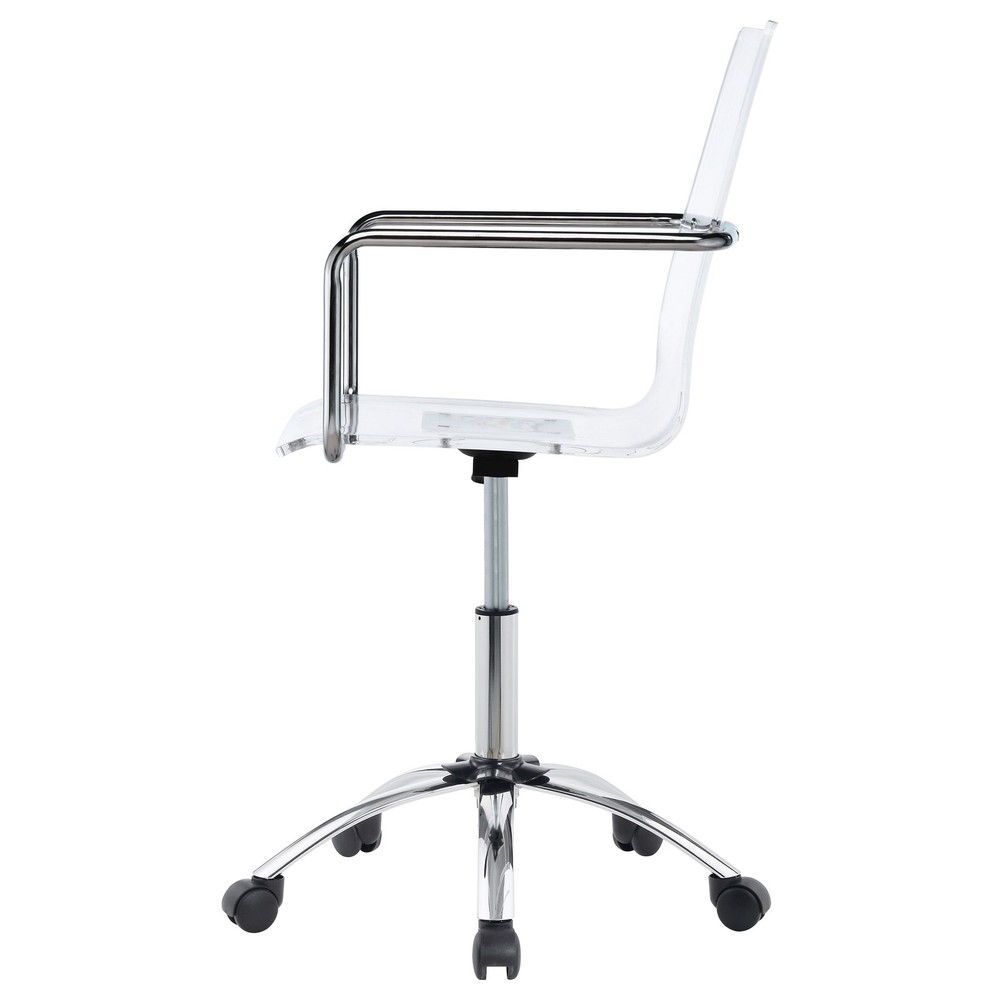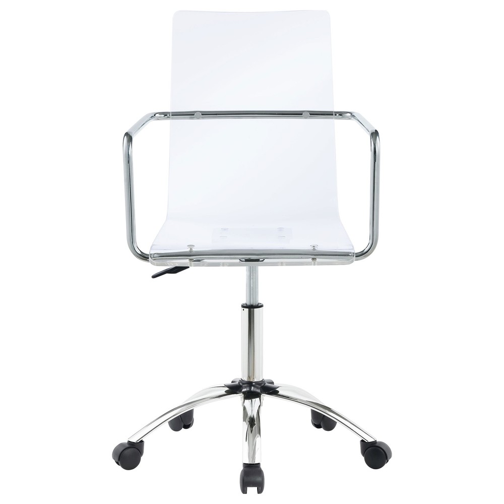 Bring a futuristic look to a home or business office with this contemporary clear acrylic and chrome office chair. Its ingenue blend of materials and ergonomically pleasing build features adjustable seat heights and the ease of movement on caster wheels.Features:Set includes: One (1) chairMaterials: Acrylic and MetalFinish: Clear and ChromeSpecial Features:Style: ContemporaryDiameter and material of base: 535mm metalDiameter and material of wheel: 50mm plasticScopping seat: NoThickness of mechanism: 1.4mmType of base: 5 claws in chrome metalType of mechanism: SwivelType of seating: Clear acrylic seatWeight limit: 200 lbs.Dimensions:Chair dimensions: 34.75 inches high x 23.5 inches wide x 23.5 inches deepSeat dimensions: 18 inches high x 16 inches deepThis product will ship to you in one Free Shipping Over $49.99* Details Amaturo Acrylic Adjustable Home Office Desk Chair Clear Product Description: Bring a futuristic look to a home or business office with this contemporary clear acrylic and chrome office chair. Its ingenue blend of materials and ergonomically pleasing build features adjustable seat heights and the ease of movement on caster wheels. Features: Set includesOne (1) chair MaterialsAcrylic and Metal FinishClear and Chrome Special Features: StyleContemporary Diameter and material of base535mm metal Diameter and material of wheel50mm plastic Scopping seatNo Thickness of mechanism1.4mm Type of base5 claws in chrome metal Type of mechanismSwivel Type of seatingClear acrylic seat Weight limit200 lbs. Dimensions: Chair dimensions34.75 inches high x 23.5 inches wide x 23.5 inches deep Seat dimensions18 inches high x 16 inches deep This product will ship to you in one (1) box. Accessories pictured are NOT included. Assembly required. Assembly Required
