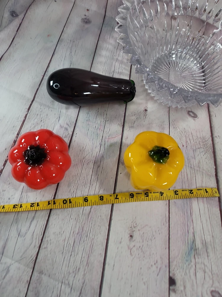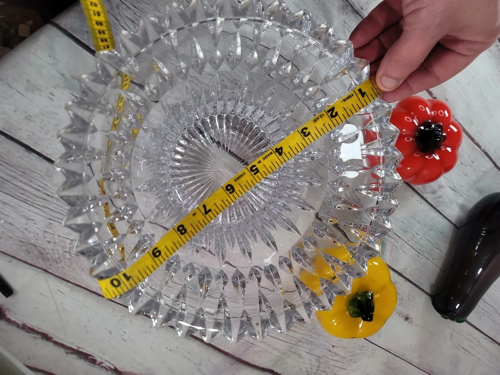 Vintage Clear Crystal Hostest Bowl Table Centerpiece Glass Vegetables Home Decor. Bowl is 10" wide 4.5" tall Glass Vegetables included are glass eggplant, pepper, and tomato Please let us know if you have any questions or concerns regarding this item or any other item in our store. Thank you for your interest! /spacecowboy