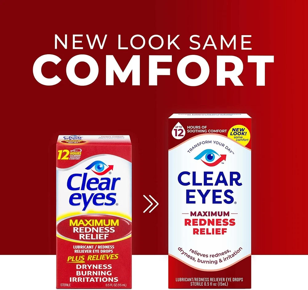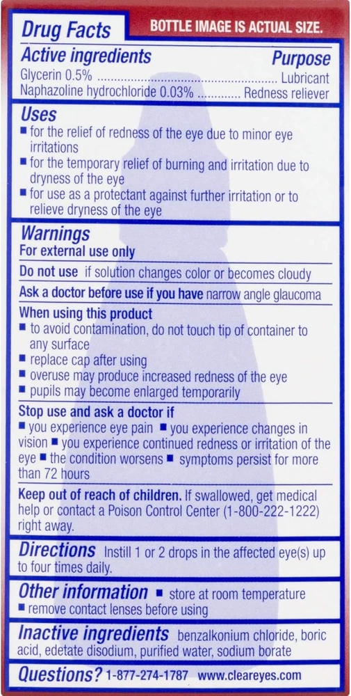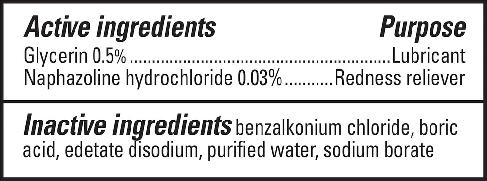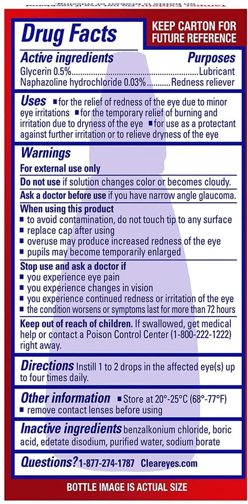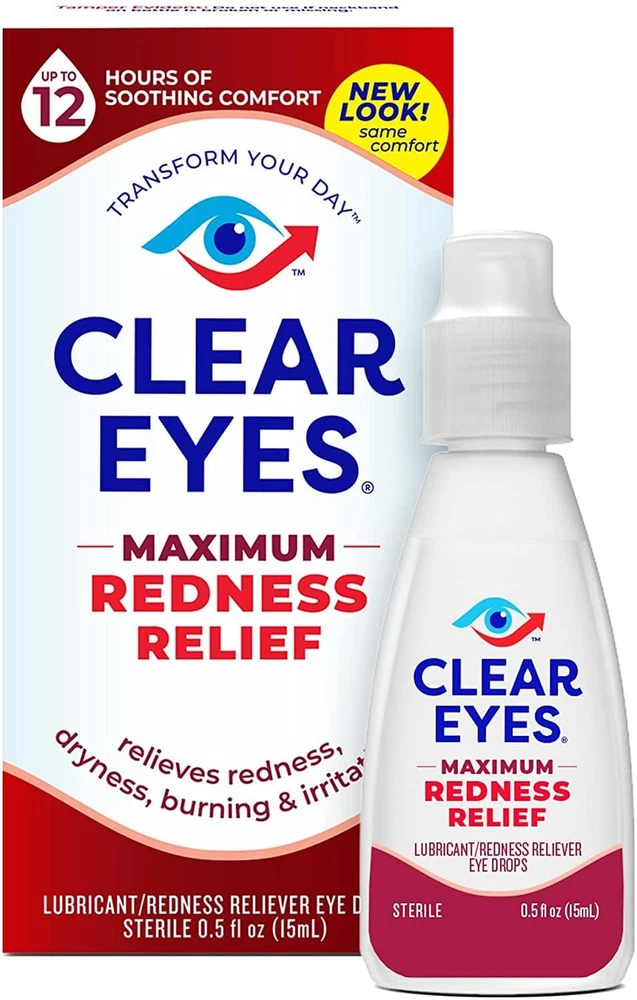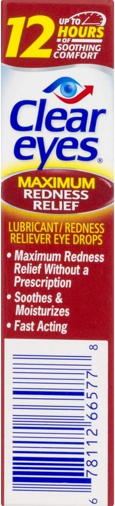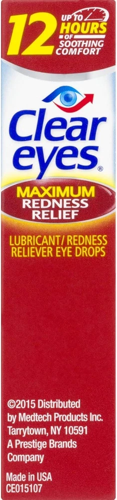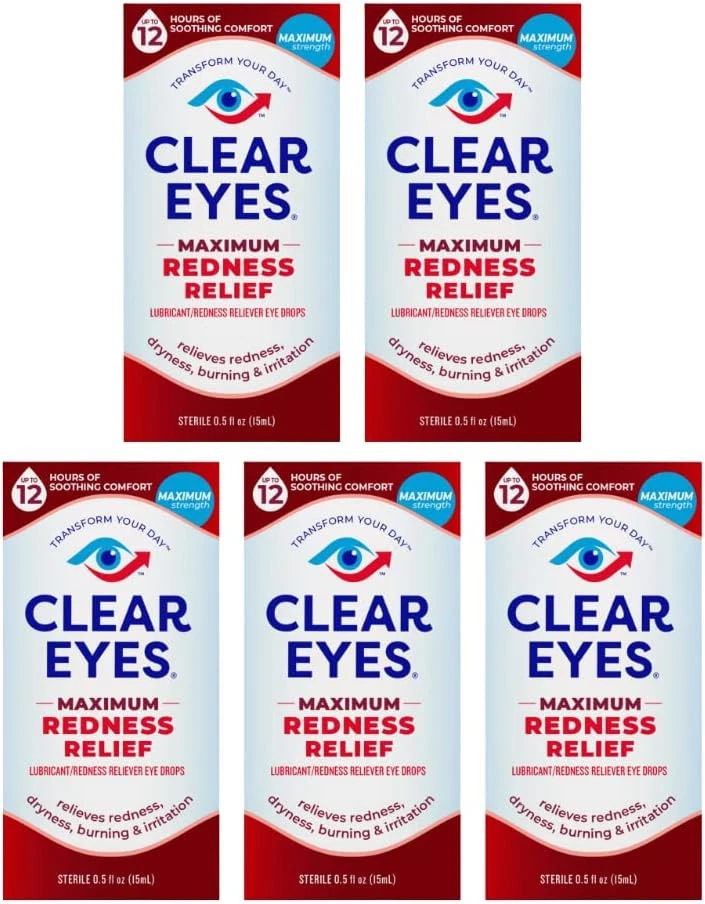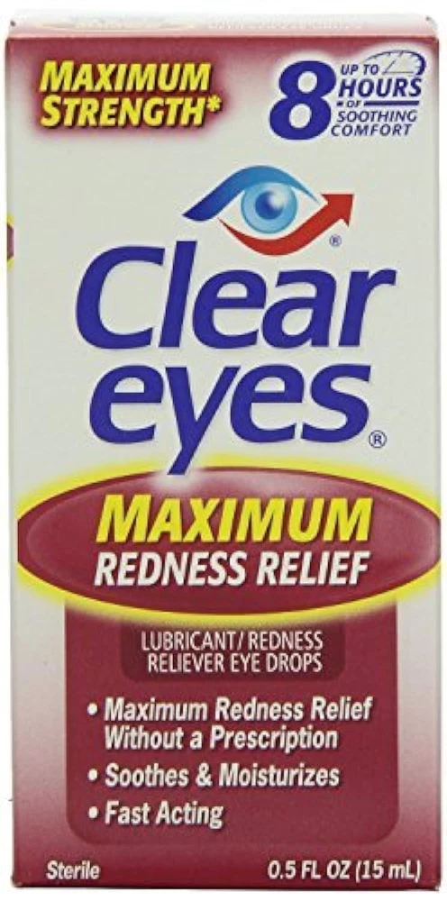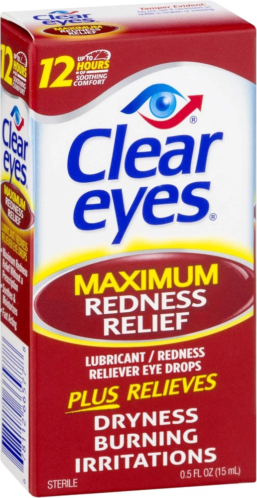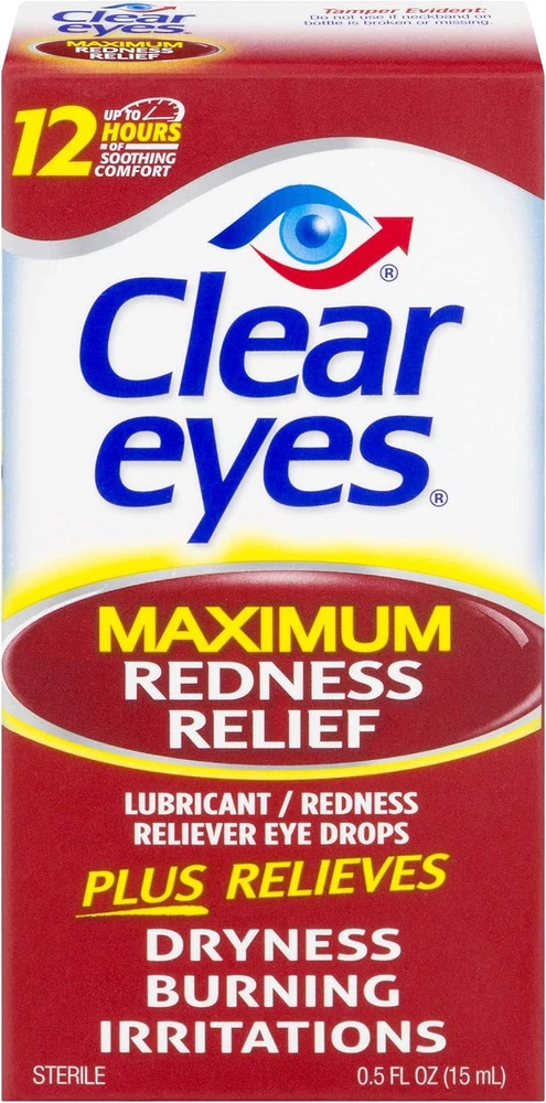 Clear Eyes Maximum Redness Eye Relief Lubricant Eye Drops 0.5 Fl Oz (Pack Of 1) Clear Eyes Maximum Redness Relief Eye Drops provide maximum strength relief from redness and irritation and up to 12 hours of soothing comfort. Clear Eyes Maximum Redness Relief Eye Drops contain the maximum strength redness relief available without a prescription. Clear Eyes Maximum Redness Relief Eye Drops soothe and moisturize to relieve irritation, burning and dry eyes and help to protect against further irritations. Clear Eyes Maximum Redness Relief Eye Drops are clinically proven to whiten eyes for a difference you can see (compared to untreated eyes). About this item Maximum Strength Relief: Offers maximum strength relief from redness and irritation in the eyes without a prescription. Long-Lasting Soothing Comfort: Provides up to 12 hours of soothing comfort, easing symptoms of burning, dryness, and irritation. Moisturizing Formula: Soothes and moisturizes the eyes to relieve irritation and helps protect against further irritations. Clinically Proven Whitening Effect: Clinically proven to visibly whiten eyes, offering a noticeable difference compared to untreated eyes. Wide Range of Relief: Specially formulated to alleviate redness, itchiness, burning, grittiness, and dryness in the eyes. Contains maximum strength redness relief available without a prescription Relieves burning and irritation due to eye dryness and helps to protect against further irritations Clinically proven whiter eyes for a difference you can see (compared to untreated eyes) FSA- and HSA-eligible product in the U.S. Clear Eyes Maximum Redness Relief Eye Drops provide maximum strength redness relief without a prescription Relieves red eyes, plus relieves dryness, burning, and other irritations Helps protect against further irritations Ingredients Active ingredients - Purpose. Glycerin 0.5% - Lubricant. Naphazoline hydrochloride 0.03% - Redness Reliever. Inactive Ingredients: Benzalkonium Chloride, Boric Acid, Edetate Disodium, Purified Water, Sodium Borate.