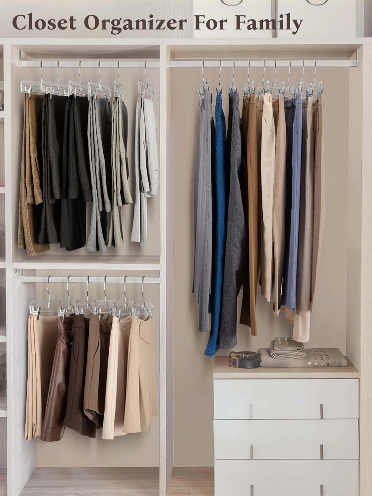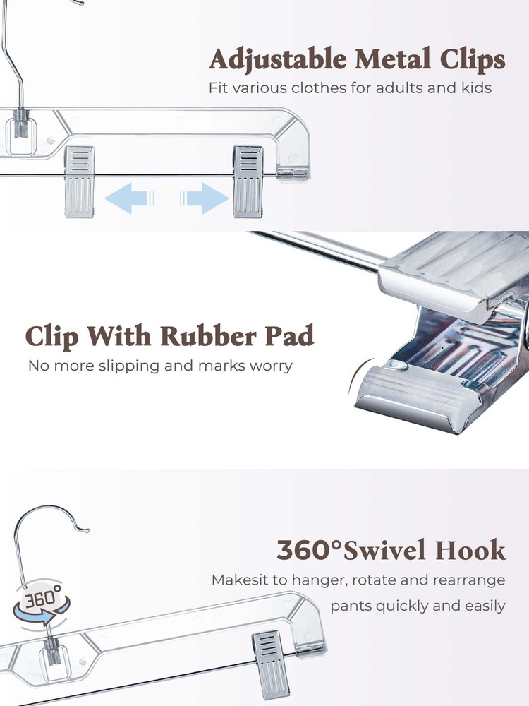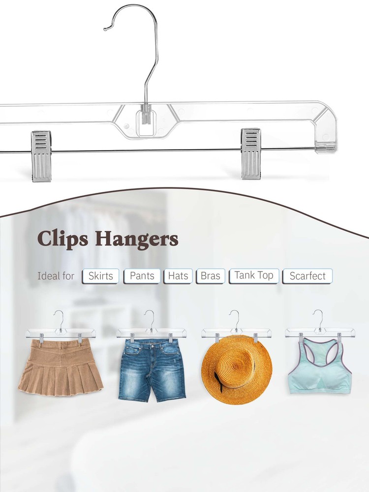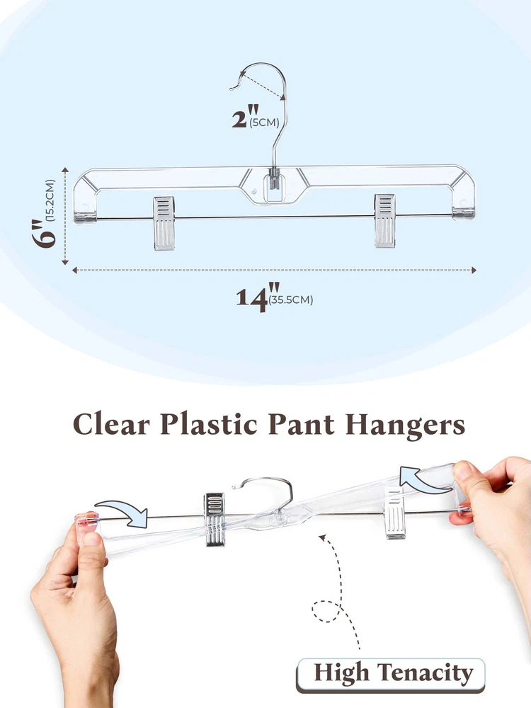 Plastic Pants Hangers with Clips: Resistant Cushion For Clips: No more wrinkle and slipping drama. Our clips feature rugged iron construction, coupled with slip-resistant cushioning, ensuring a gentle yet secure hold on clothing without worries of slipping or wrinkling. Pants and skirts hangers with clips prevent the unsightly wrinkles caused by stacking clothes for too long, ensuring your garments always look polished and crisp Adjustable Clip: These clips are super adaptable, you can easily reposition them to fit fit any clothing size and style. These pants hangers for women that move to the width of the skirt or pant, from oversized maxi to children's clothing. Keep your closet in sync with seasons and trends, staying fabulously organized all year round Sturdy and Space Saving Clip Hangers: Size for each hangers for skirts: 14"Lx 1/4"x 6.3"H thickness which are slim and lightweight. These shorts hangers with clips have a double-clip design, letting you hang two pants on just one hanger. Load bearing up to 7.7lbs, the clips are easy to open, yet they strong enough to hold the shorts and heavy jeans effectively Versatility Use Plastic Hangers with Clips: Sporting a flexible multi-functional design, these clips are up for any clothing challenge. Adjustable clips effortlessly hold pants, skirts, scarves, and more, creating a true multi-purpose closet space for you Clear Hangers with Clips: Our premium crystal skirt hangers for women are crafted from see-through material, suitable to match all styles of closets and organize all types of clothes, From pants to skirts and even scarves, these plastic clip hangers for skirts can handle it all! Home closet organization, store display, college dorm essentials Priceless Elegance, Affordable Price: Clear hangers with clips offers you the priceless elegance of high-end fashion at a budget-friendly price. Choose our versatility pant hangers with clips and liberate your closet from clutter, showcasing your organized and stylish charm