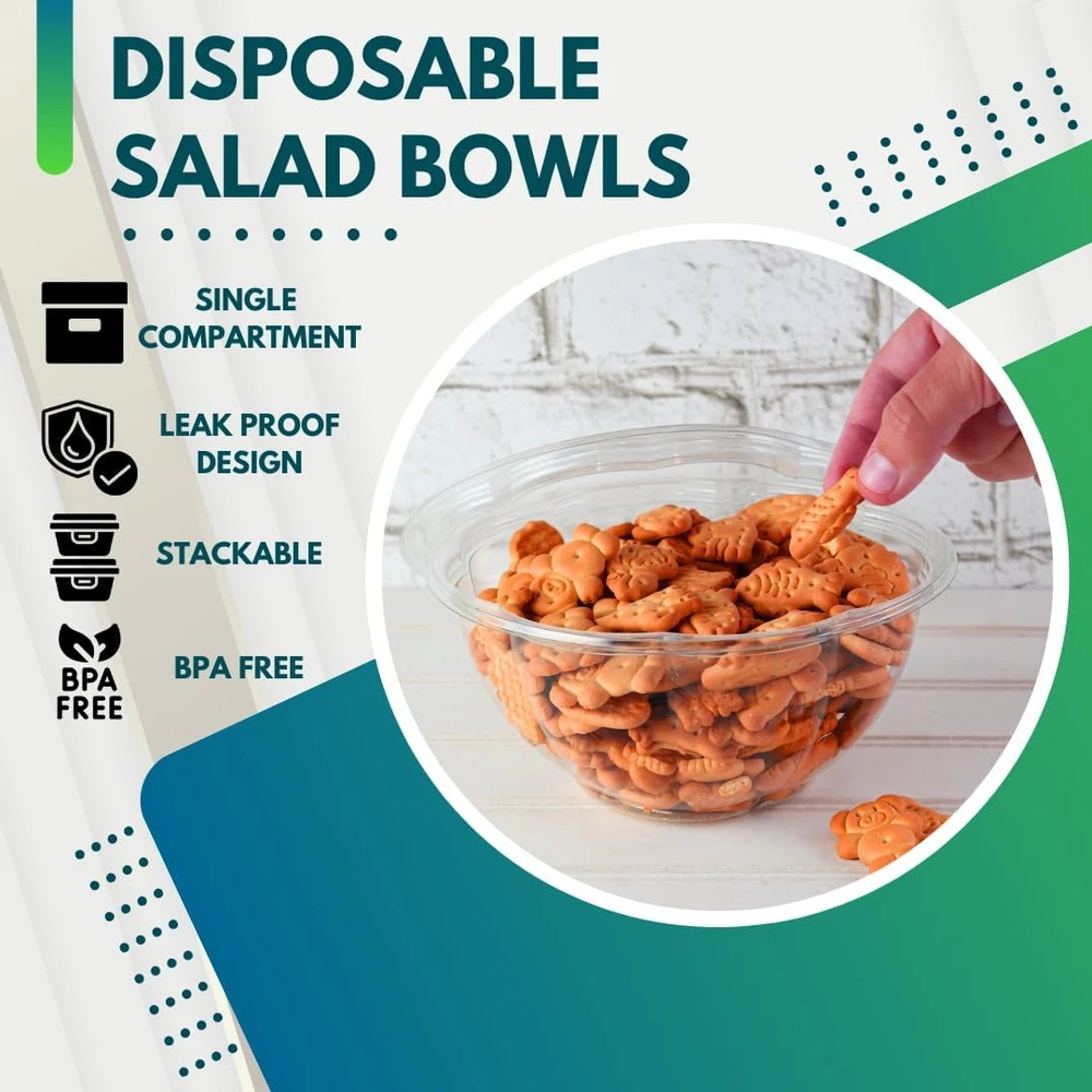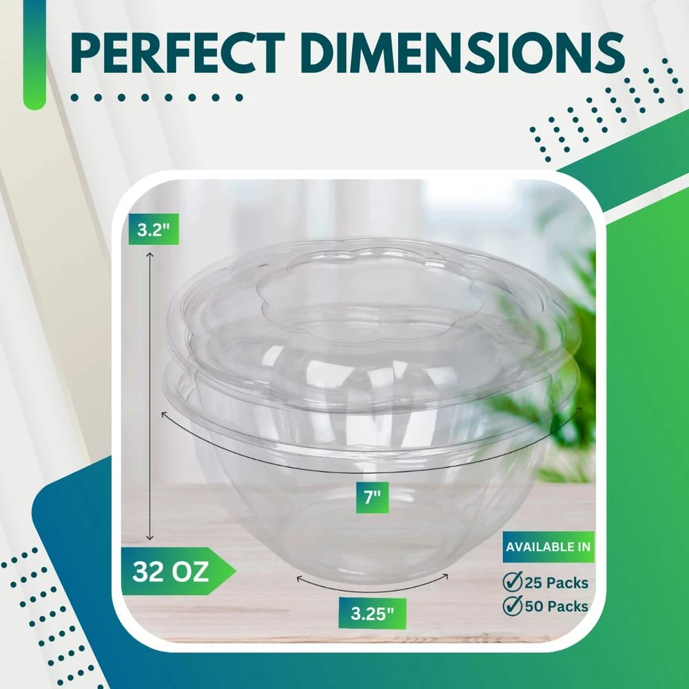 PRACTICAL DESIGN: Our disposable salad bowls with lids are made for your everyday convenience. They're practical, mess-free, and perfect for your busy life, whether it's for quick mornings or outdoor activities. PREMIUM QUALITY: Ideal for families, salad enthusiasts, and those who love to enjoy meals on the go, our clear salad bowls with lids provide top-notch quality at an affordable price. Elevate any gathering with the refined simplicity of our Salad Bowls with Lid – the perfect blend of functionality and sophistication for every occasion. LEAK-PROOF BOWLS WITH LID: Enhance your packed meal experience with our to-go salad bowls. Made with top-notch quality, these bowls have a crystal-clear design that makes your food look great. Leak-proof and ideal for any occasion, they keep your meals mess-free and fresh, even if you eat them hours later. PREMIUM QUALITY VALUE PACK: Introducing our Clear Salad Bowls with Lids, each set containing [Pack] [Size] disposable clear bowls. With dimensions of 7-inch top diameter, 3.25-inch bottom diameter, and 3.2-inch height, these clear plastic bowls are perfect for a wide range of food. At Green Direct, we're committed to offering durable, reusable products that cater to everyone's tastes and needs. Our products are thoughtfully designed to ensure maximum satisfaction, and we stand behind them with a 100% customer satisfaction guarantee! Product Description Crystal Clear Bowls The Green Direct Salad Bowl Set features crystal clear bowls, allowing you to showcase the vibrant colors and freshness of your salads and fruits. Food Safe & User Friendly Made using a portion of recycled plastic. No liner or coating is present on these bowls. Perfect For Meal Prep Lunch and daily meals are simple to prepare with our stackable bowl. Durable Bowl and Airtight Lid The Green Direct Salad Bowl Set is constructed with high-quality materials, ensuring durability and long-lasting performance. Product Description Add to Cart Add to Cart Add to Cart Add to Cart Add to Cart Customer Reviews 4.4 out of 5 stars 840 4.4 out of 5 stars 840 4.4 out of 5 stars 840 4.4 out of 5 stars 840 4.4 out of 5 stars 840 Price $23.99 $ 23 . 99 $24.99 $ 24 . 99 $25.99 $ 25 . 99 $30.99 $ 30 . 99 $17.99 $ 17 . 99 Bowl Size 18 oz 24 oz 32 oz 48 oz 64 oz Made with High-Quality Plastic ✔ ✔ ✔ ✔ ✔ BPA Free ✔ ✔ ✔ ✔ ✔ Color Clear Clear Clear Clear Clear With Lids ✔ ✔ ✔ ✔ ✔ Count 50 50 50 50 10