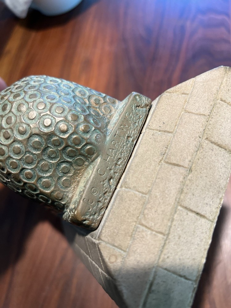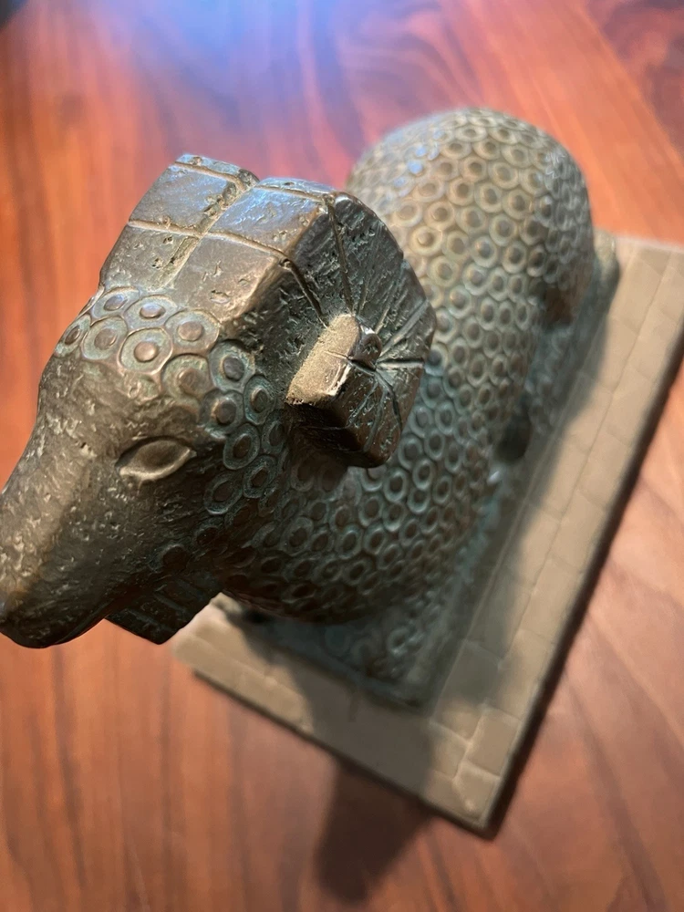 Signed C. Hartwig Ram statue Clay pottery with a bronze style finish No chips. No damage. No repairs. Slight wear on corners very minor. I didn’t want to touch it up. Honest Seller. I’ve had this for a very long time. NYC Artist Goes well with mid century modern eames interiors. Measures 8x7x4.5 inches