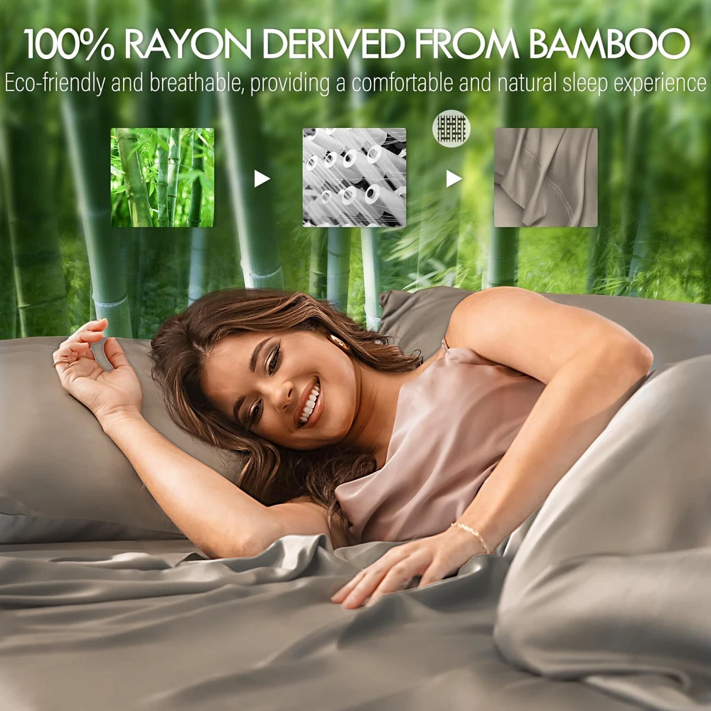 4 PIECE BED SHEET SET: Includes 2 Pillowcases, 1 Flat Sheet, and 1 Fitted Sheet. Flat Sheet (90" x 102"), Fitted Sheet (60" x 80"), Pillowcases (20" x 30"). Deep Pocket Sheet Set: Indulge in luxury with our elasticized deep-pocket sheet, fitting mattresses up to 16 inches thick. Its versatile size suits most beds, even smaller ones. Ultimate Coolness and Softness: Experience cool comfort with our bedding. It naturally regulates temperature, wicks away moisture, and offers ultimate softness. Perfect for hot sleepers and sensitive skin. Super Soft Sheets: Crafted from 300 TC satin fiber fabric, our bedding sheets are incredibly soft, smooth, and silky. 300 thread count is the optimal choice for pilling resistance as higher thread counts mean thinner and weaker fibers. Certified Safety: Our bed sheets are OEKO-TEX Standard 100 certified, ensuring bed sheets do not contain harmful chemicals. Recommended care includes cold washing, gentle cycle, and avoiding bleach or fabric softener. Tumble dry on low heat and remove immediately to avoid wrinkles. Use a warm iron if needed.