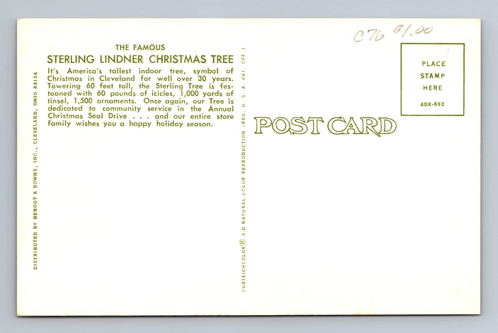 Cleveland OH-Ohio, Sterling Lindner Christmas Tree, Vintage Postcard