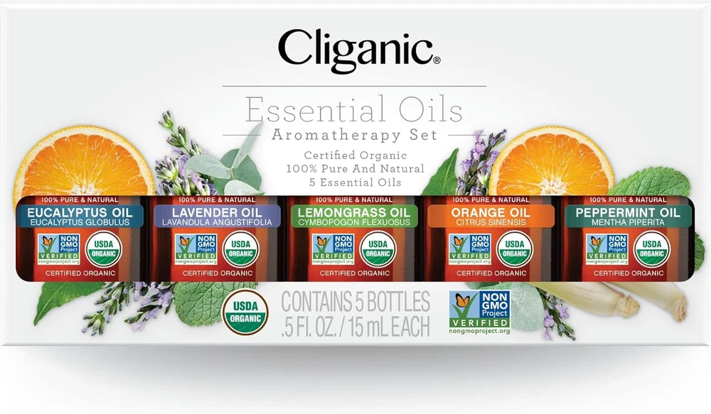 Packaging May Vary - New look, same great product. Included in this Gift Set: Peppermint, lavender, eucalyptus, lemongrass & orange. essential oils gift set for aromatherapy diffuser. Certified Organic - Cliganic organic essential oils are proudly USDA organic certified to ensure ultimate quality and integrity. 100% Pure, Single Ingredient Oils - Cliganic organic essential oils are a single-ingredient product. No synthetic additives, ever. Non-GMO Certified, Vegan & Cruelty-Free - Free from additives, Cliganic aromatherapy oils are proudly non-gmo project verified, certified vegan and cruelty-free. 3rd Party Tested for Purity - Each batch of our essential oils is being tested for purity by a 3rd party independent lab. Product Description Cliganic Organic Aromatherapy Set (Top 5 Essential Oils) We offer only 100% Pure, Natural, Organic, Non-GMO Essential Oils. That means the oils are uncut (no carrier oils are added) and they are free of chemicals, no synthetics, etc. You’re getting premium, high quality, affordable essential oils. Each oil in our 5-pack set are poured into glass amber bottles, which protect the oils from being de-sensitized, which weakens their scent and their properties. Each bottle comes with a German Dropper Cap (orifice reducer) that gives you better control - one drop at a time! Our 5-pack is an affordable gift for even the most expensive tastes. Perfect for gifting on holidays, birthdays, and special occasions. You could even include a few of our blends and recipes for a thoughtful touch. If you’re new to essential oils, this is your must-have starter kit. We’ve chosen 5 of the most popular essential oils for you, which have a wide range of benefits. You’ll be glad to know that using oils to get these benefits is very simple. Diffusing the oils, or, blending them for topical use with Cliganic Jojoba oil, are two easy ways to get started. Legal Disclaimer: These products are not intended to diagnose, treat, cure or prevent any disease or health condition. Included in this Organic Aromatherapy Set: Organic Peppermint Oil has a clean, refreshing, minty, cool scent. It’s stimulating, work with this oil to ease feelings and to balance emotions. Blends well with Frankincense and Lavender. Organic Lavender Oil has a sweet, floral, herbal scent. It’s favorited as the #1 essential oil due to its many benefits. Lavender is the most gentle but powerful essential oil that can be used by anyone. Blends well with all oils, especially citrus oils like Lemongrass and Orange. Organic Eucalyptus Oil has a strong, fresh, sweet scent. It's also a great essential oil to use in massage or with other topical blends. Blends well with Frankincense and Lavender. Organic Lemongrass Oil has a fresh, grassy and earthy scent with a strong lemon note. If you are looking for an essential oil that can help give you an uplifting emotional boost, Lemongrass is the one. It's perfect to use in blends when you are emotionally or physically exhausted, or when you need help focusing and getting motivated. Blends well with Lavender, Tea Tree and Rosemary. Organic Orange Oil has a citrusy, sweet, and refreshing scent. The invigorating scent helps enhance focus, revitalizes and rejuvenates. This oil’s properties make it a wonderful oil to work with in the morning or at your office, as it gives you a sense of regeneration and optimism. Orange oil is also a great, natural ingredient to add to your cleaning products for household chores. Blends well with Frankincense, Lavender and other citrus oils. Discover Cliganic Organic Essential Oils Sustainable Cliganic Essential Oils are Made in USA with globally sourced ingredients from reputable suppliers. 3rd Party Tested for Purity Each batch of our Essential Oils is being tested for purity by a 3rd Party Independent Lab. Available in Various Sets! Top 5 Top 6 Top 8 Top 12 Cliganic Commitment At Cliganic, we believe that natural products are key to a balanced body and soul. We source only pure high quality ingredients and we stand behind every item that we make, 100% USDA Certified Organic - Non-GMO Verified The strict oversight of USDA ensures the integrity of our oils. In other words, it’s really Organic (by QAI 03/2017). This product is verified with the Non-GMO Project (by NSF 01/2019). Cruelty Free & Vegan Not Tested on Animals. Cliganic meets PETA's requirements to be listed as Cruelty-Free (by PETA 07/2015).