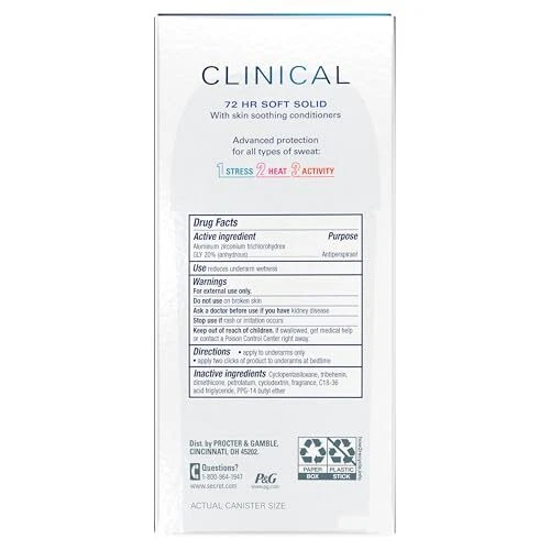 Stay confidently dry and fresh with Clinical Strength Antiperspirant and Deodorant for Women. This powerful invisible solid deodorant is specially formulated to provide 72-hour protection against stress sweat, ensuring you remain comfortable and confident all day long. Infused with pH balancing minerals, this deodorant is designed to be gentle on your skin while delivering advanced protection against odor-causing bacteria. The Stress Response formula effectively combats sweat, making it the ideal choice for women with busy, active lifestyles. Experience the reliable freshness and protection of Clinical Strength Antiperspirant and Deodorant and embrace your day without worry. FIGHTS 3 TYPES OF SWEAT: STRESS, HEAT & ACTIVITY – This Clinical Strength formula is designed to handle the unique challenges posed by each type of sweating, ensuring you remain dry and confident no matter the circumstances. INVISIBLE SOLID FORMULA: The invisible solid application ensures no white marks on your clothing, making it perfect for daily wear. 3X SWEAT PROTECTION* (vs. the wetness protection required of an ordinary antiperspirant): Specifically formulated to address stress-related sweat, this deodorant offers reliable protection when you need it most. #1 CLINICAL ANTIPERSPIRANT BRAND* - is recognized as the #1 clinical antiperspirant brand, offering effective solutions for those seeking strong sweat and odor protection while being gentle on skin. *Based off Nielson data as of 12/19/24 72HR SWEAT & ODOR PROTECTION – The Clinical Strength Antiperspirant & Deodorant offers 72-hour sweat and odor protection, ensuring you stay dry and fresh for an extended period. CERTIFIED CRUELTY-FREE by PETA - This certification reflects a commitment to ethical practices, allowing you to choose a deodorant that aligns with your values while still providing effective sweat and odor protection.
