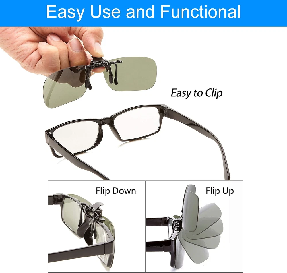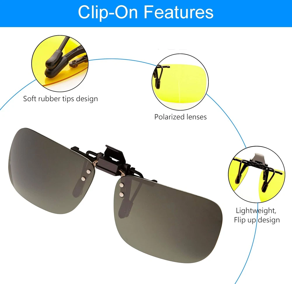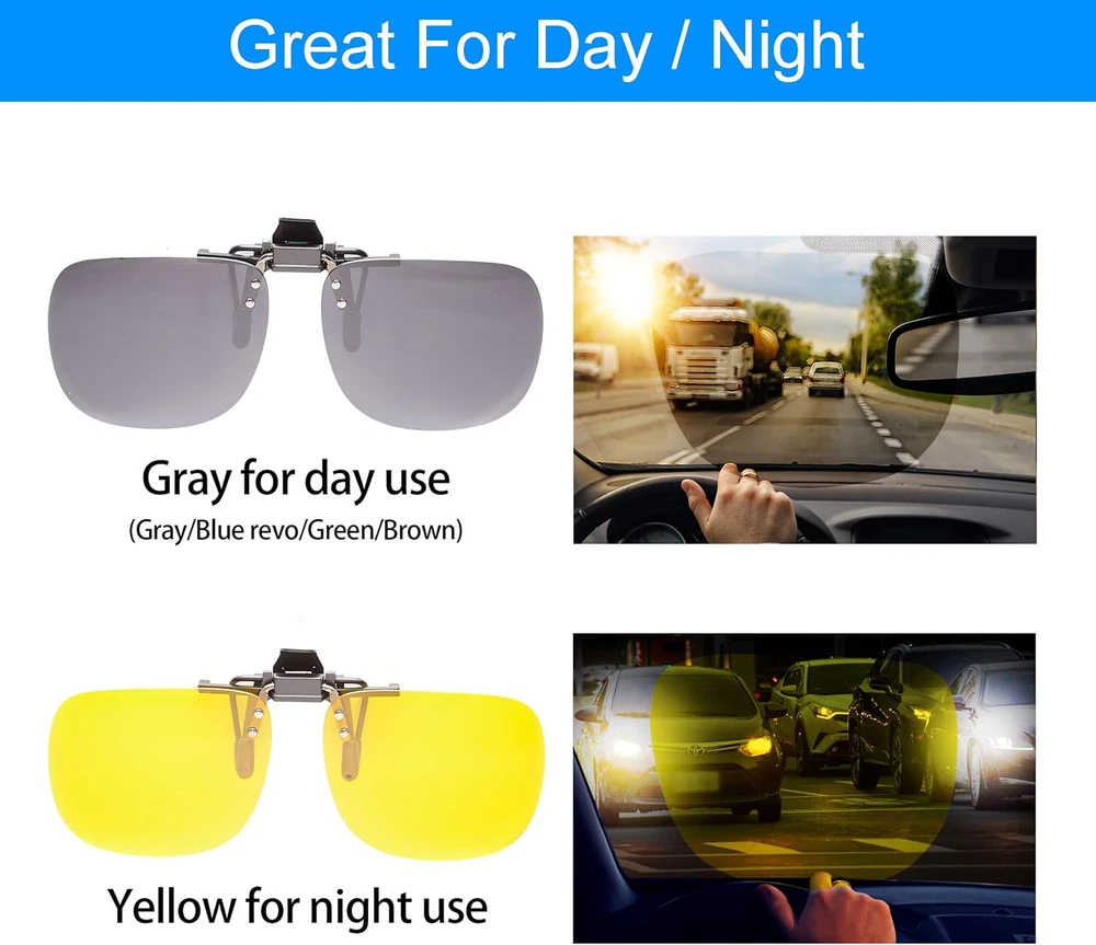 ???? TAC POLARIZED LENS - Filter Lights Glare - Reduces Refractions, reflections, glaring lights, Increases Color Contrast, Improve Vision, Decrease Eye Fatigue. Great for Driving, Fishing, Reading, Climbing, Trekking, Skiing, Hiking, Running, Cycling, Racing, Golf, Sports and any other day to day activities. Suitable for Unisex Adults Men and Women ???? INTUITIVE DESIGN - Easy to Clip On, Rimless Frameless Lightweight Frames, and Fashionable. Flip it up when driving into a tunnel or when temporarily not requiring shades. Flip it down when you need sunglasses. Also it can Flip up to 180 degree without blocking vision. The soft rubber tips protect glasses from scratching. ???? PROTECT YOUR EYES - Anti-UV RAYS (UV400) Protected - Offers maximum protection to your eyes with our Impact Shatter-Proof, Wear-Resisting, and Scratch-Proof ( Anti-Scratch ), non-shrinking Technology. Protects from accelerated aging and Retinopathy. Also Harmful Blue Lights From LCD Screens too. These Multilayer Polarized Lens can is your solar shield and can Block out UVA & UVB effectively which can filter out UV rays within the wavelength 400nm for Complete Eye Protection! ???? SAVE MONEY - Saving You lots of Hundreds of dollars instead of getting New Prescription Sunglasses! It is cost-effective and Essential. Stylish, Perfect and Interchangeable for any occasions. Just Clamp it on and ready to go! "???? PREMIUM PACKAGE INCLUDES - Flannel Fabric (Cleaning Cloth) & 2 PACK Clip On. Great For Gift Giving! *Note: Gray, Blue Mirror, Green, and Brown lenses are used for Day Time Use Yellow lenses are used for Night Time Use"