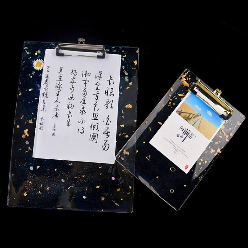 DIY Clipboard Resin Mold File Folder Resin Molds Epoxy Silicone Tray Molds File Folder Drawing Board Mold Feature: Vertical File Folder Mold Material: These clipboard vertical file folder resin molds are made of silicone with smooth surface, which can bring you elegant finished durable and reusable, not easy to break, you can use them for a long for time. Size: low metal clip, retractable for key hole for hanging fits in most briefcases, and for those loading in more pages – you’ll also love it holds 80-100 sheets of / Letter Size Paper without dropping a single Convenient to Apply: these file folder molds are convenient to clean after use, no tearing, and please store them in dry and clean place, they are light in weight and proper in size, won'for t take up much of your space. Widely Used: You can use these resin molds to make your own unique office flie folder or use it as a drawing board. You can add resin pigment, resin dye to create personalized art craft projects in differnt ways. Good gift: Our clip board silicone resin molds are perfect for you, family, or anyone who likes handicrafts. It can be as birthday, Christmas, Valentine's Day, New Year gifts. Specification: Material: Silicone Color:Clear Type: Clipboard Mold Type:A/B/C/D Mold Size A Large Board 325x235 mm/13"x9.3", B Small Board 235x159 mm/9.3"x6.3", Thickness 5mm/0.2" C Gold Clips Fittings D Silver Clips Fittings More detailed,please see photo Quantity Pc. Notes: Due to the light and screen setting difference, the item's color may be slightly different from the pictures. Please allow slight dimension difference due to different manual measurement. Package Included: Pc x Clipboard Mold.