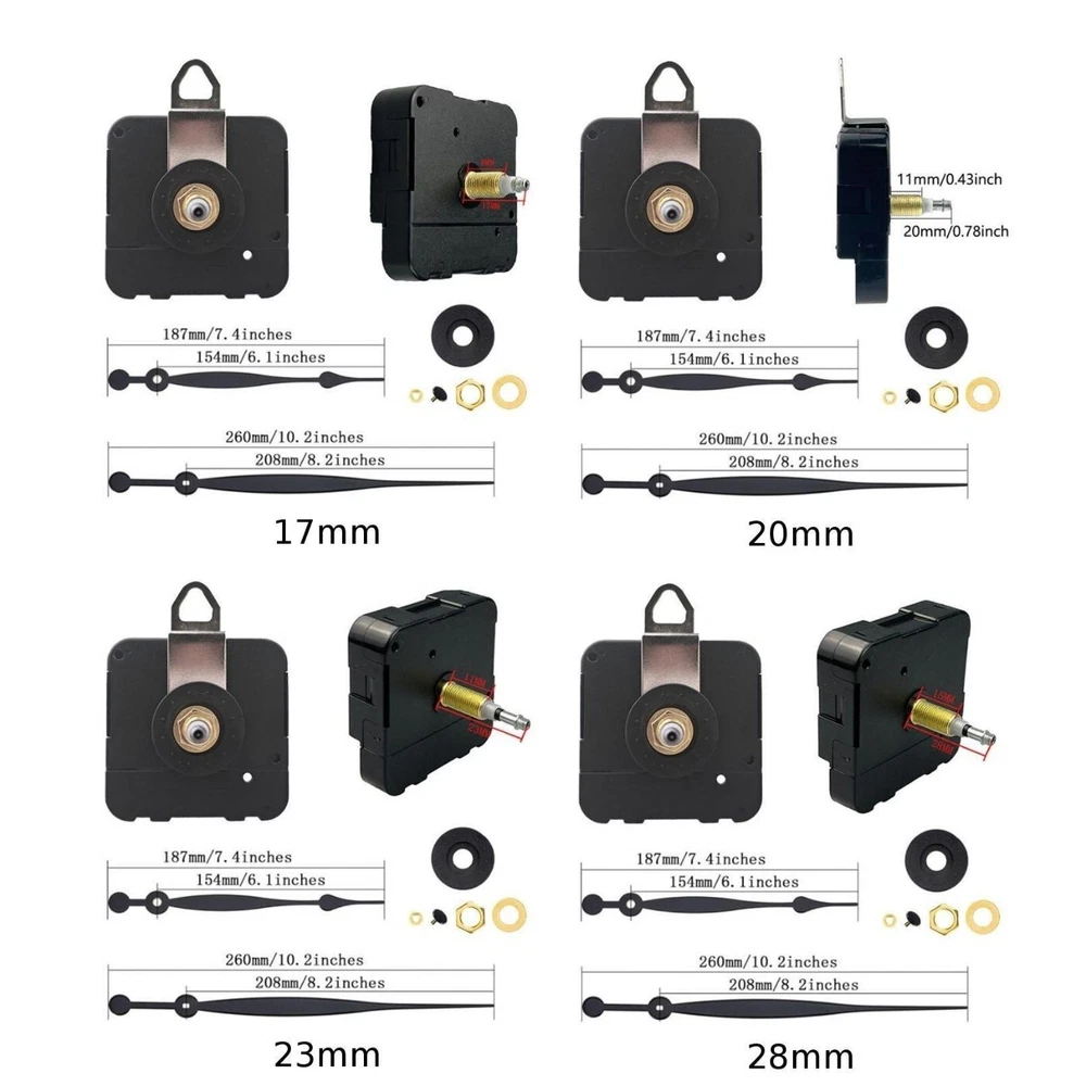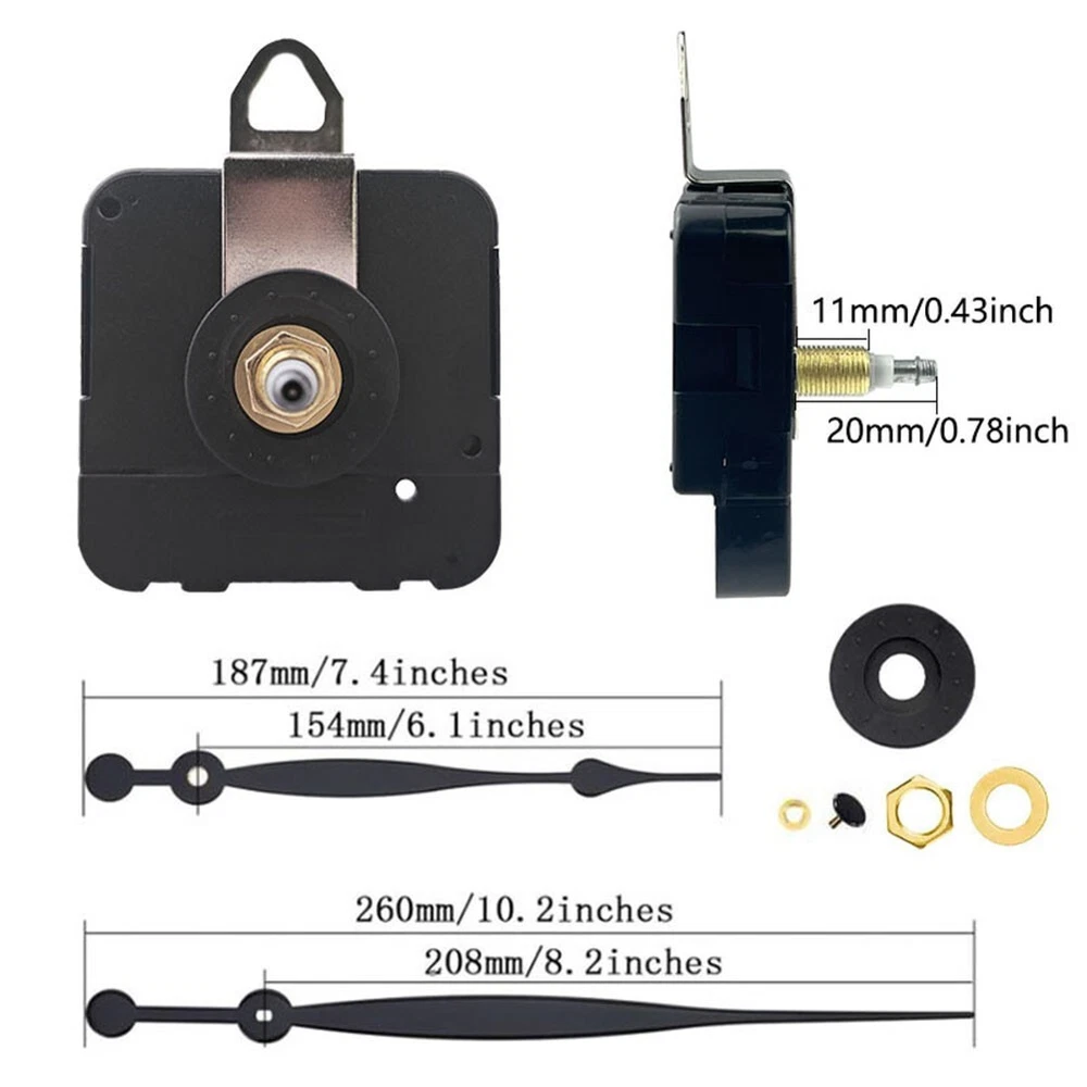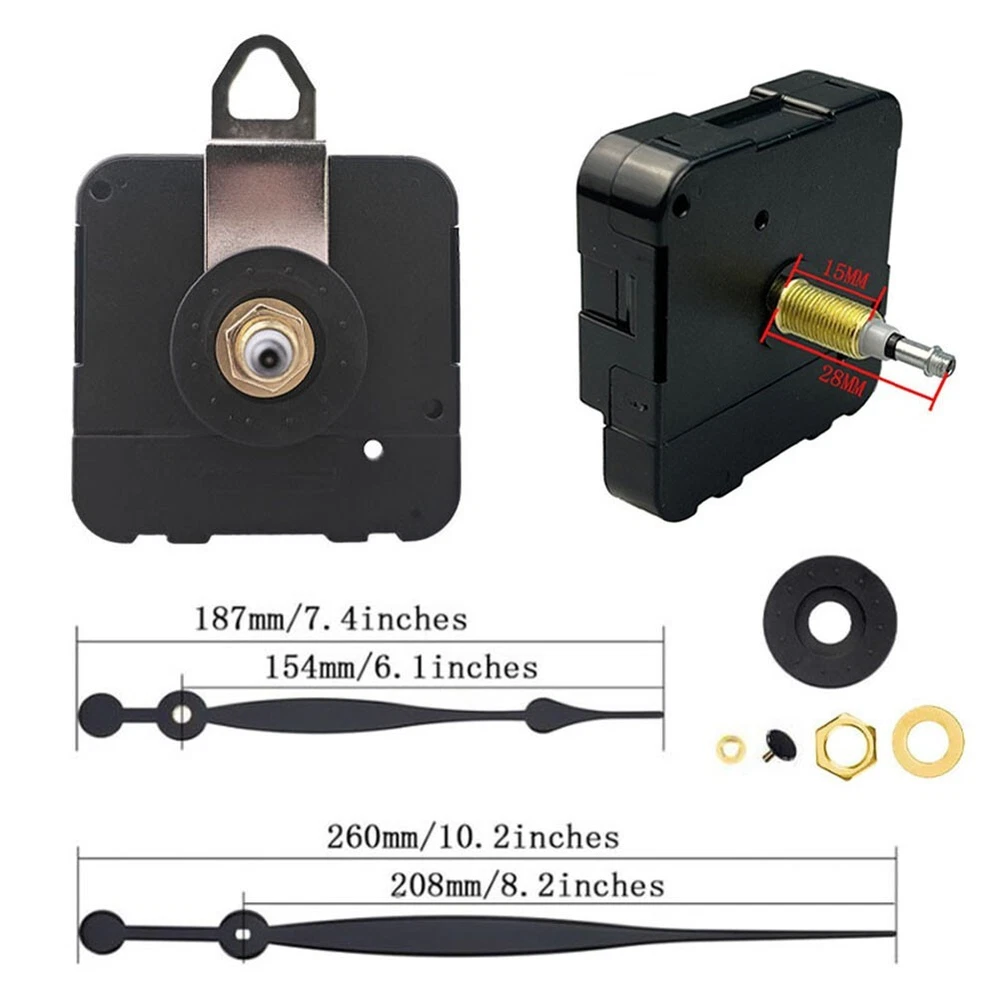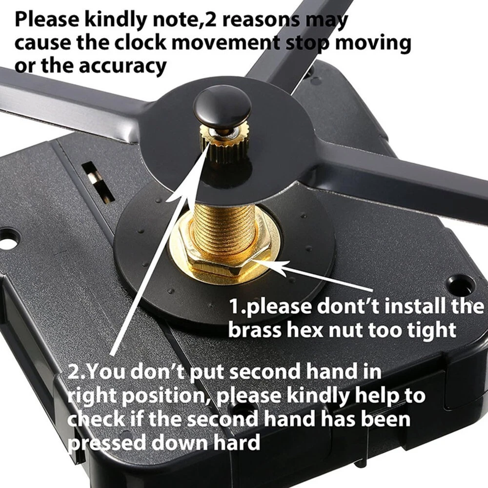 Clock Mechanism with Nut and Pointer Perfect for Personalized Projects DESCRIPTION Features: *Precision Timekeepi ng: This high torque wall clock movement guarantees accurate timekeeping, daily error of 1 second, life of 2-3 years, low power consumption, ordinary battery can be used for 6 months. *Versatile Compatibility: Suitable for a wide range of applications, this movement can be utilized in craft clocks, wooden and metal wall clocks, as well as DIY home decoration projects, making it an perfect choice for various clock designs. *Flexible Shaft Options: Available in multiple shaft lengths (17mm, 20mm, 23mm, 28mm), this movement accommodates different clock panel thicknesses, providing flexibility for diverse clock styles and installations. *Efficient Power Usage: The movement uses 1 1.5V-AA battery. Carbon batteries are OK, alkaline batteries should not be used, otherwise the current will be too large and affect the running time. The delivery does not contain batteries. *Delivery list: high torque movement, pointer, golden nut, black copper head, iron hook, accessories, etc. Note: Please refer to the pointer installation diagram for pointer installation. The three needles should be installed and parallel from the side. It is better not to touch the needles. Specifications: *Part Name:Movement pointer *Material:plastic, mental *Size:As pictures show *Color:black Package Content: 1*Movement pointer Note: 1. The real color of the item may be slightly different from the pictures shown on website caused by many factors such as brightness of your monitor and light brightness. 2. Please allow slight manual measurement deviation for the data. POLICES Shipping Payment WARRANTY We only ship to confirmed Order addresses. Please comfirm that your Order address is in line with your shipping address. Please kindly note that the c ombined shipping is not provided because the shipping fee is calculated by weight. Also, the each additional item means exactly the the same color and size. It takes about 7 -15 working days to US; about 10-30 working days to other countries. for TRANSIT time may be a little delayed because of the bad weather and customs inspection . If you do not receive your item within 30 working days since payment finished, please contact us immediately for further assistance. Payment must be completed within 5 days. If you have any problems about payment, please contact us via message. We strive for 100% customer satisfaction! Positive is very important to us. If you have any questions, p lease feel free to contact us via "Ask seller a question" . We will reply your email within 24 working hours.