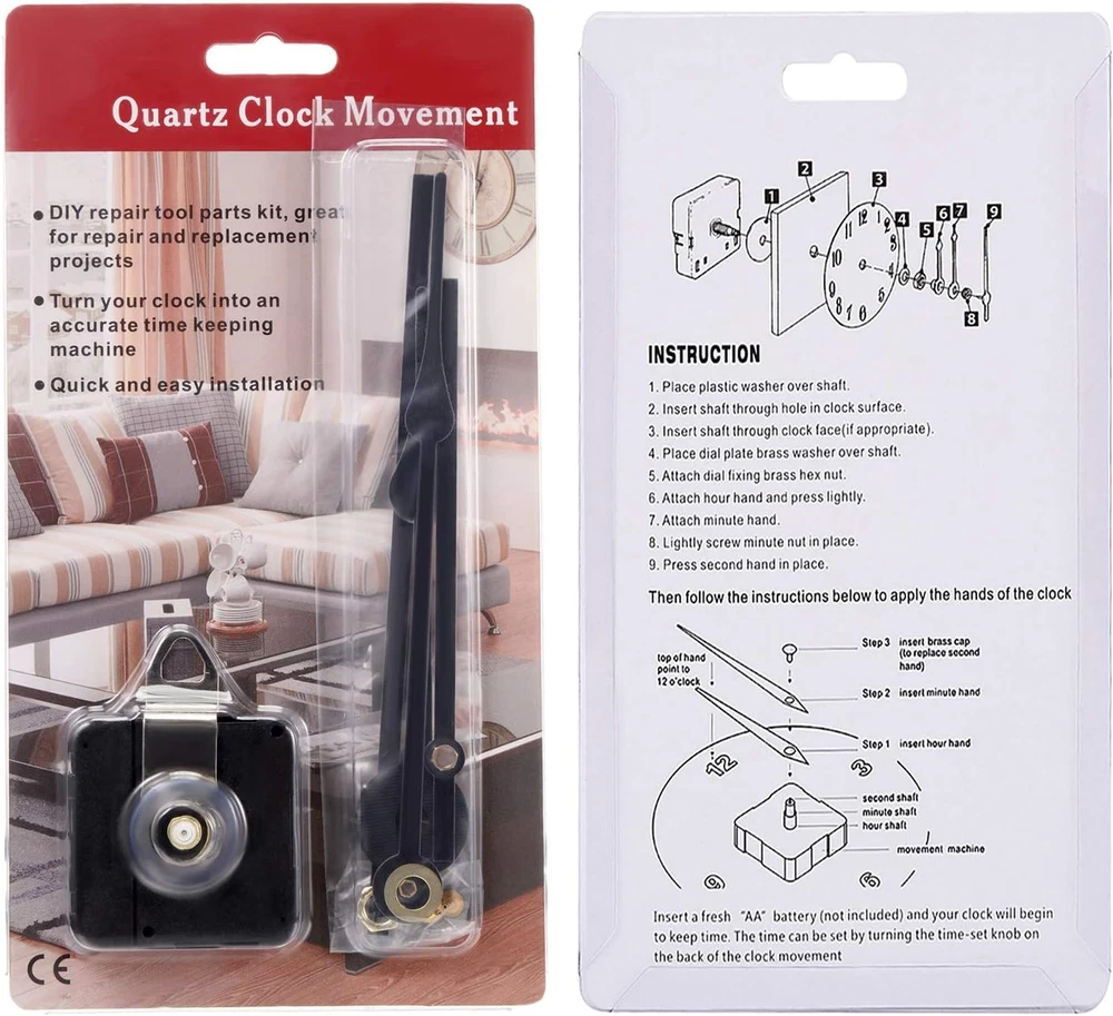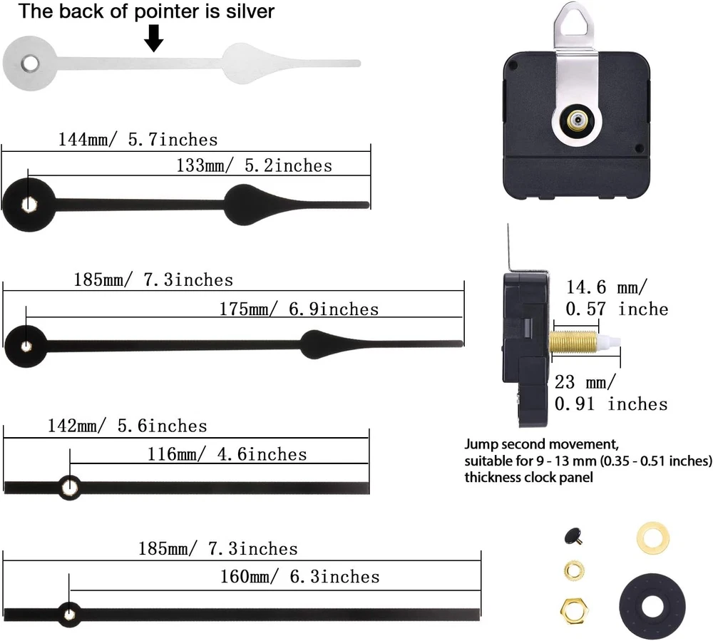Store New Arrivals Add to Favorite View Feedback Contact Clock Movement Mechanism High Torque Long Shaft Clock Replacement Wall Clock Mechanism Hands Quartzs DIY Clock Repair Parts Motor Replacement with 2 Pairs of Hands Description Item model number Hicarer-Long Shaft-01 Style Modern Number of Items 1 Power Source Battery Powered Dial Color Black, White or Grey Country of Origin China Operation Mode Electrical Theme Sport Are Batteries Included No Room Type Bedroom Batteries required No Product Dimensions 9.45"W x 0.79"H Material Plastic Metal Brass Aluminum Watch Movement Quartz Frame Material Aluminum Age Range (Description) Adult Alarm Clock No Number of Batteries 1 AA batteries required. Manufacturer Hicarer Indoor/Outdoor Usage Indoor Item Weight 2.45 ounces Display Type Analog Mounting Type Wall Mount Color Black Shape Square Batteries 1 AA batteries required. Brand Hicarer Packaging and installation: come with a specially designed blister cardboard box, easy to carry, when you install this clock movement kit, make sure that the hour and minute hand are parallel Size from the center of the hole to the tip: the hour hand is approx. 133 mm/5.2 inches and 116 mm/4.6 inches long, the minute hand is approx. 175 mm/6.9 inches and 160 mm/6.3 inches long; 2 second caps: 7 mm/0.28 inches Clock mechanism size: total length of the shaft is approx. 23 mm/0.91 inches, thread length is approx. 14.6 mm/0.57 inches; The second jump movement is suitable for clock panel with a thickness of 9 to 13 mm (0.35 to 0.51 inches) Easy to install: the clock movement kits are easy to install, simple and elegant design, these replacement parts fit well with different styles of clock frame Warm notice: as the watch hands are made of aluminum, the back hands are silver, the color of the front side is that of the photo, and please check the size before buying Product Description Power by 1.5 V AA battery (not included). Suitable for 9 - 13 mm (0.35 - 0.51 inches) thickness clock panel. Please check this size and the hands size before buying. Made of durable plastic and aluminum. Aluminum is lightweight but will bend easily under stress. Please don’t press too much pressure on the hands when installing. Keep the two hands level when installing. Non-parallel is easy to affect the accuracy of the clock operation. ABOUT US We offer the best prices around on high quality products. Our E-store includes media such as books, movies, music and games while offering electronics, toys, sporting apparel, clothing, tools, general home, garden items and more. SHIPPING We are always working hard to ensure your package arrives as soon as possible. Please understand that some factors like weather, high postal traffic, and the performance of shipping companies are outside of our control. We offer free shipping to the lower 48 states and ship within 2 business days of payment, usually sooner. We do not accept P.O. Boxes. Please provide a physical address. RETURNS We offer a 30-Day Return Policy on items which you are not completely satisfied with. You have the option for a full-refund or an exchange of the item. No returns are available on items shipped outside of the USA. PAYMENT We accept PayPal. CONTACT US This page content is yet to come Please ad us to your favorite seller and visit again later Thank You CUSTOMER SATISFACTION We try our very best to make sure every customer is completely satisfied. If there's a problem, message us! We're happy to help.