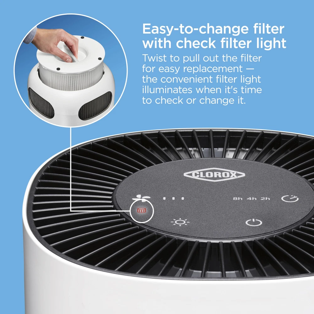 The Clorox™ Tabletop Air Purifier captures 99.97%* of particulates as small as 0.1 microns and reduces viruses and bacteria** so you can breathe easier. The 2 stage 360° filter captures particulates in a pre-filter and True HEPA filter. * Before first use remove Power Adapter from inside the filter. See Use and Care guide for more information. CAPTURES 99.97% OF ALLERGENS AND PARTICULATES AND REDUCES VIRUSES AND BACTERIA. The Clorox Tabletop Air Purifier has True HEPA filtration to capture 99.97% of particles as small as 0.1 microns and a pre filter to capture larger particles. 2 STAGE 360° FILTER: Delivers 360° air purification by capturing allergens and particulates in 2 filter layers. The outside pre filter catches large dust particles and pet hair and the True HEPA filter captures 99.97% of allergens and particulates. IDEAL FOR SMALLER ROOMS. This compact air cleaner is perfect for smaller rooms like the office, dorm, bedroom, den or nursery. The 360° filter pulls in air from all directions to clean rooms up to 5 times per hour when used in a room 80 sq. ft. and 2 times an hour when used in a room up to 200 sq. ft. EASILY CUSTOMIZE TO ANY ROOM OR SCHEDULE: This True HEPA air purifier has 3 speeds to let you customize air care to your needs. The optional timer lets you set air cleaning to your schedule simply choose from 8, 4 or 2 hours of operation. WHISPER QUIET SETTING IS PERFECT AT NIGHT. Get ready for a good night's sleep. Select the low speed for quiet air purification and turn the adjustable night light to bright, dim or off. GENUINE CLOROX FILTERS: Replace the filter every 6 12 months by searching for B09N54QY1R or Clorox 12020 Tabletop Replacement Filter. Maintain optimal performance with True HEPA filtration to capture 99.97% of particles as small as 0.1 microns and a pre filter to capture larger particles.at enter the True HEPA filter. 99.97% effective in capturing particles as small as 0.1 microns that enter the true HEPA filter. Reduction of viruses and bacteria as air passes through the true HEPA filter. Actual % of reduction varies. Does not kill viruses or bacteria. Cleaning effectiveness and filter life vary by air quality. Based on independent CADR testing, when operating on highest fan speed. Suggested room sizes assumes closed room with 8 ft. ceiling Estimated costs assumes usage on the highest fan speed, 24 hours a day, 365 days a year. Average utility rate of $0.12 per KWh. For more information about energy consumption, visit energy.gov Before first use remove Power Adapter from inside the filter. See Use and Care guide for more information. Testing performed by independent third party, LMS Technologies, INC, January 1, 2022