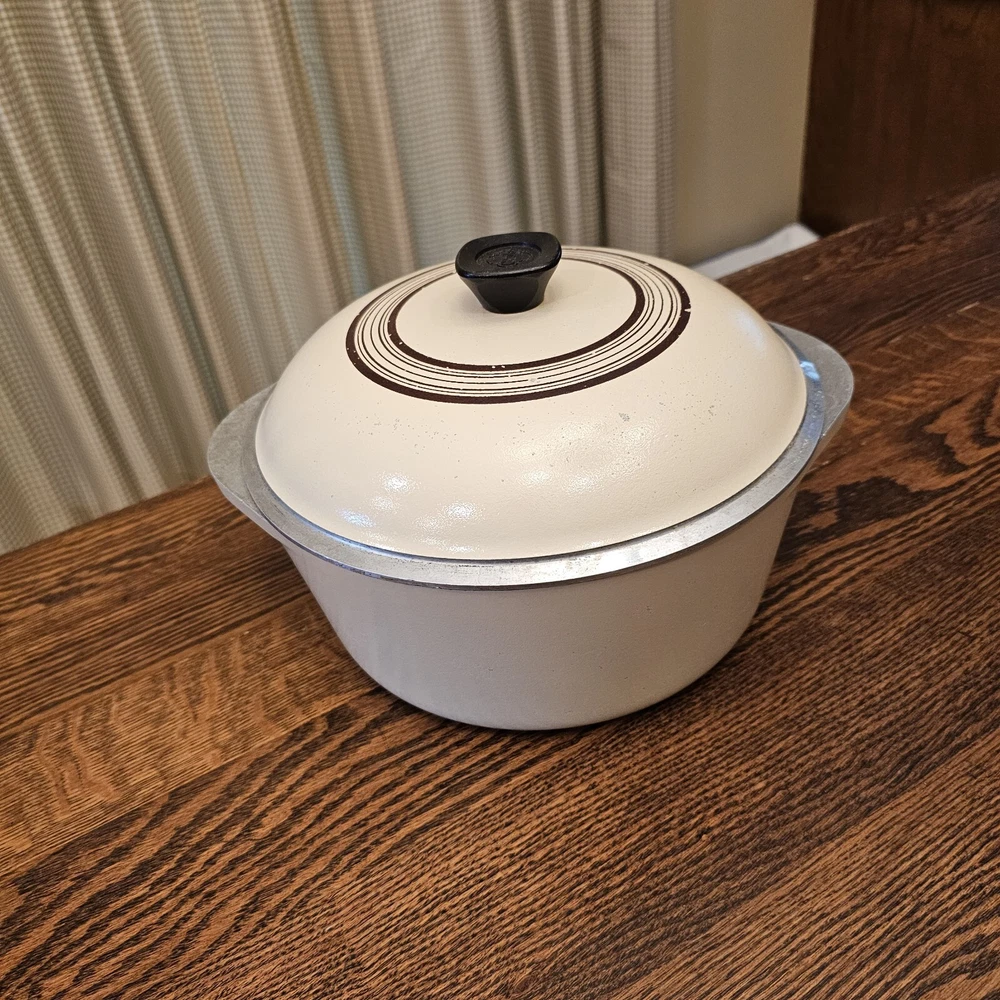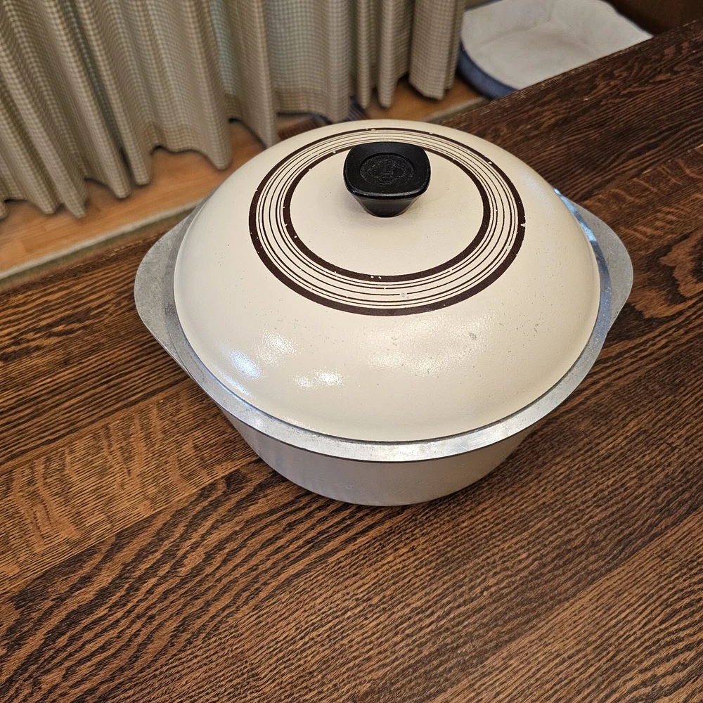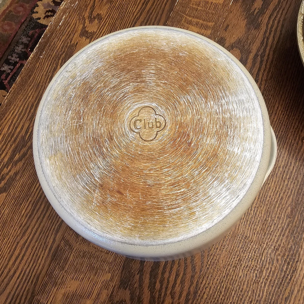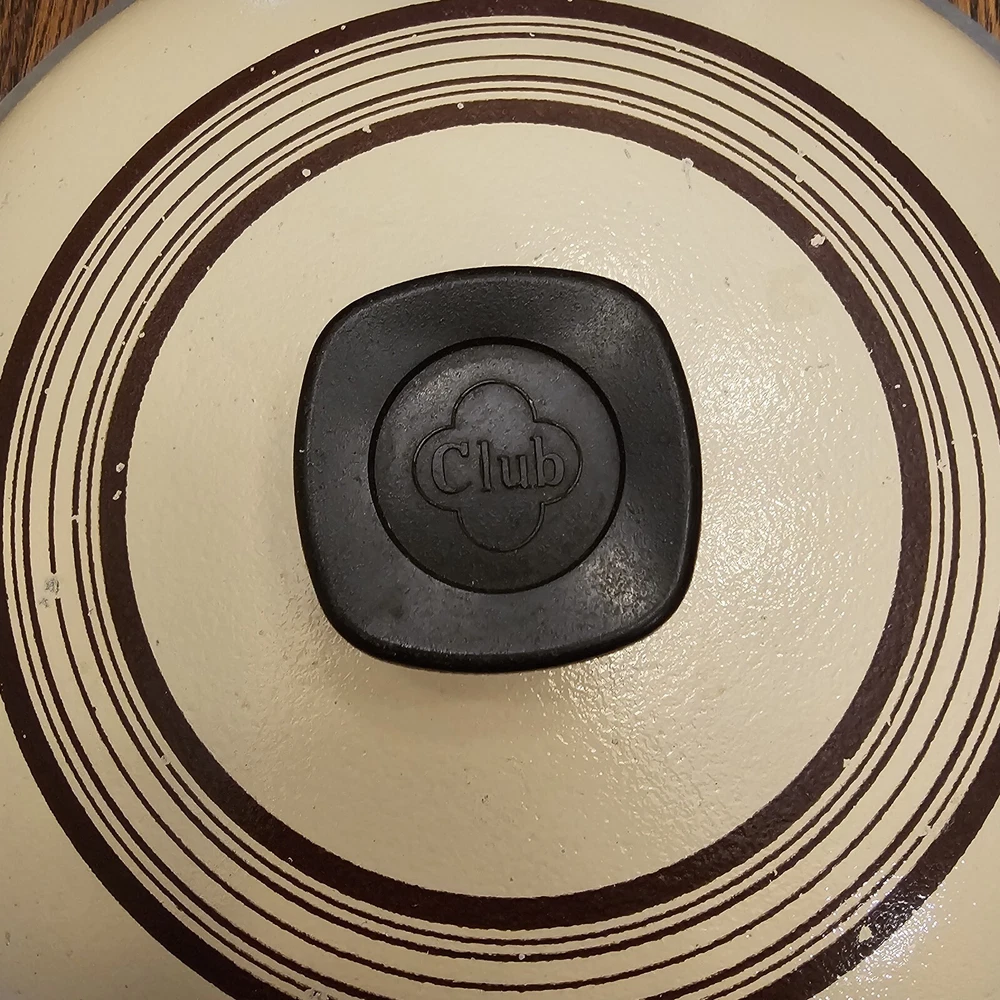 This CLUB Nonstick pot is in good used condition. A few scratches on the inside. Some wear on the lid paint. Outside bottom stained from use. 10" diameter. The pot stand 4 1/8" tall. To the top of the lid handle it measures ~7" tall. Overall in nice used condition. 4 quart.