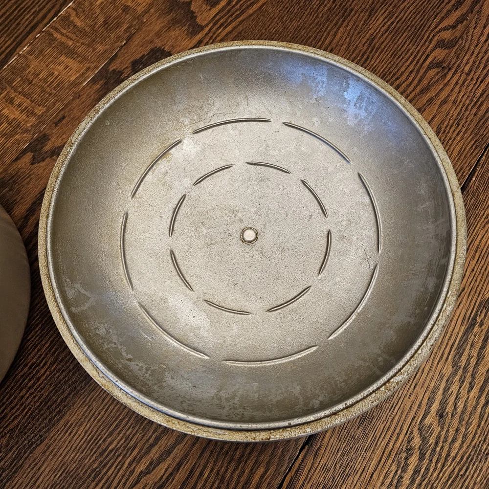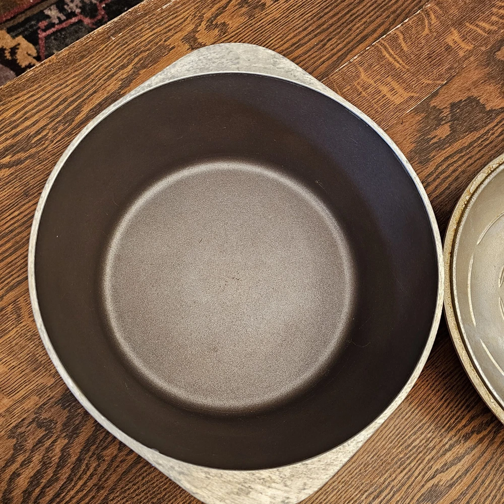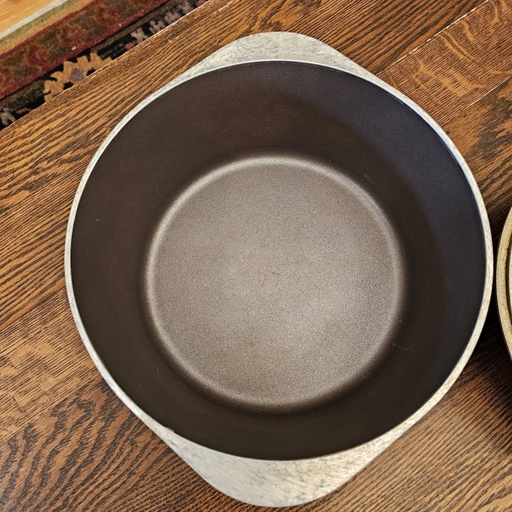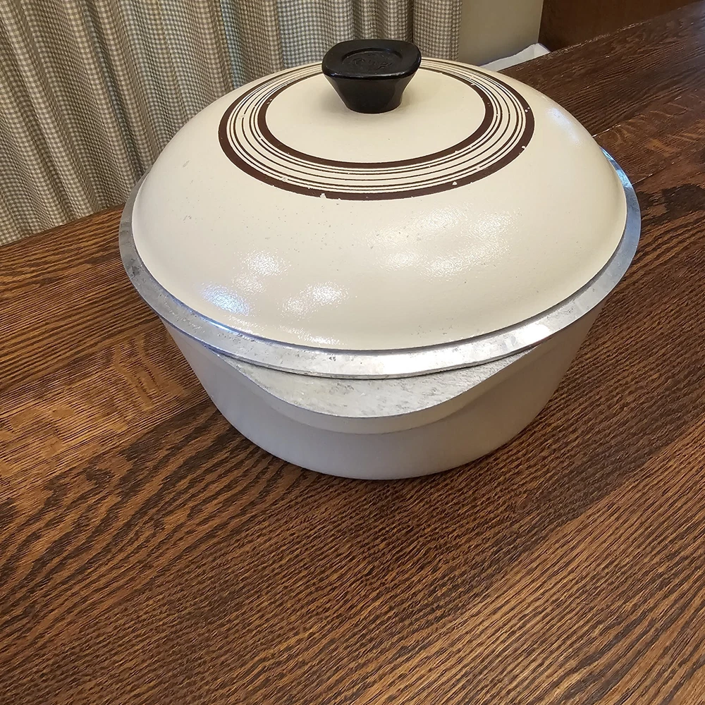 This CLUB Nonstick pot is in good used condition. A few scratches on the inside. Some wear on the lid paint. Outside bottom stained from use. 10" diameter. The pot stand 4 1/8" tall. To the top of the lid handle it measures ~7" tall. Overall in nice used condition. 4 quart.