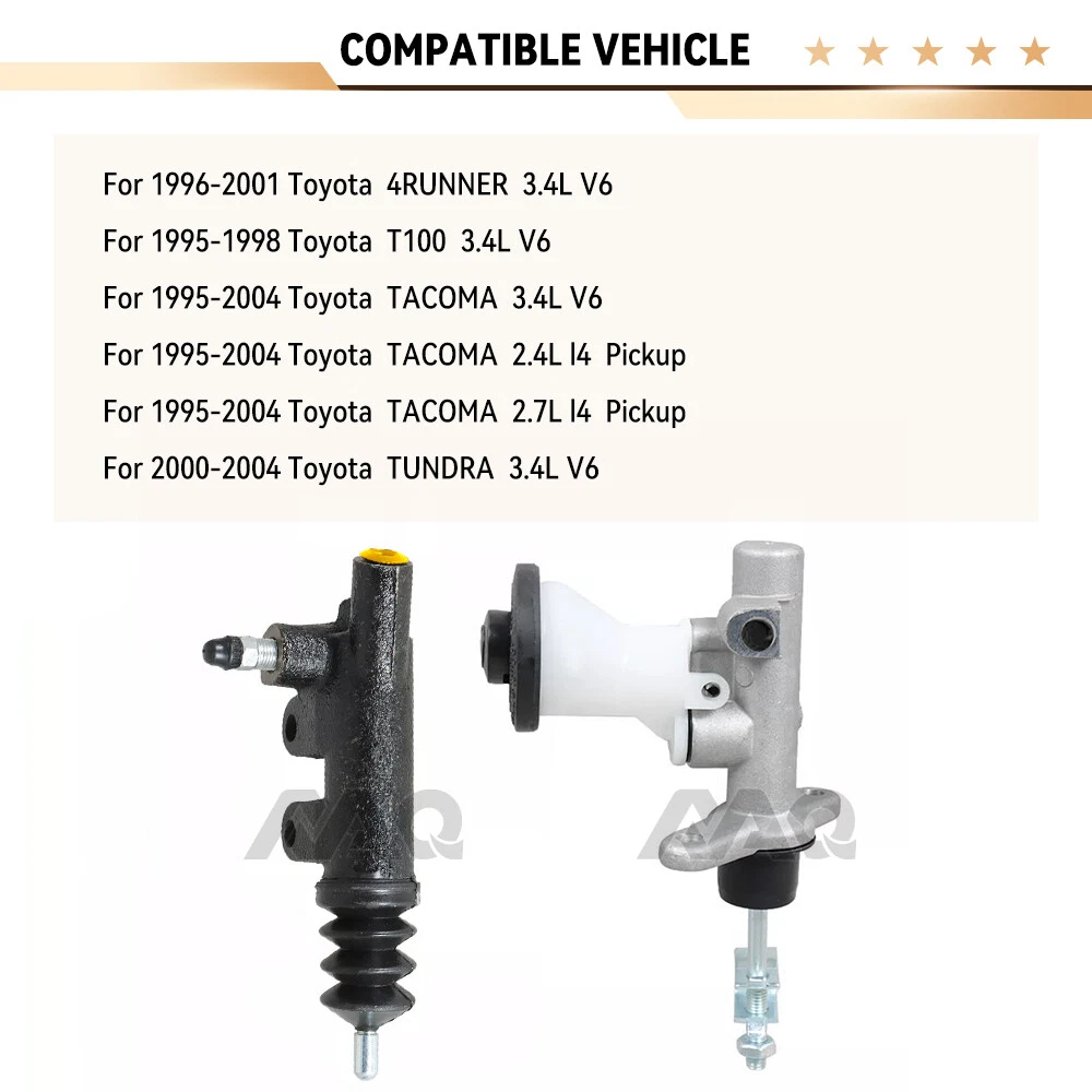 Note: Any questions please contact customer service as a priority, customer service will reply you within 24 hours! COMPATIBLE VEHICLE(FOR REFERENCE ONLY) YEAR Make Model & Engine 1996-2001 Toyota 4RUNNER 3.4L V6 1995-1998 Toyota T100 3.4L V6 1995-2004 Toyota TACOMA 3.4L V6 1995-2004 Toyota TACOMA 2.4L l4 Pickup 1995-2004 Toyota TACOMA 2.7L l4 Pickup 2000-2004 Toyota TUNDRA 3.4L V6 ITEM SPECIFICATIONS Condition & Status 100% Brand New Color Black+Silver Product Code / Interchanges 31470-35120, 31410-34012,31470 35120, 31410 34012,3147035120, 3141034012 OEM Part Number 31470-35120, 31410-34012,31470 35120, 31410 34012,3147035120, 3141034012 Package Included 1 xClutch Slave Cylinder&Clutch Master Cylinder Package size 7.87in*4.72in*3.93in(20cm*12cm*10cm) Rough weight 0.818kg Material Aluminum Warranty 1 Years 100% Safisfacfion Guarantee Note All automotive accessories in our store are recommended for pro SHIPPING Upon payment confirmation, your order will be dispatched within 1 business day, often the same day if placed by 9 AM PST on weekdays, from the nearest warehouse. All orders ship via economic logistics with tracking, arriving in 3-7 days. For faster delivery, express service is available with additional postage. Delivery times may vary due to weather and logistics busyness. RETURN POLICY We allow returns for any reason, but items must be in original packaging with tags attached. You must provide a shipping tracking number and specify the return reason. Please verify your shipping address and order details before placing your order. We are not liable for lost items caused by incorrect or undeliverable addresses. About US For purchases of multiple products, you can negotiate the price with us. If you face any problems like damaged products, missing deliveries, wrong items, or non-functional items, please contact us first. We'll promptly resolve these issues to your satisfaction. All automotive accessories sold in our store should be installed by professionals. Dimensions are manually measured and may vary by 1-3cm due to timing differences. The provided dimensions are for reference only; the actual product prevails. Due to production batches and display pixel/lighting variations, slight differences in physical details and colors may occur compared to online images. The actual product received shall prevail. NOTE One-year warranty excludes accidents, misuse, abuse, improper installation damages, off-road/racing use (unless noted), and indirect damages. Void upon vehicle sale, transfer, or warranty fulfillment. Before leaving neutral or negative feedback, please contact us first. We'll strive to provide a satisfactory solution and avoid unnecessary eBay/PayPal cases or return requests. Communicating with us is the key to resolving issues. We promise not to let you down.