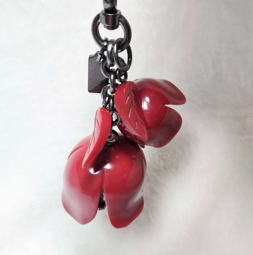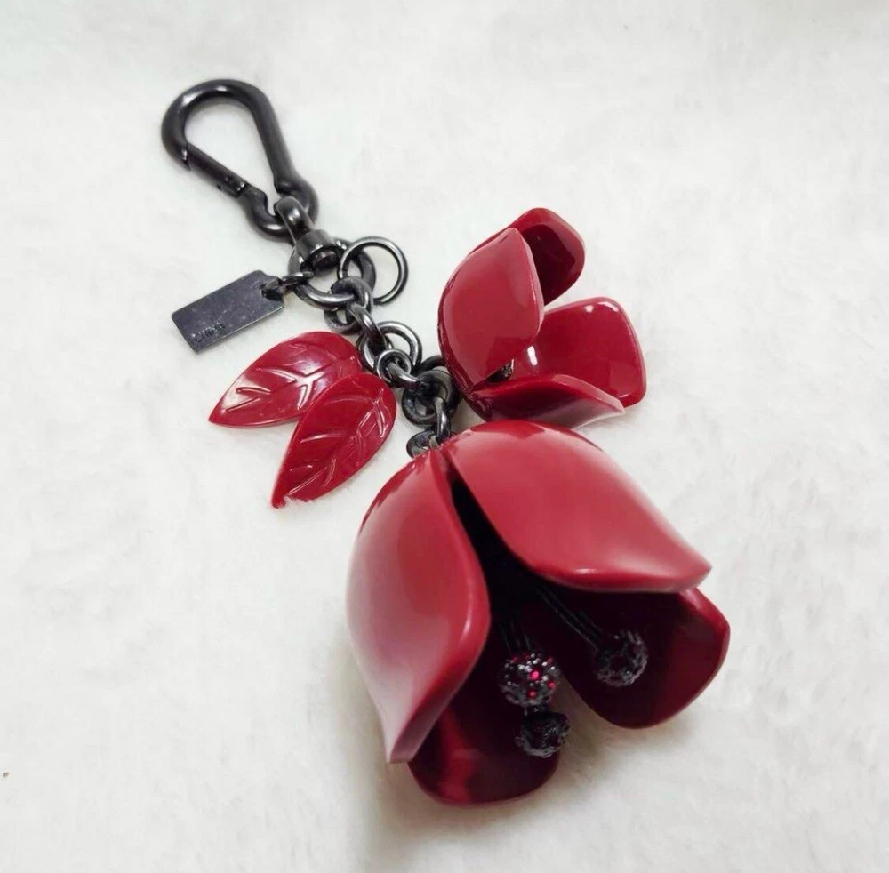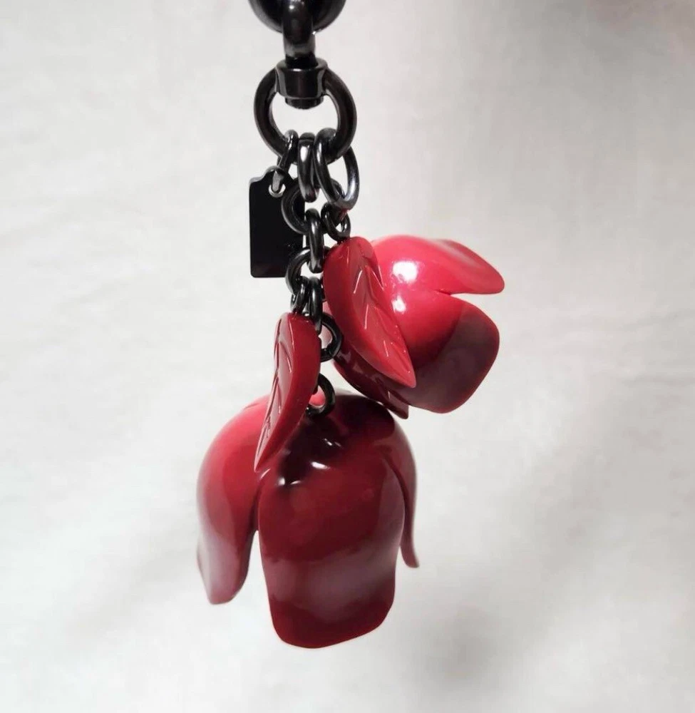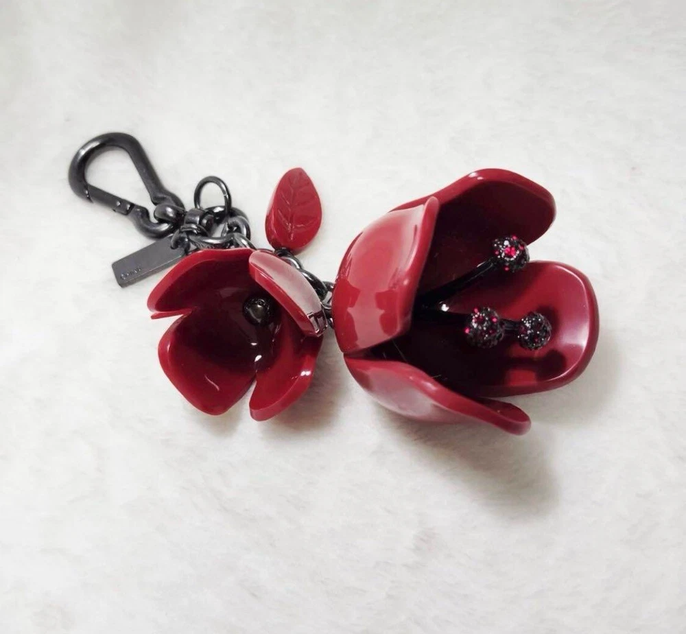 Make a statement with this large chunky flower charm. Black hardware and bright red make for a perfect color combination! Realistic inner flower parts with ruby red rhinestone accents. Preowned item has been never been used and is in great condition. Overall length: 15 cm Economy shipping: Shipped by registered airmail with tracking. Delivered by postal service.